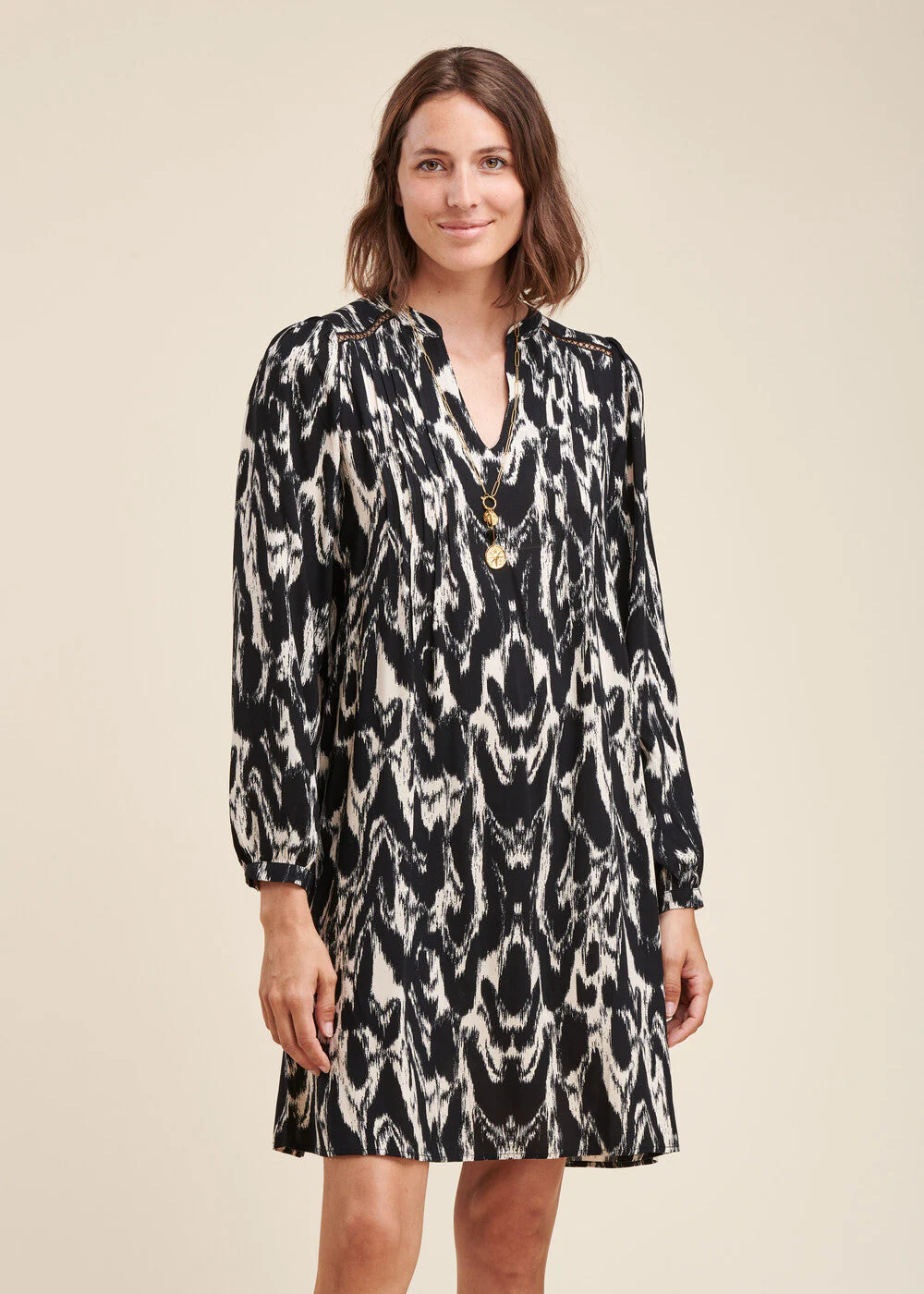 Robe courte à imprimé tachiste en viscose écoresponsable Ecovero, col mao, encolure V, manches longues bouffantes avec bracelets boutonnés, découpes épaules avec insertion de jour échelle, six petits plis sous découpes épaules, robe évasée. Longueur : 95 cm.
