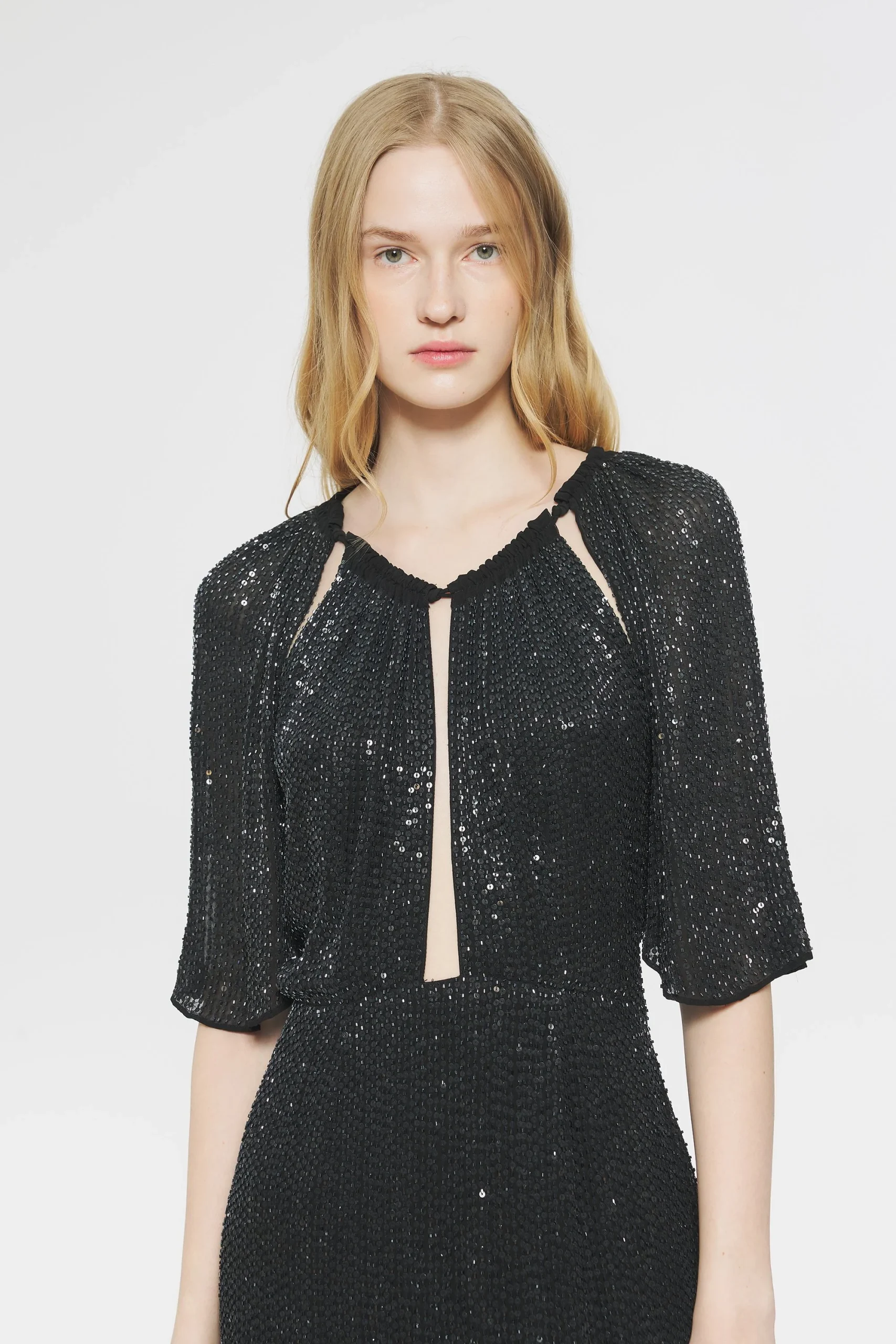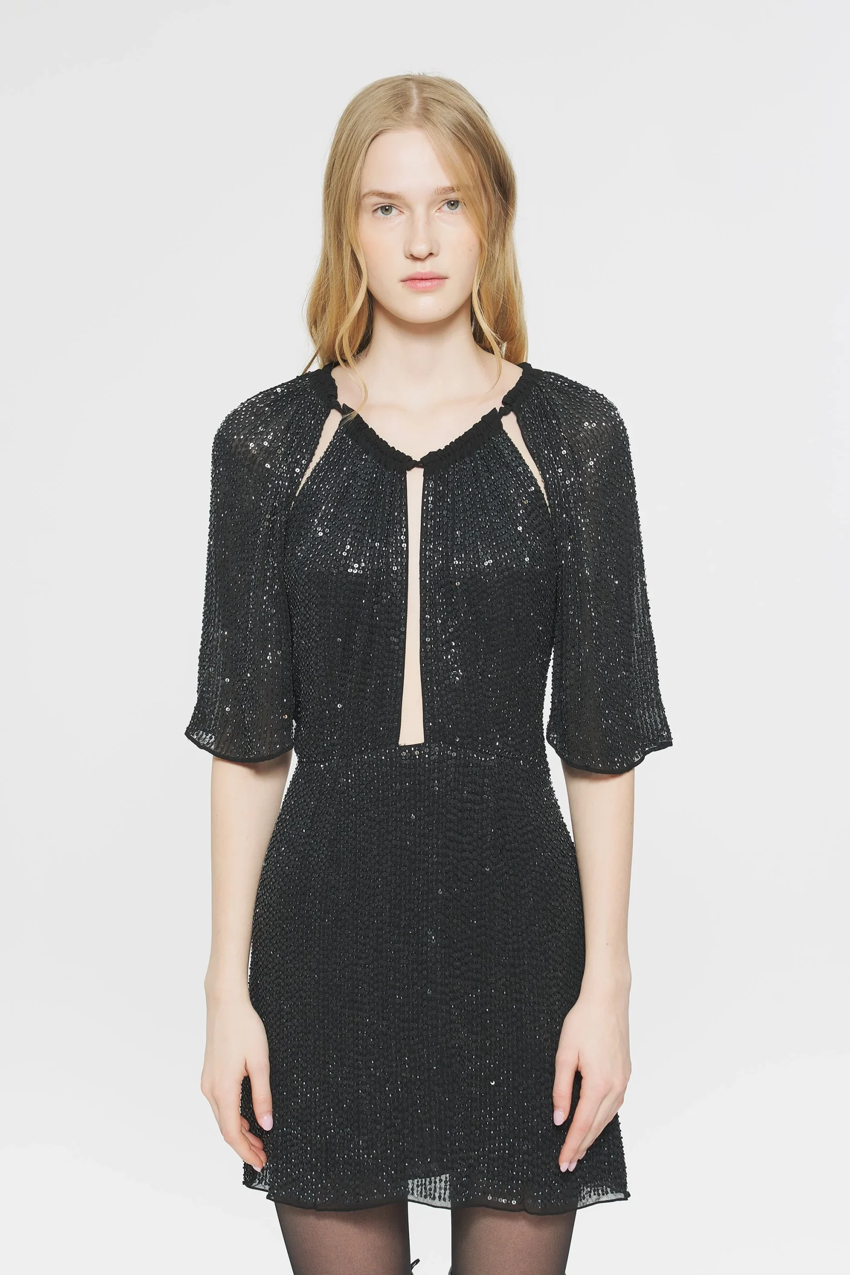 Robe courte en crêpe de viscose brodée de perles de rocaille en verre et de sequins entièrement à la main. Ouverture sur le devant et dans le dos qui se ferme avec un bouton et des liens. Manches corolles. Jupe cintrée. Fermeture zippée sur le côté. Doublure en viscose.