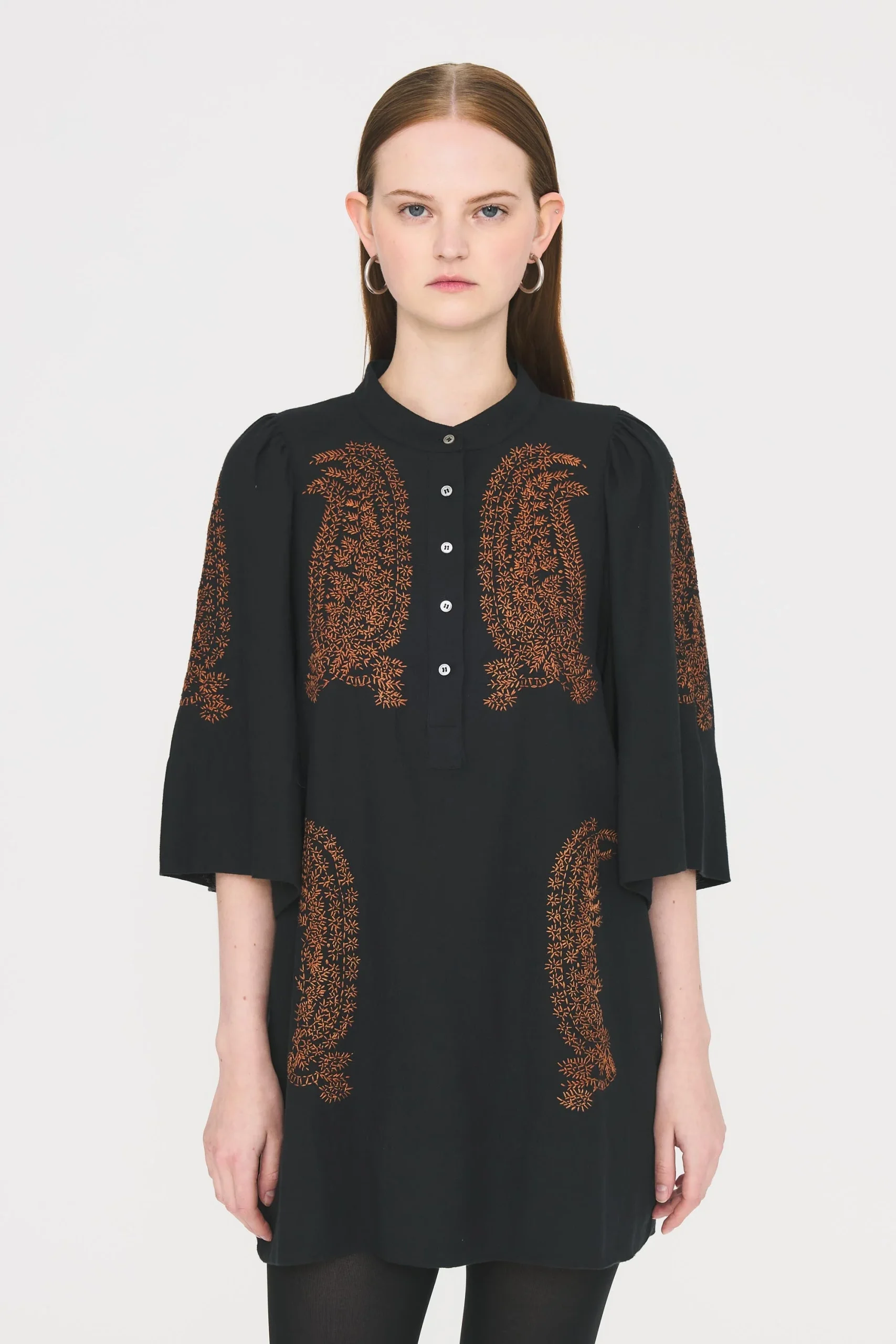 Robe courte en flanelle de coton à manches 3/4. Broderie main. Patte de boutonnage.