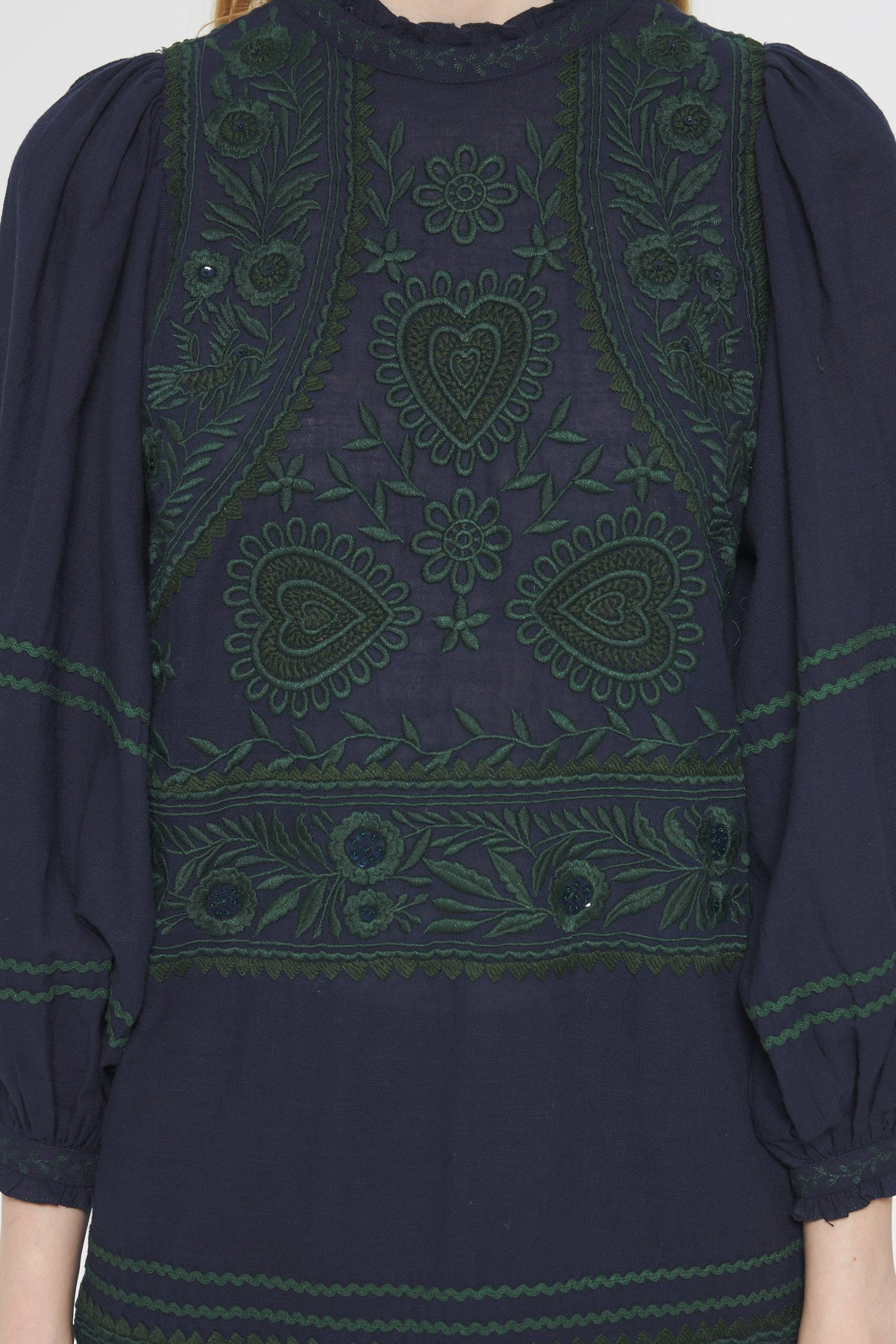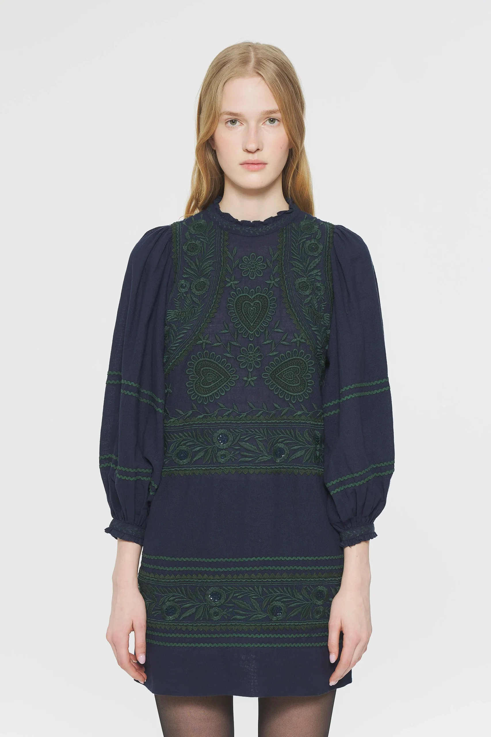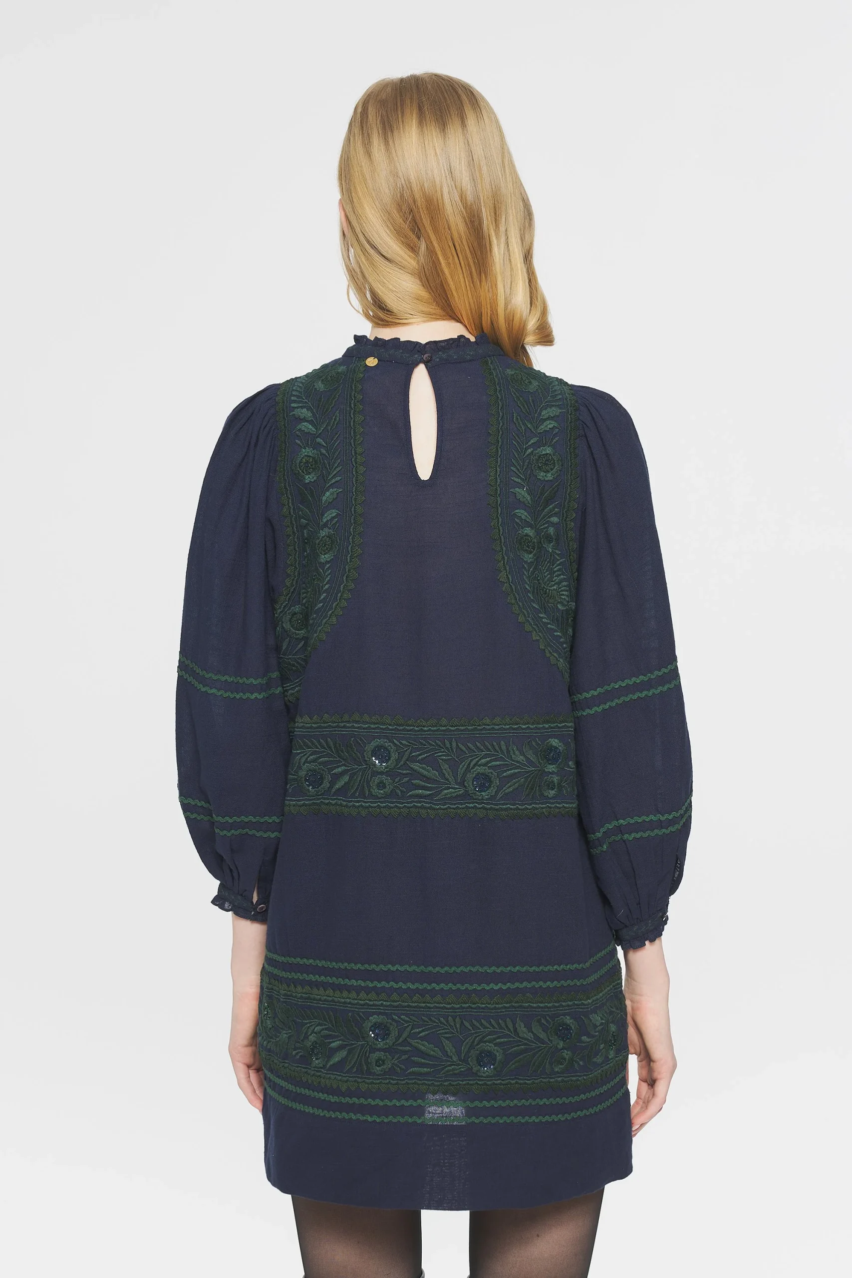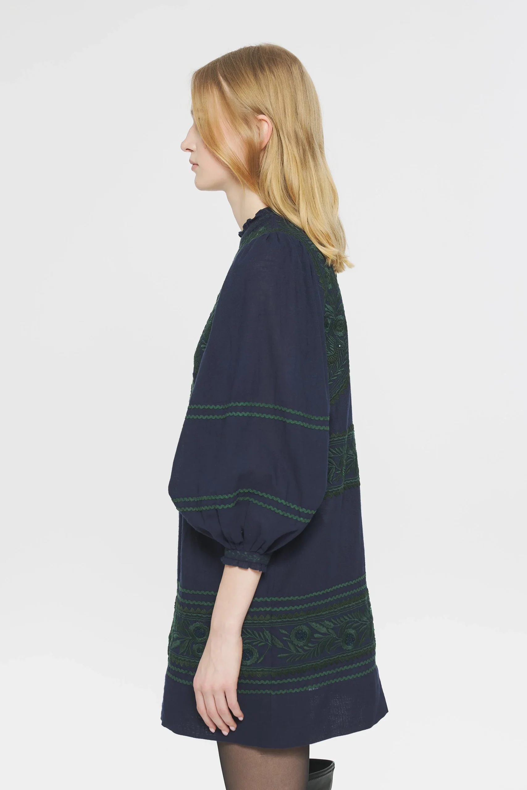 Robe brodée en crêpe de coton. Col rond volanté. Ruban brodé sur le devant, épaules, emmanchure, col et poignets. Patte de boutonnage. Bas de manche fermé par un bouton en nacre naturelle.