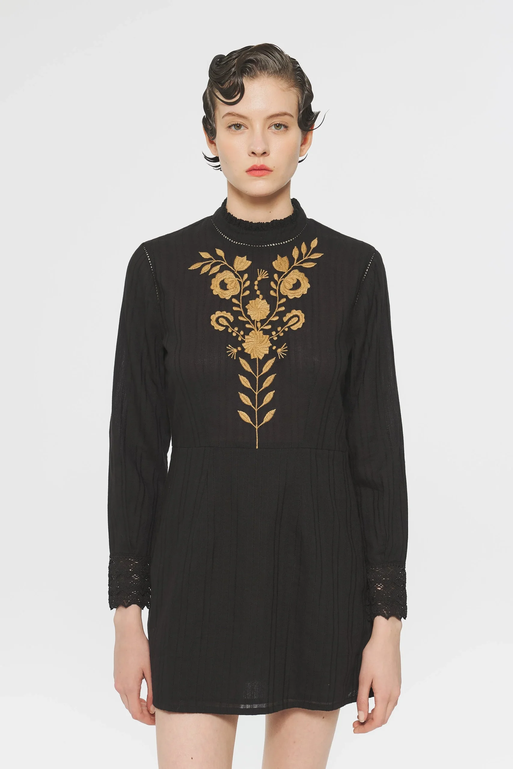 Robe brodée en crêpe de coton. Col rond volanté. Manches resserrées aux poignets par une dentelle en coton. Boutons en nacre naturelle.