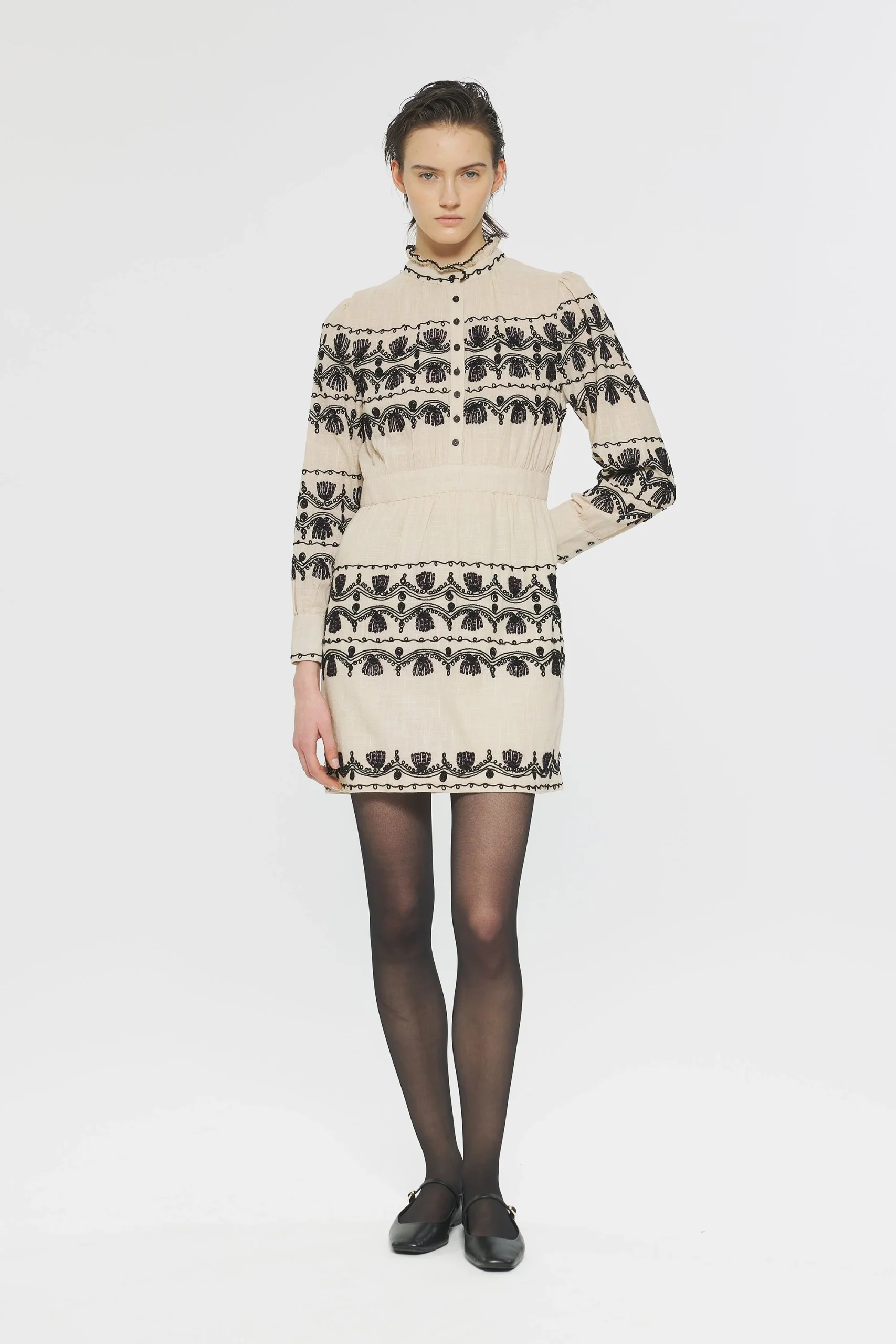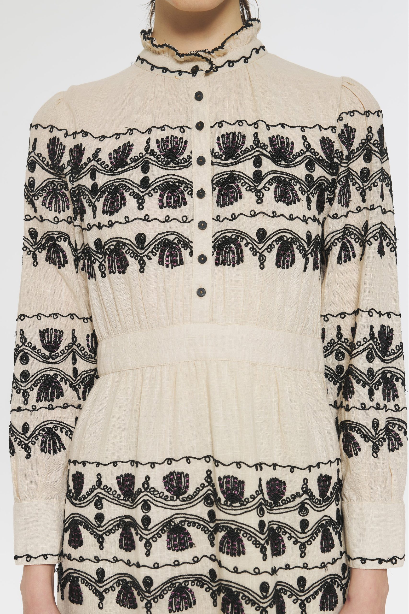 Robe courte en coton. Broderies sur le devant et les manches réalisées de manière artisanale. Patte de boutonnage sur le devant et aux poignets. Ceinture amovible. Ruban en coton brodé au col.
