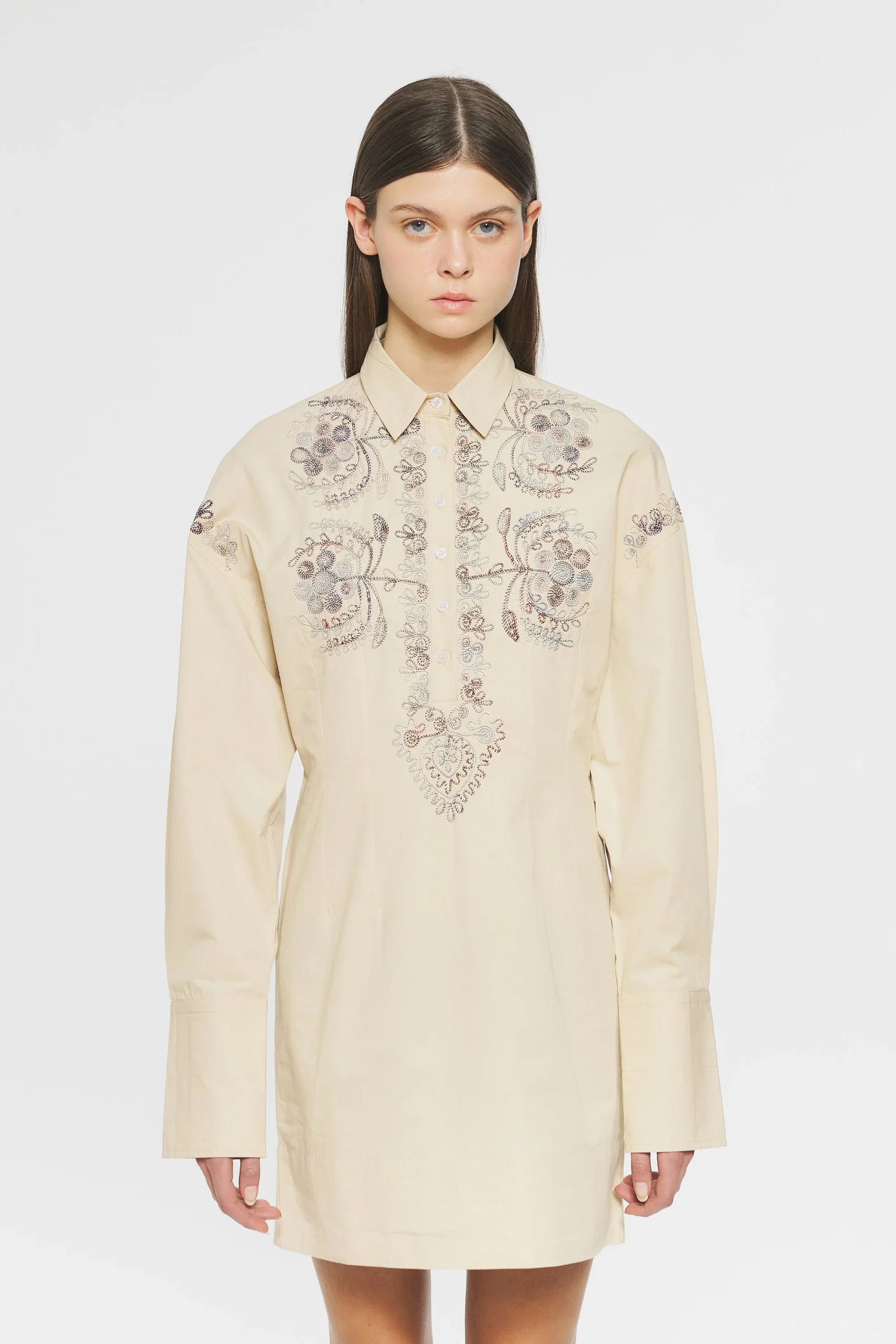 Robe courte brodée en coton. Broderies en fil tie and dye de coton cousu au niveau du plastron, des manches et du bas de la jupe. Volants au col. Manches bouffantes. Ceinture amovible. Fond de robe fourni.