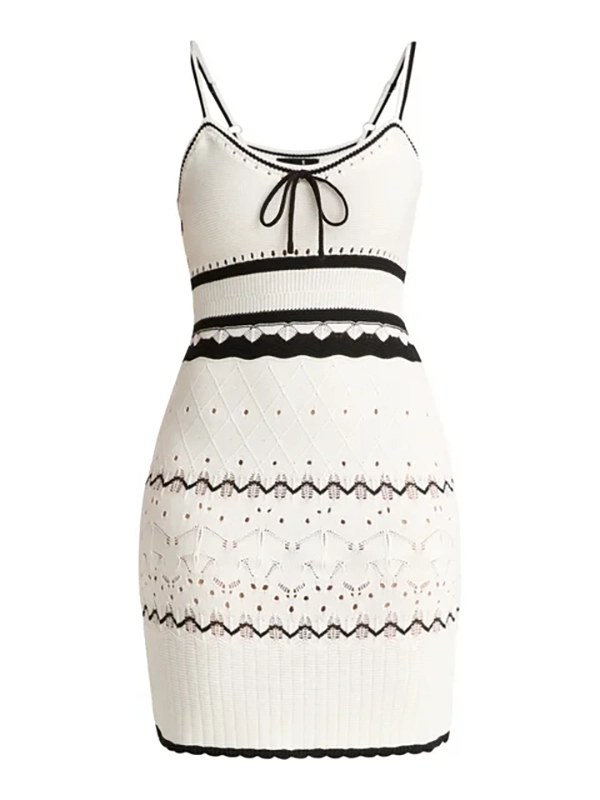Idéale pour les soirées estivales ou un cocktail en terrasse, cette robe courte est un véritable bijou de technicité et de style. Son design structuré par des contrastes noirs et blancs et la richesse de ses mailles en font une pièce qui attire l’œil et se démarque par son originalité.