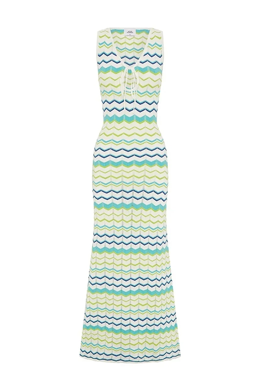 Laissez-vous séduire par le charme intemporel du crochet. Cette robe longue se distingue par ses rayures chevron graphiques, dans un superbe dégradé de bleus et de verts inspiré d’un lagon. Sa coupe épurée suit les formes avec une aisance naturelle, tandis que son décolleté en V ajustable par un lien ajoute une touche féminine. Confectionnée dans une maille douce et respirante, c’est la robe de vacances idéale.