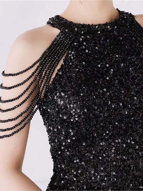 Préparez-vous à rayonner de glamour divin ces fêtes de fin d’année avec la ravissante robe de soirée courte noire sequins col licou. Présentée en sequins noirs de première qualité, un col licou qui s’attache dans le dos et des manches en perles, cette robe deviendra sûrement une pièce de choix de votre garde-robe d’occasions spéciales.