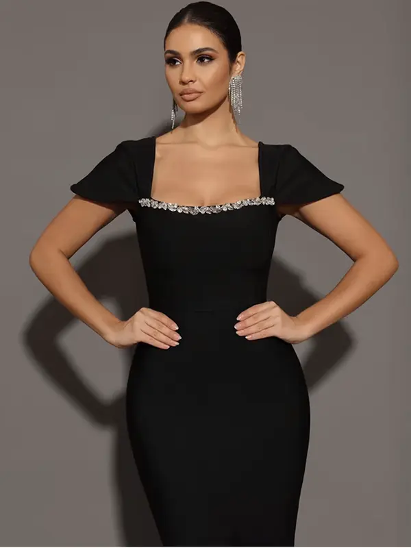 Optez pour un style chic et intemporel avec cette robe de soirée longue noire en bandage, conçue pour sculpter et sublimer vos courbes. Son col carré raffiné ajoute une touche de modernité, tandis que le liseré de perles en forme de feuilles apporte une élégance discrète mais sophistiquée.