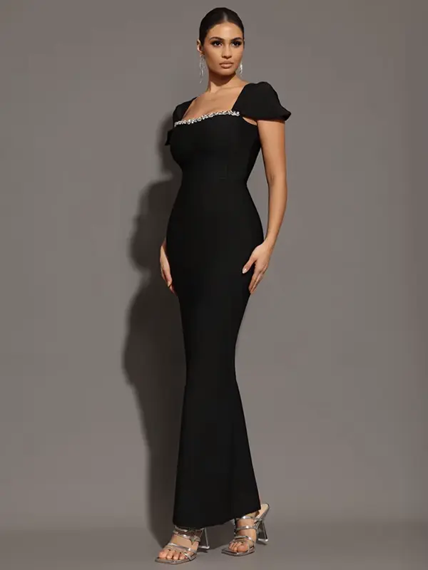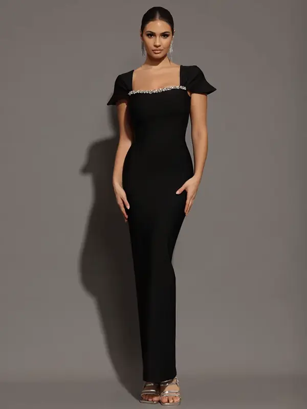 Robe de Soirée Longue Bandage Noire Col Carré