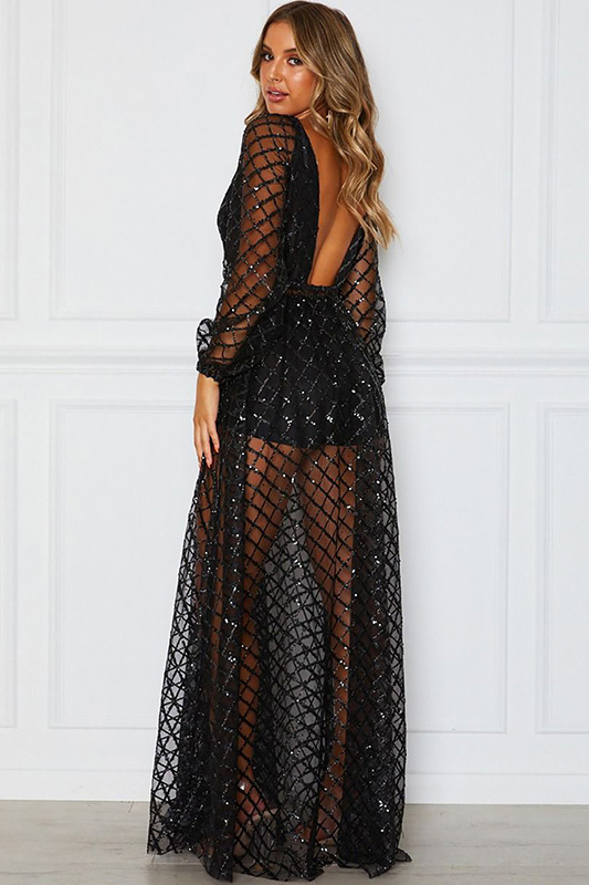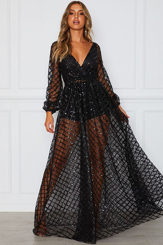 Optez pour un look hyper féminin dans cette robe de soirée longue transparente noire !