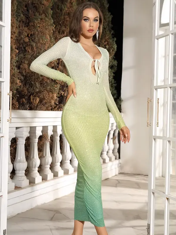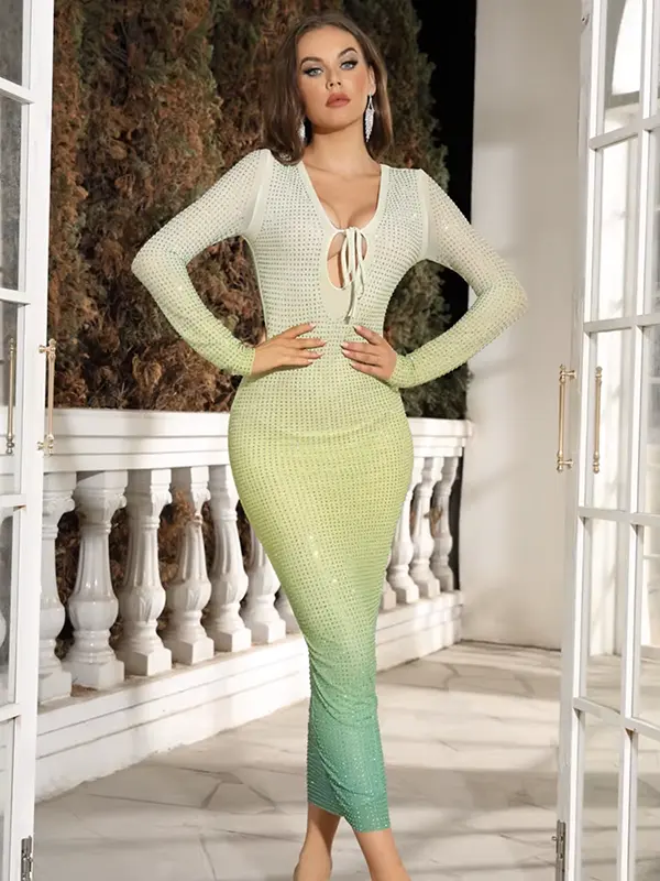 • Détails : Col V avec lien, Strass, Dégradé de couleurs, manches longues, coupe près du corps et longueur midi