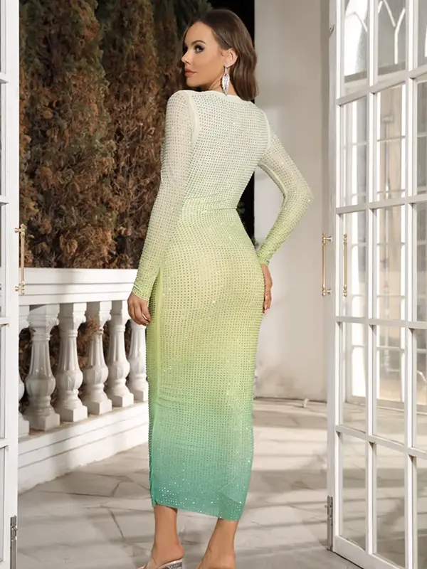 Robe de Soirée Longue Verte Dégradée et Strass