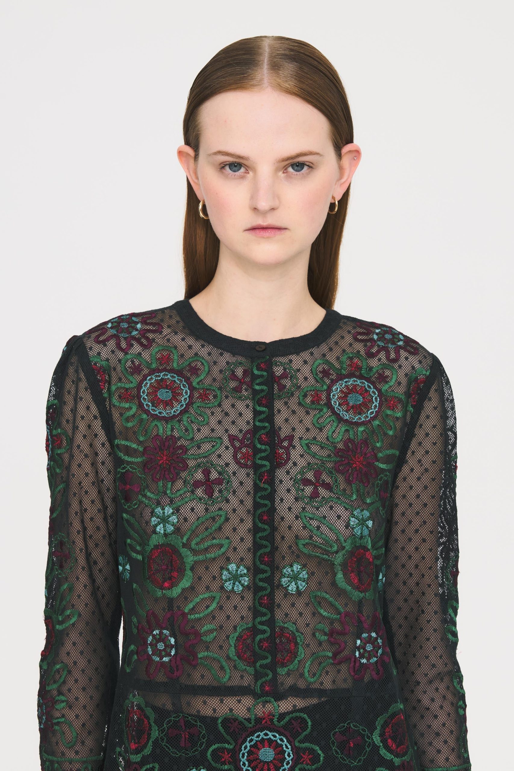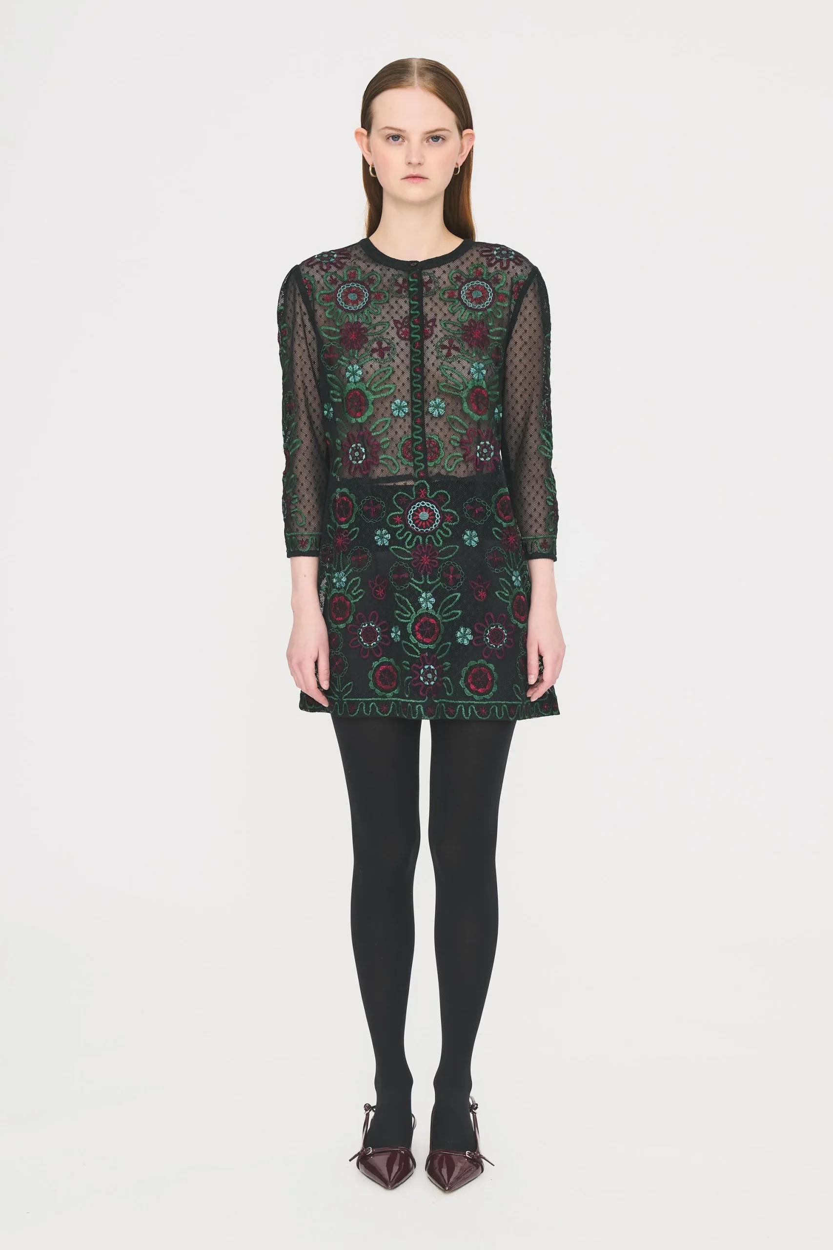 Robe courte en résille de coton. Résille avec dessin plumetis. Broderies florales et bicolores. Poignets et col cousus en corolle. Fils satinés. Osez la transparence – ou non – grâce au fond de robe fournie avec la pièce.