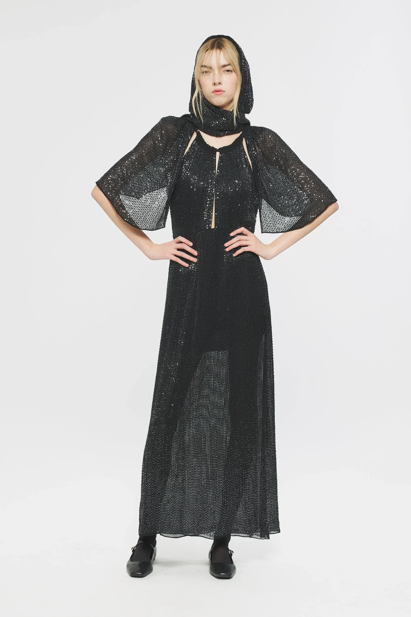 Robe longue en crêpe de viscose brodée de perles de rocaille en verre et de sequins entièrement à la main. Ouverture sur le devant et dans le dos. Fermeture zippée sur le côté. Doublure en viscose.