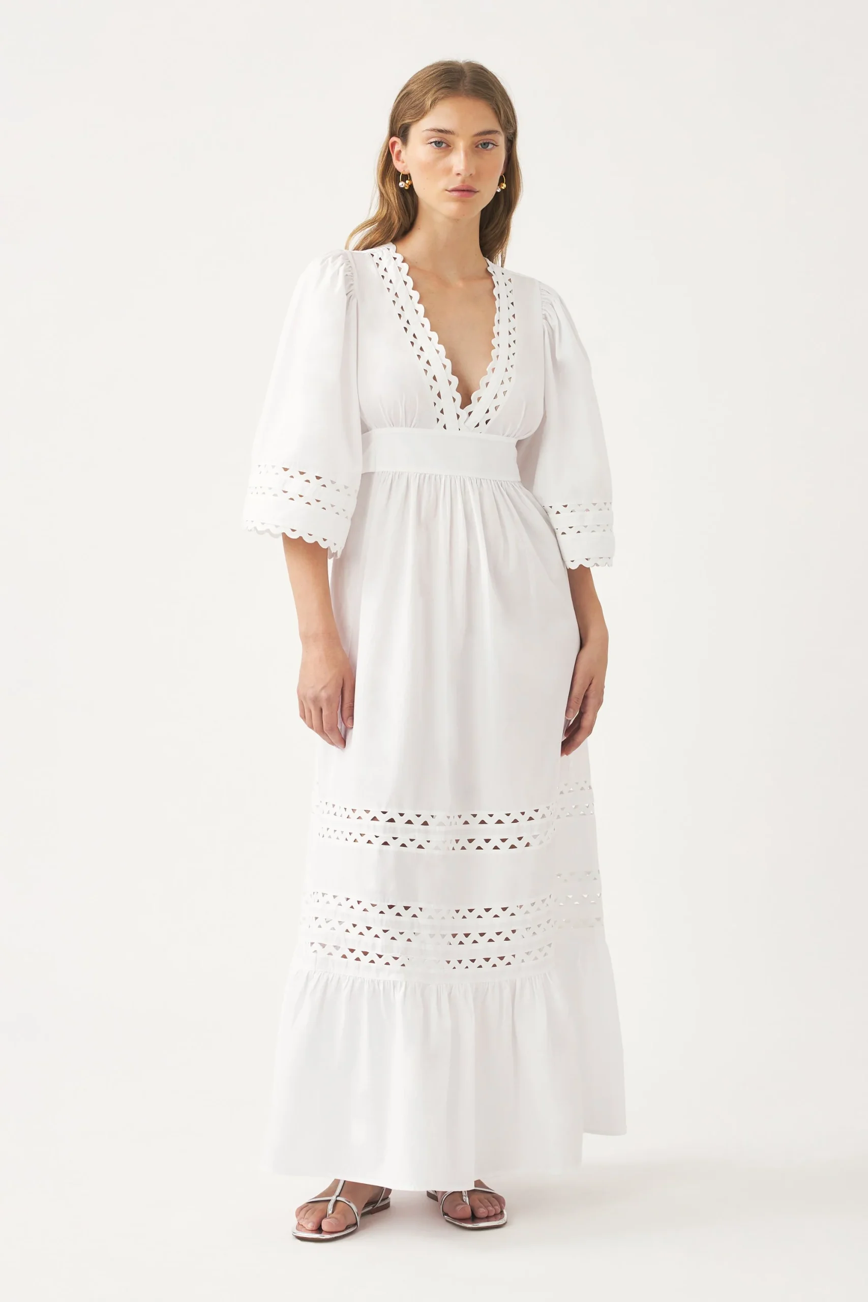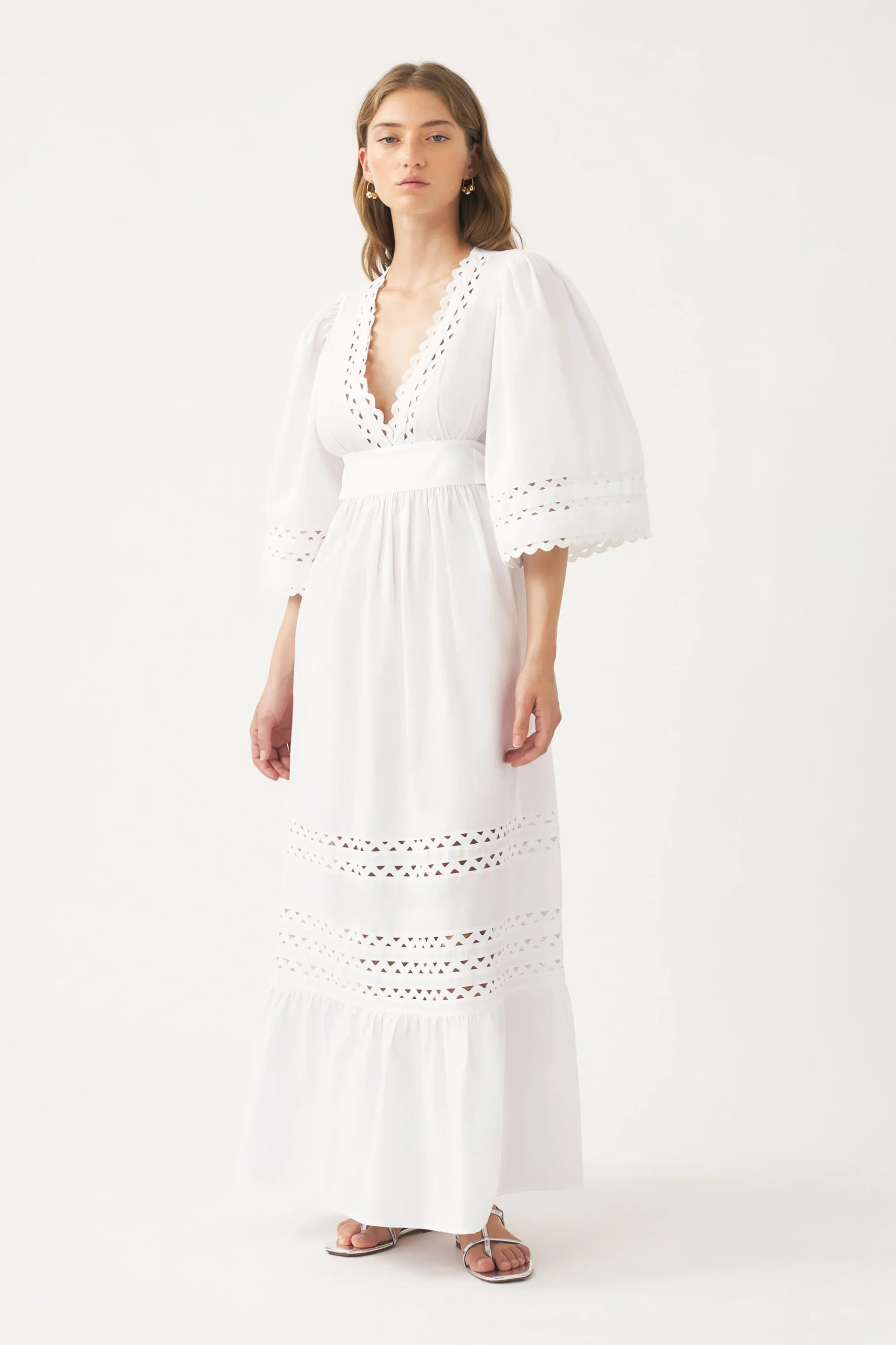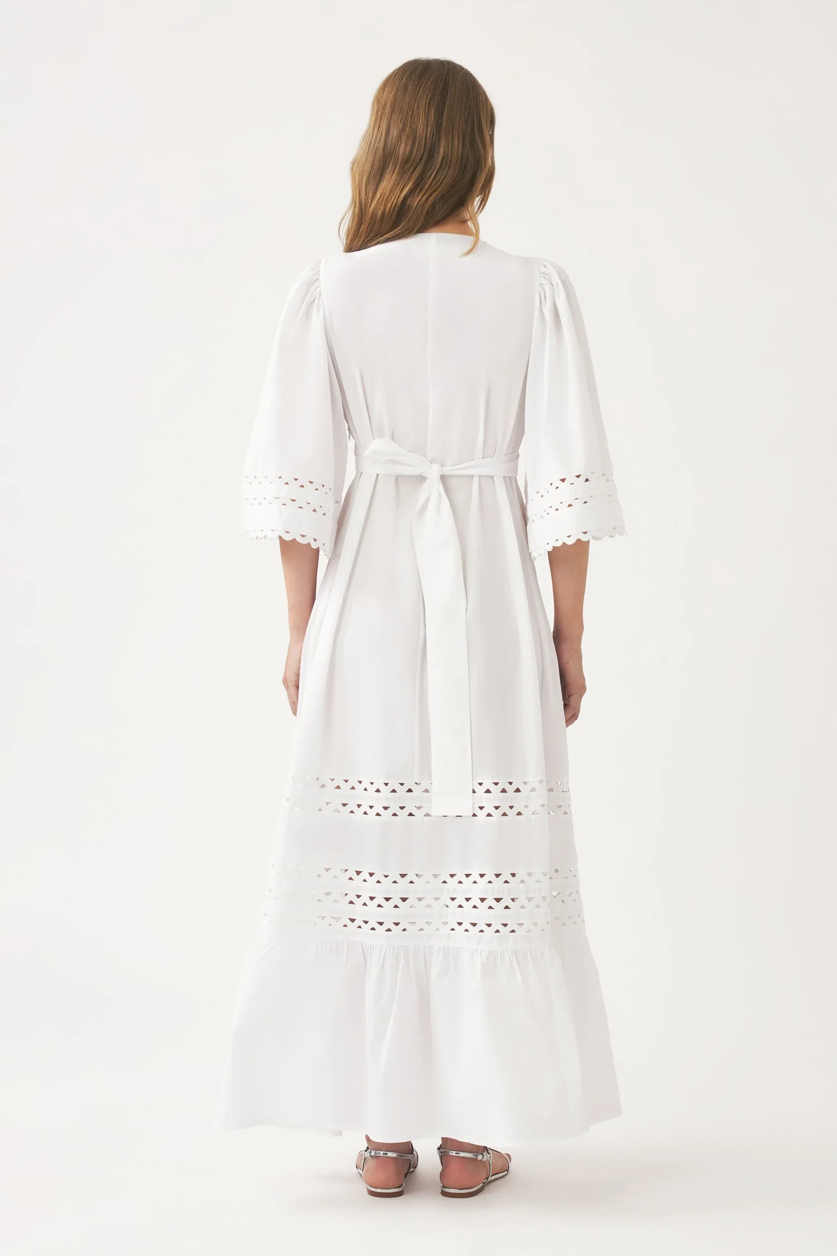 Robe longue en popeline de coton. Rubans festonnés insérés à la poitrine, aux manches et à la jupe. Encolure en V. Découpe à la taille. Ceinture cousue non amovible à nouer dans le dos. Fronces aux épaules. Volant au bas de la jupe.