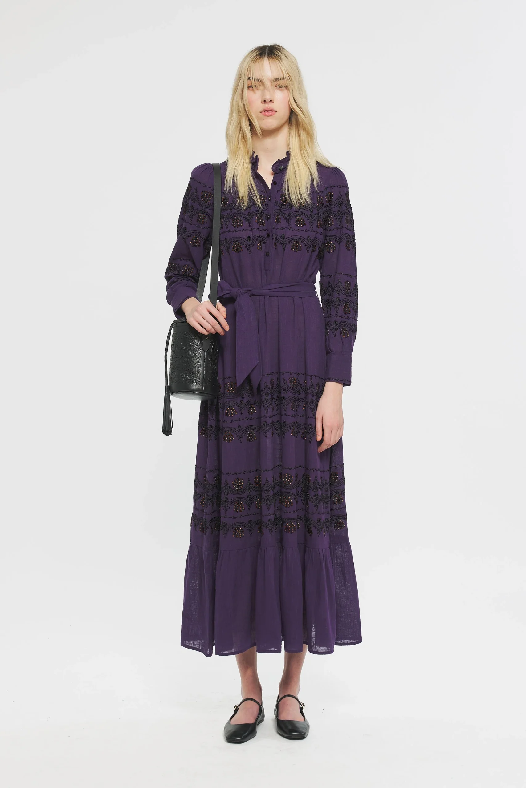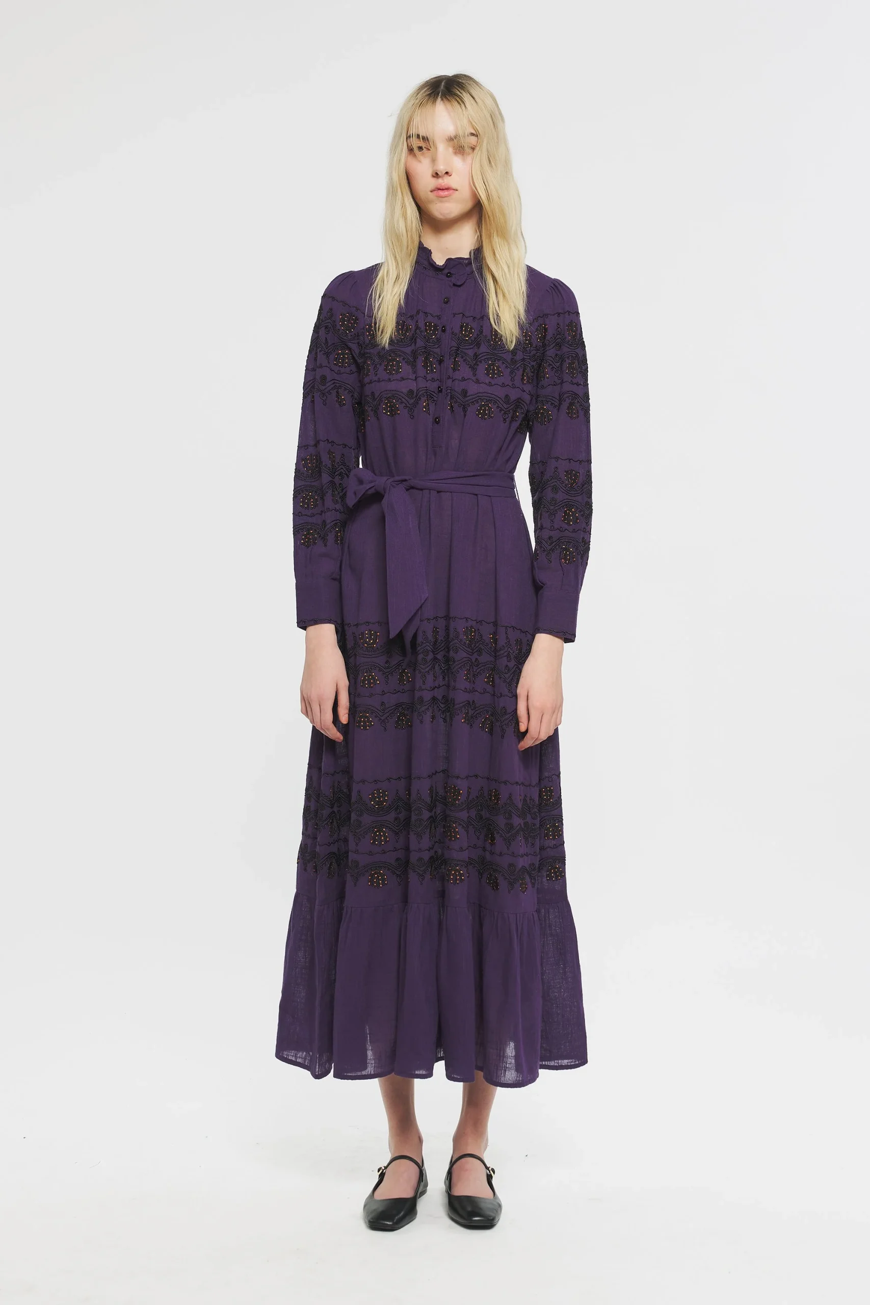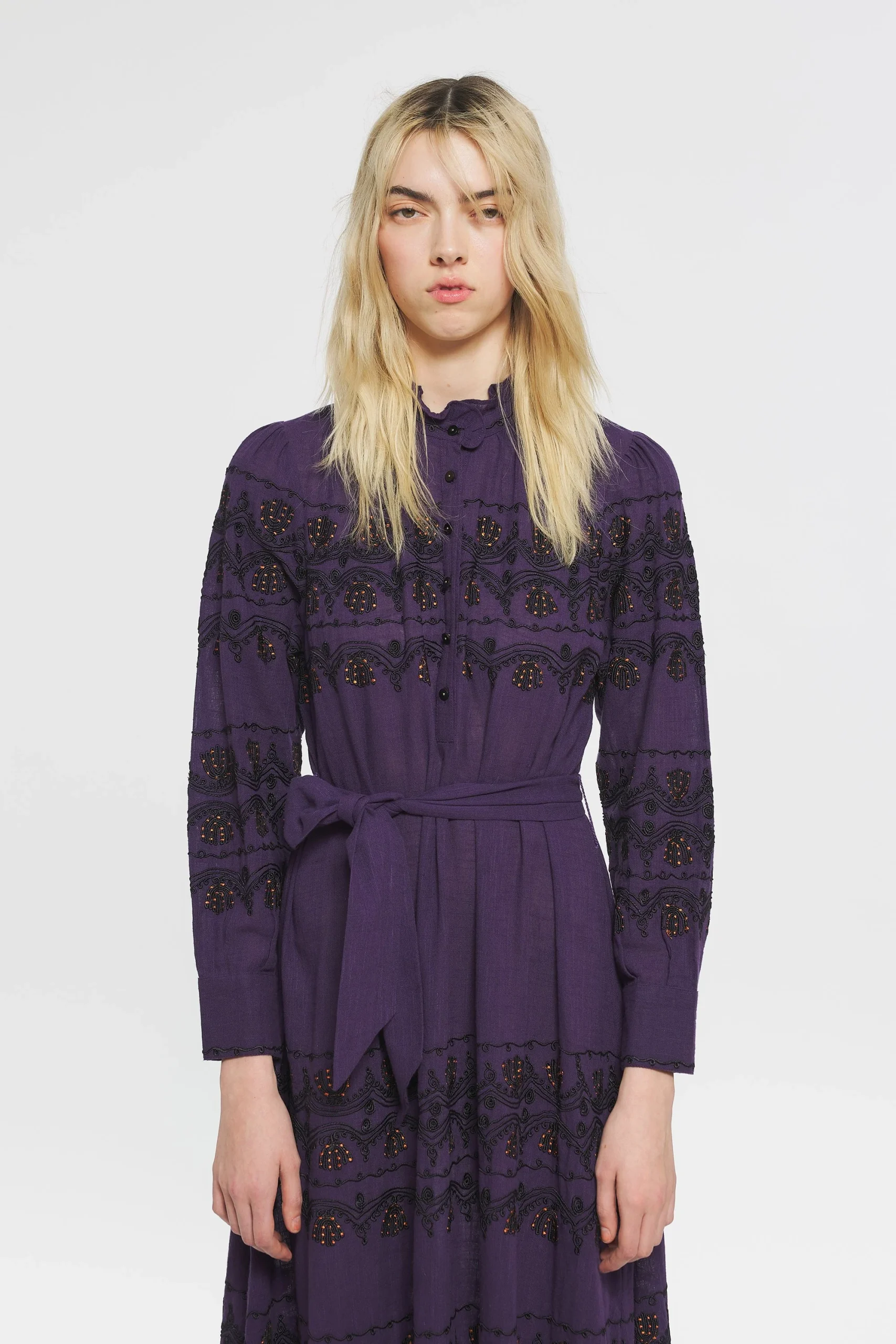 Robe longue en coton. Broderies sur le devant et les manches réalisées de manière artisanale. Patte de boutonnage sur le devant et aux poignets. Ceinture amovible. Ruban en coton brodé au col.