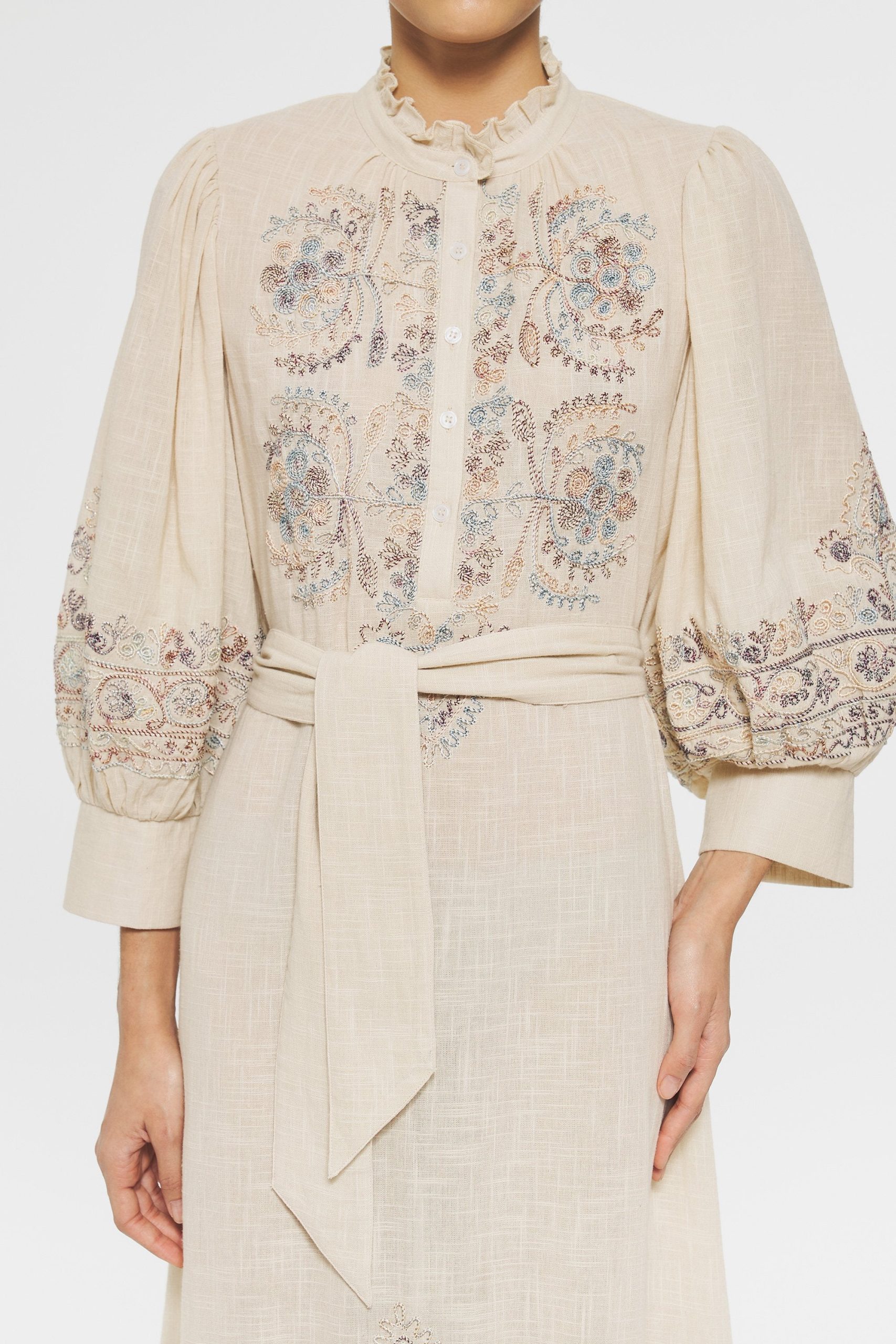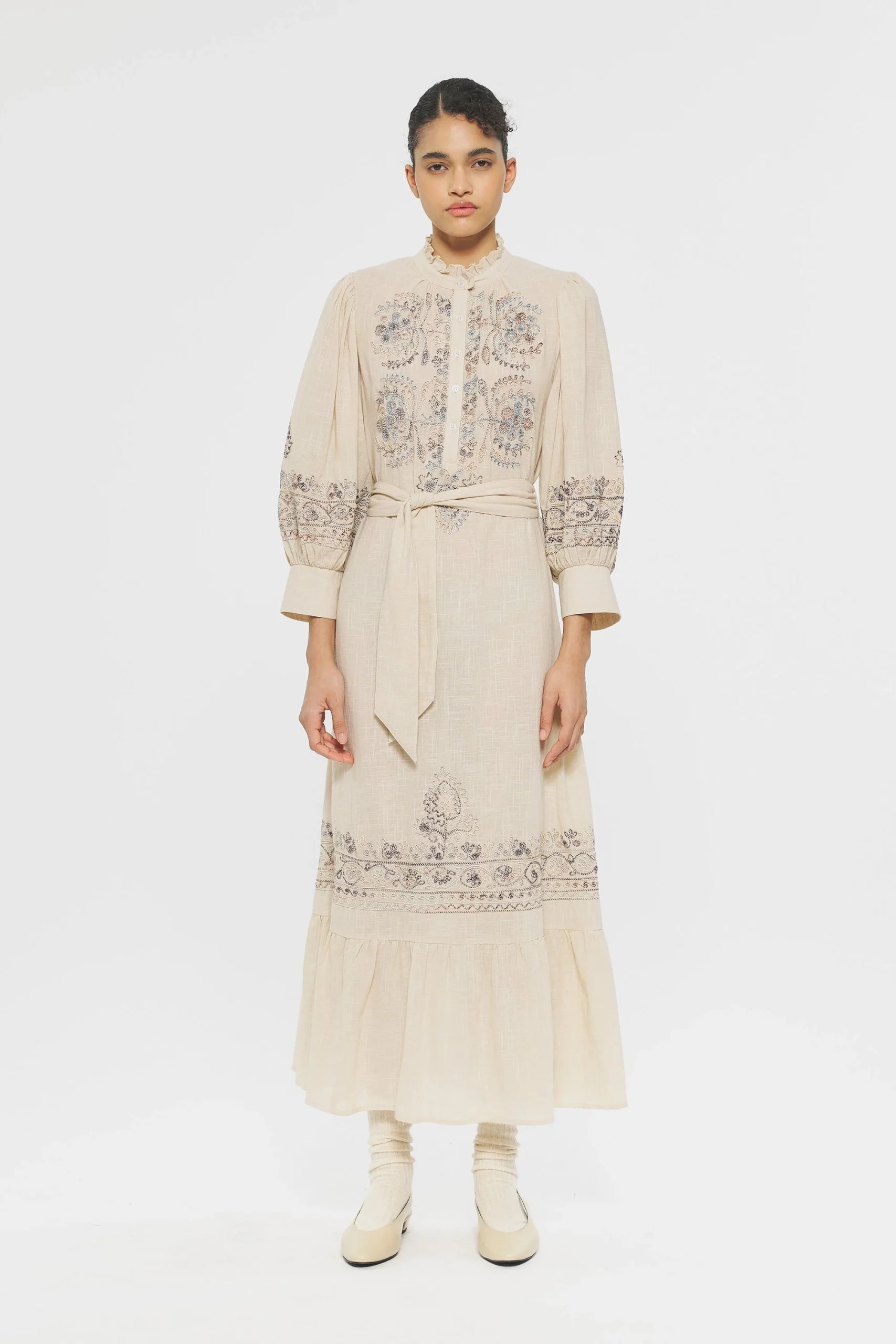 Robe longue brodée en coton. Broderies en fil tie and dye de coton cousu au niveau du plastron, des manches et du bas de la jupe. Volants au col. Manches bouffantes. Ceinture amovible. Fond de robe fourni.