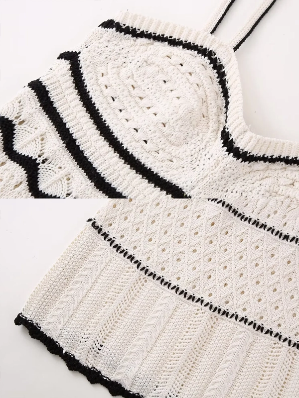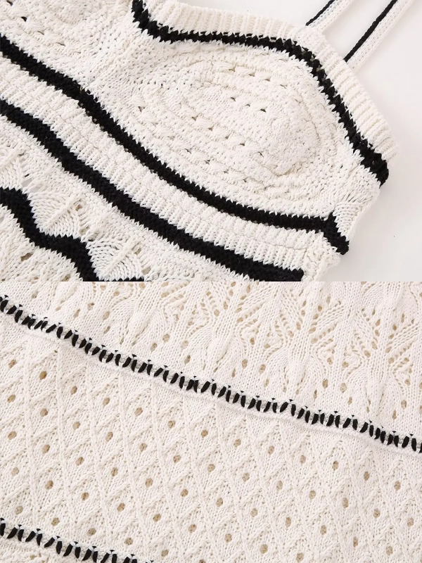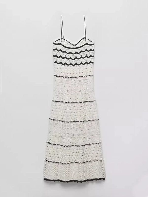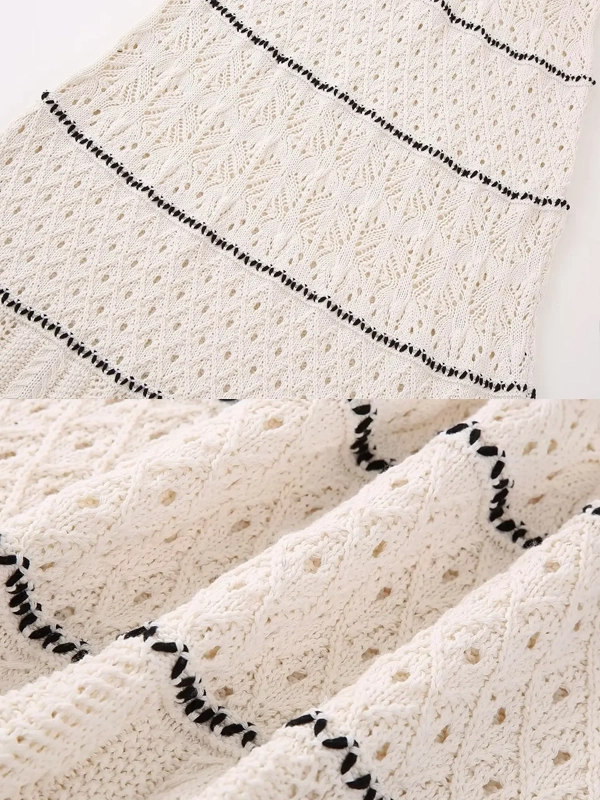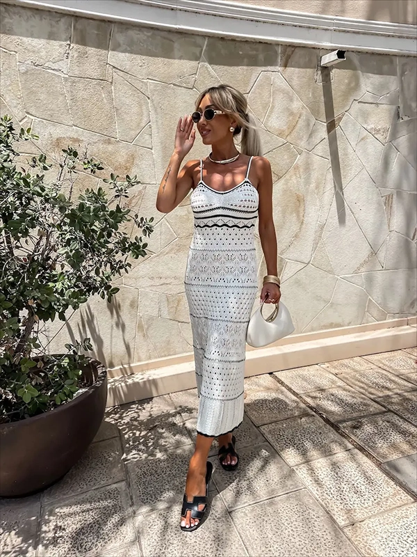 Robe Longue Crochet Blanche et Lignes Noires : Une Silhouette Raffinée pour un Été Élégant