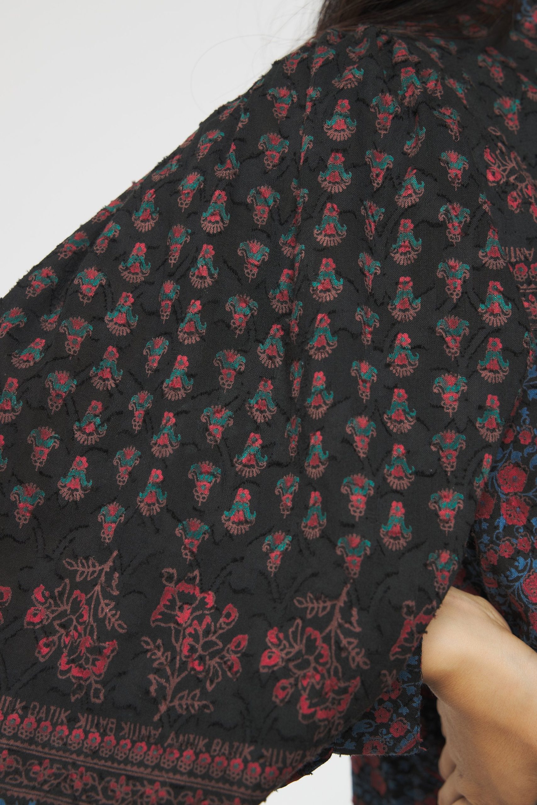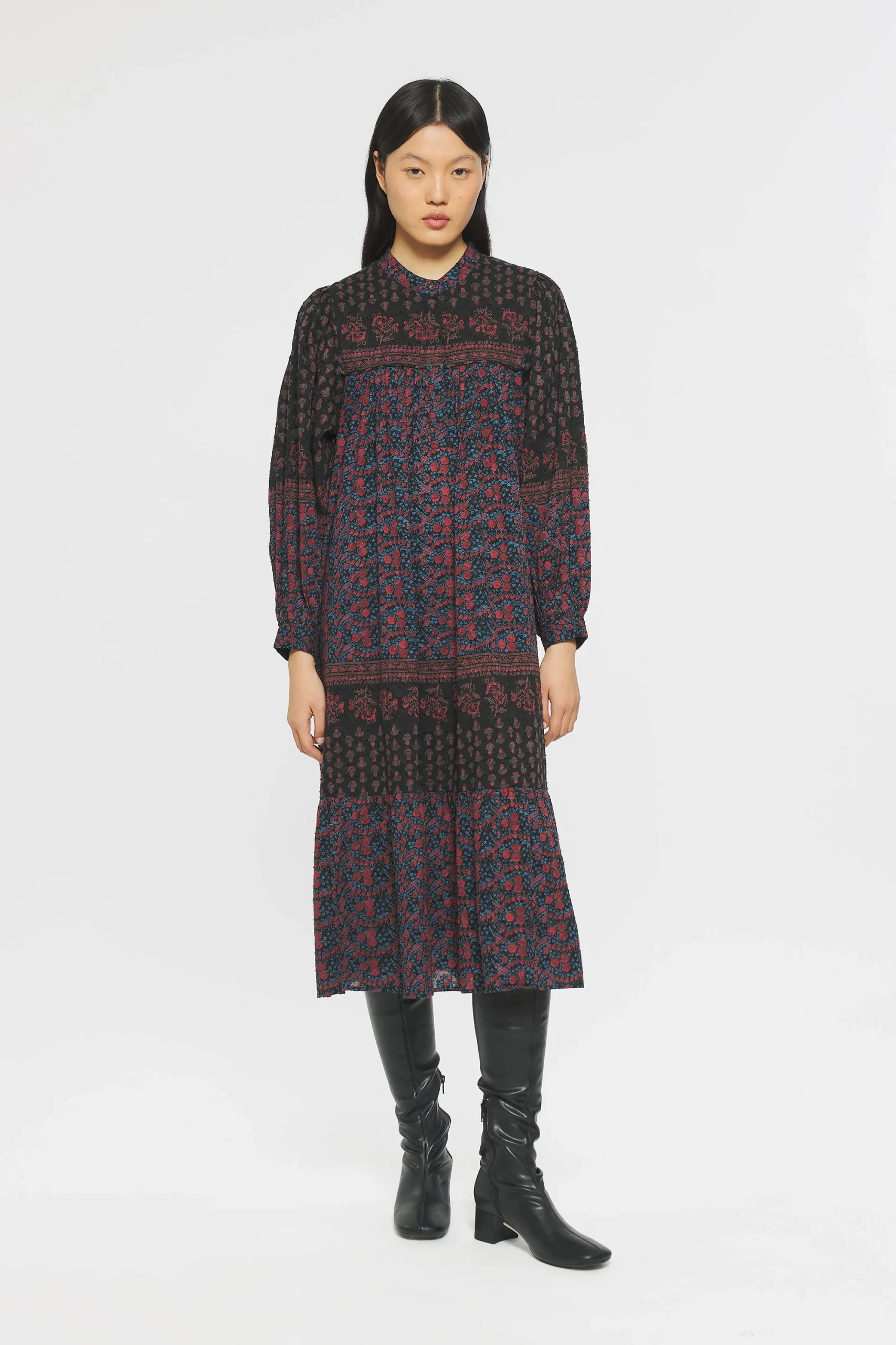 Robe longue en jacquard de coton imprimé. Col rond. Robe fermée sur le devant et aux poignets par un bouton de nacre.
