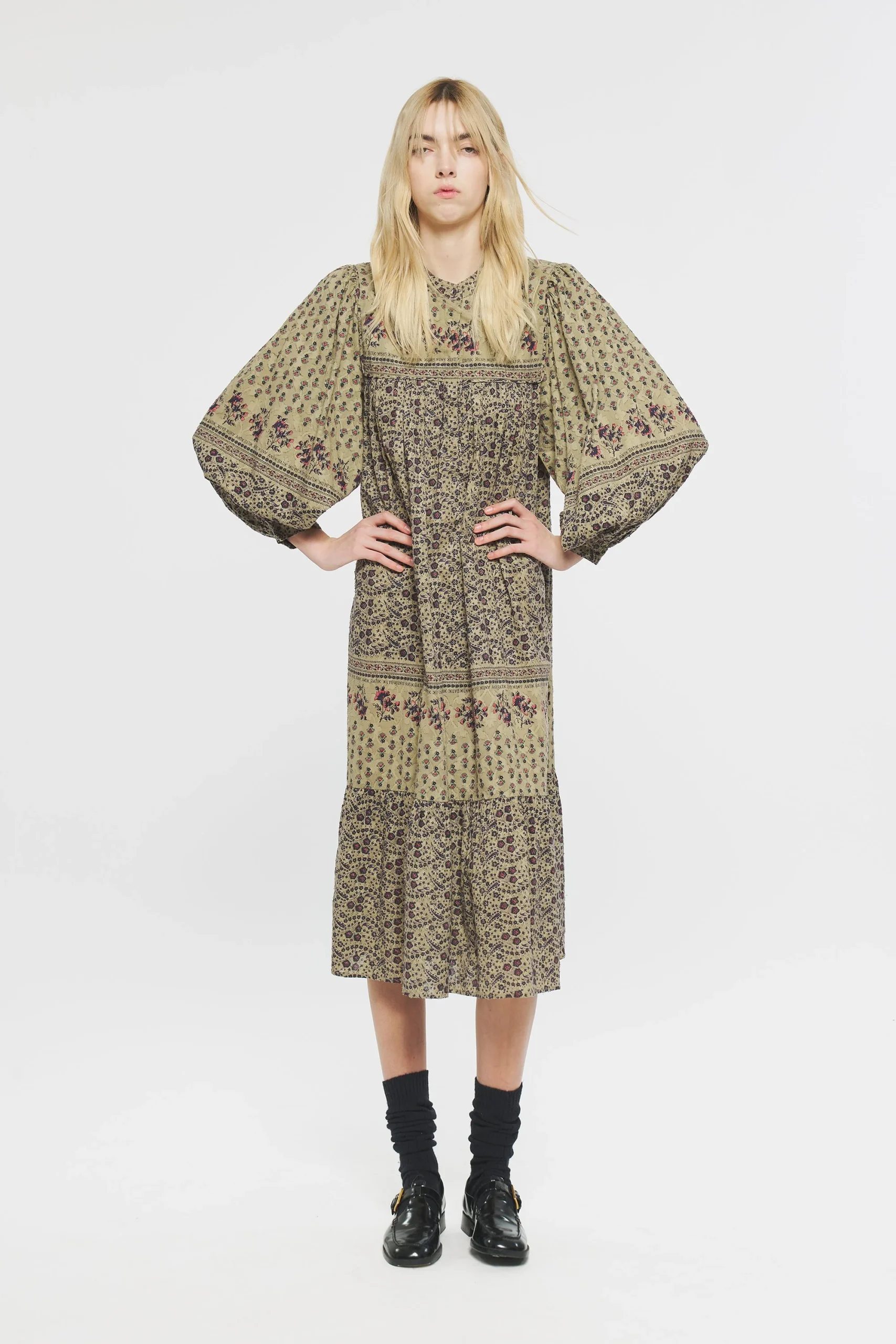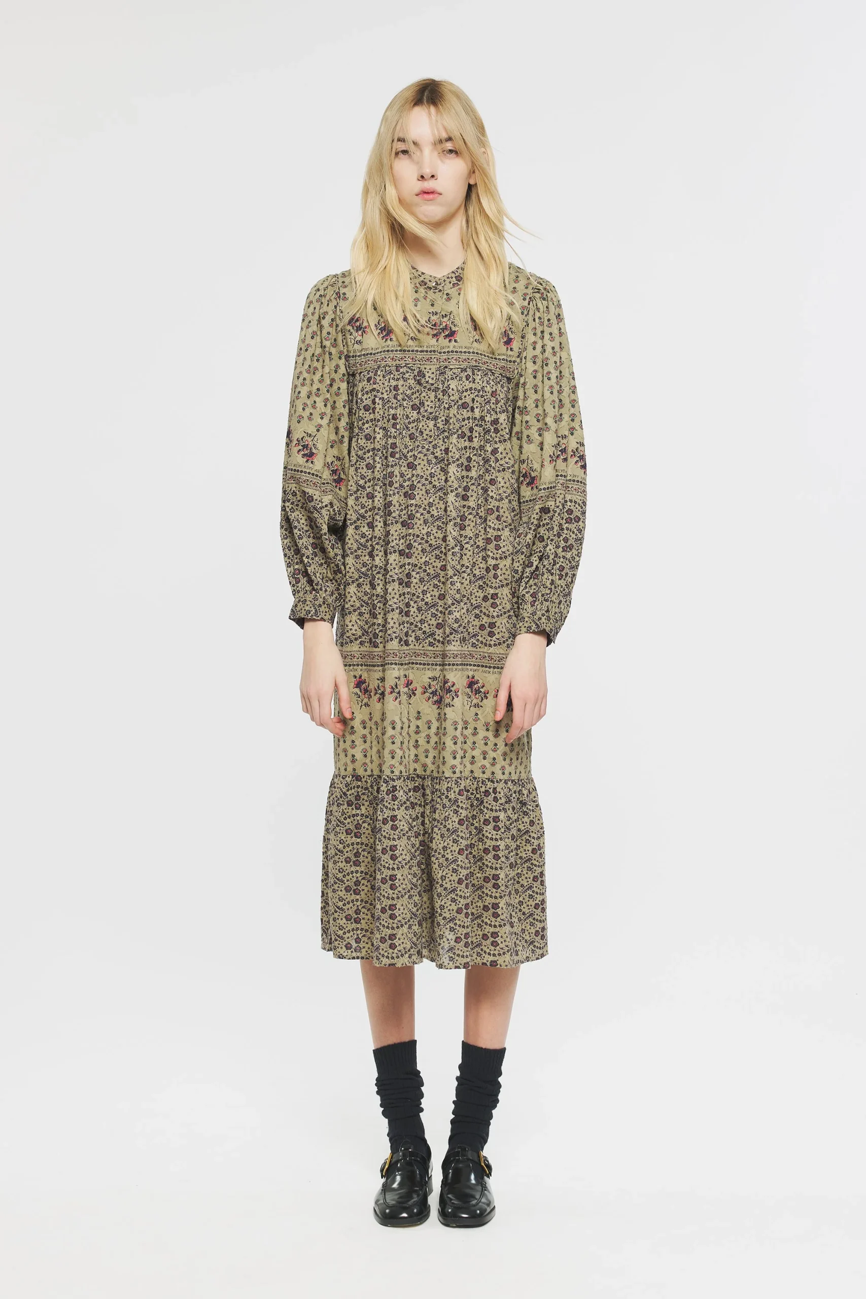 Robe longue en jacquard de coton imprimé. Col rond. Robe fermée sur le devant et aux poignets par un bouton de nacre.