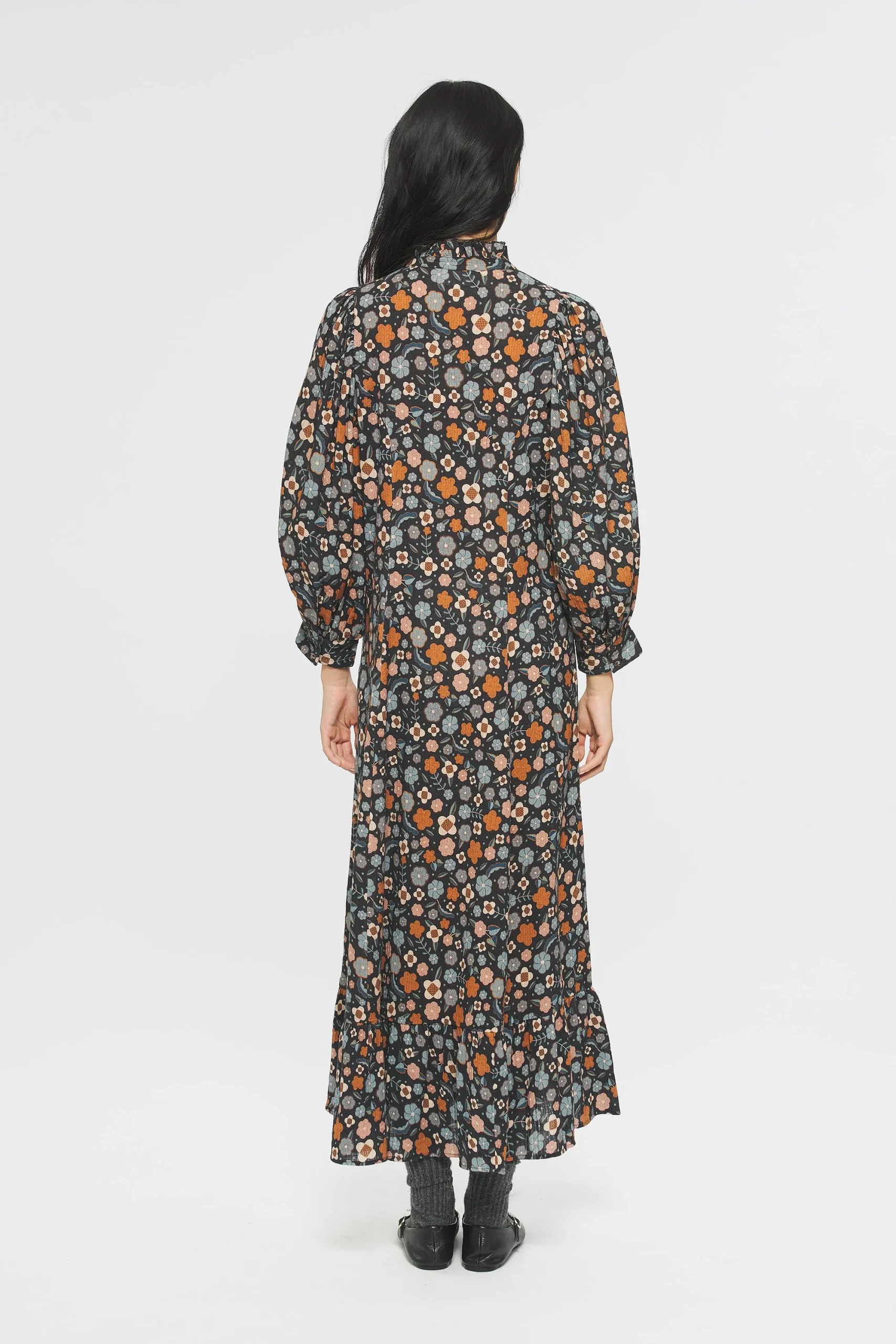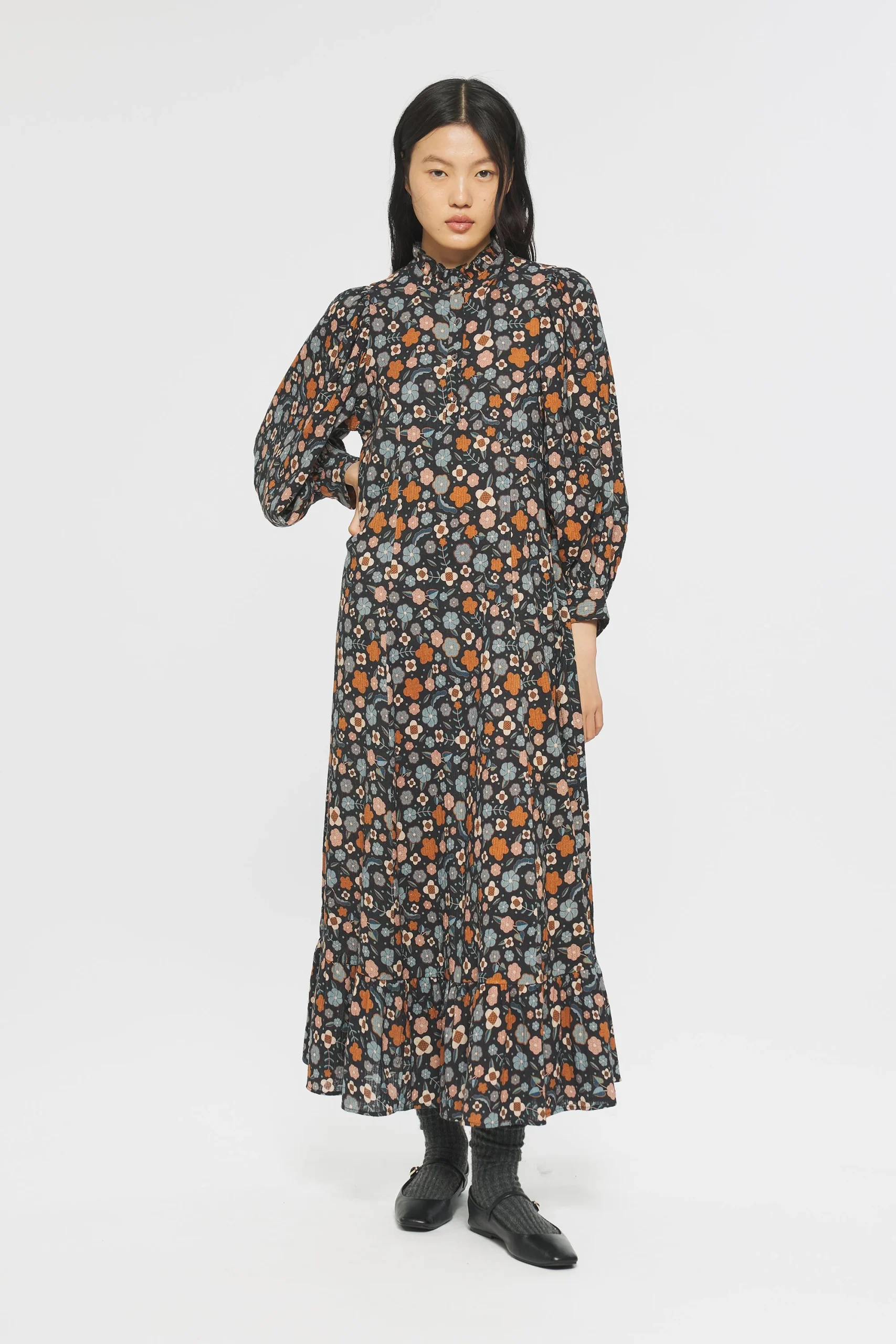 Robe longue en coton imprimée avec effet nervuré. Poignets fermés par des boutons de nacre.