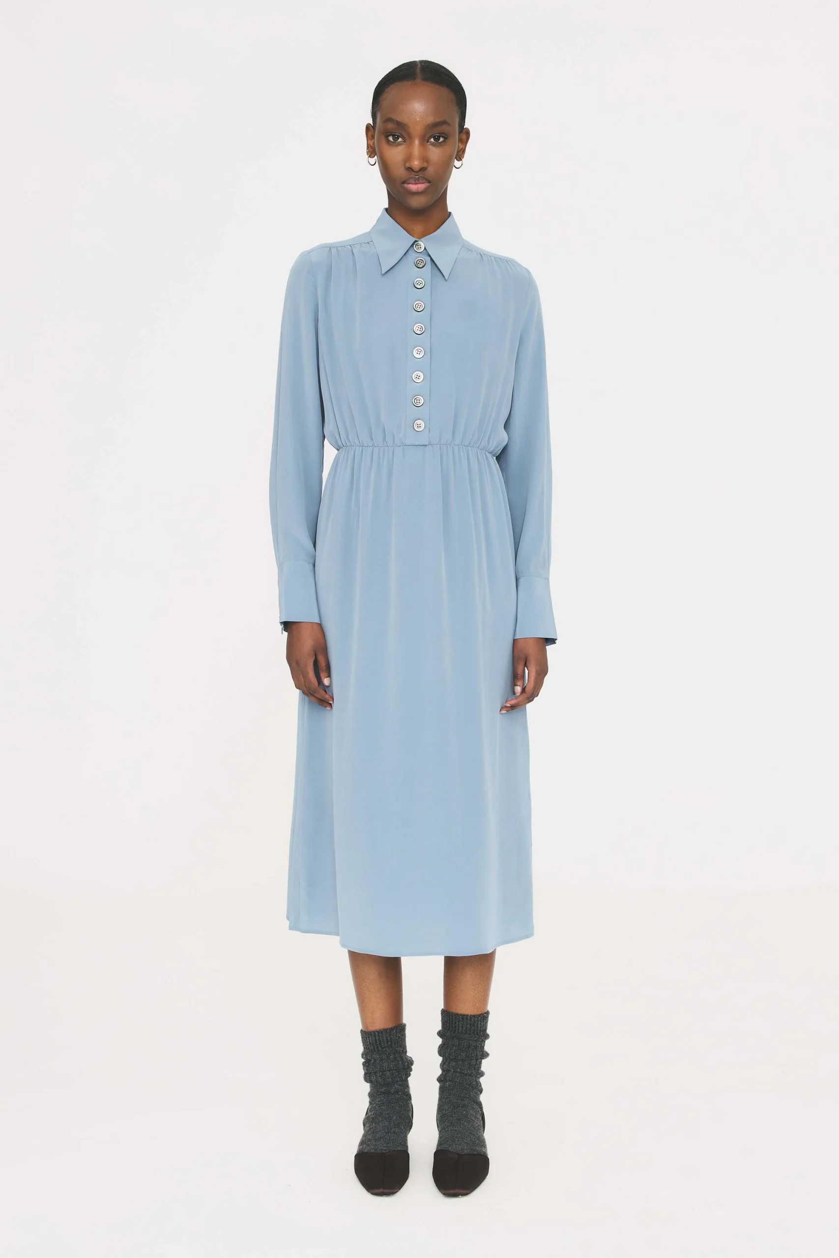 Robe longue en soie lavée. Col chemise. Manches longues. Fermeture à boutons en nacre. Fermeture zip sur le côté. Osez la transparence – ou non – grâce au fond de robe fournie avec la pièce.