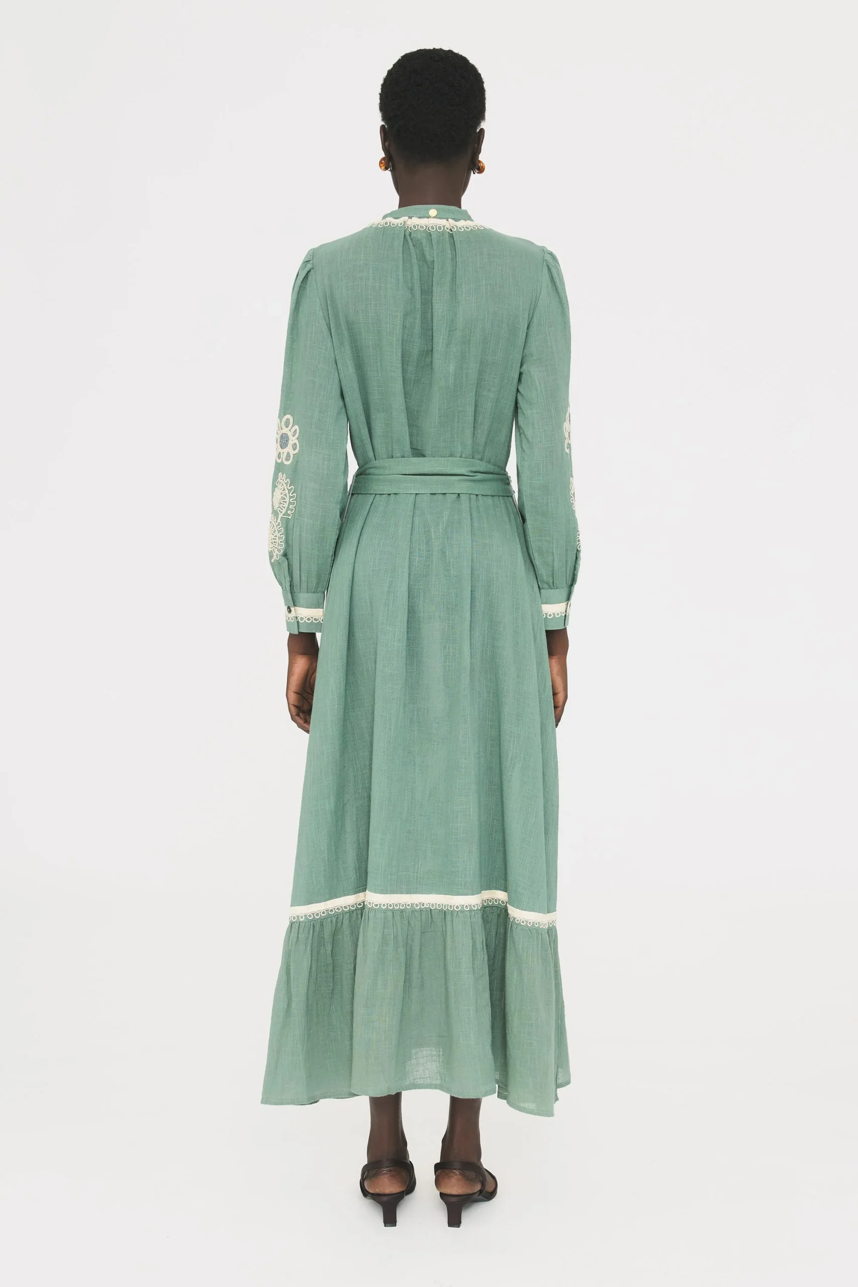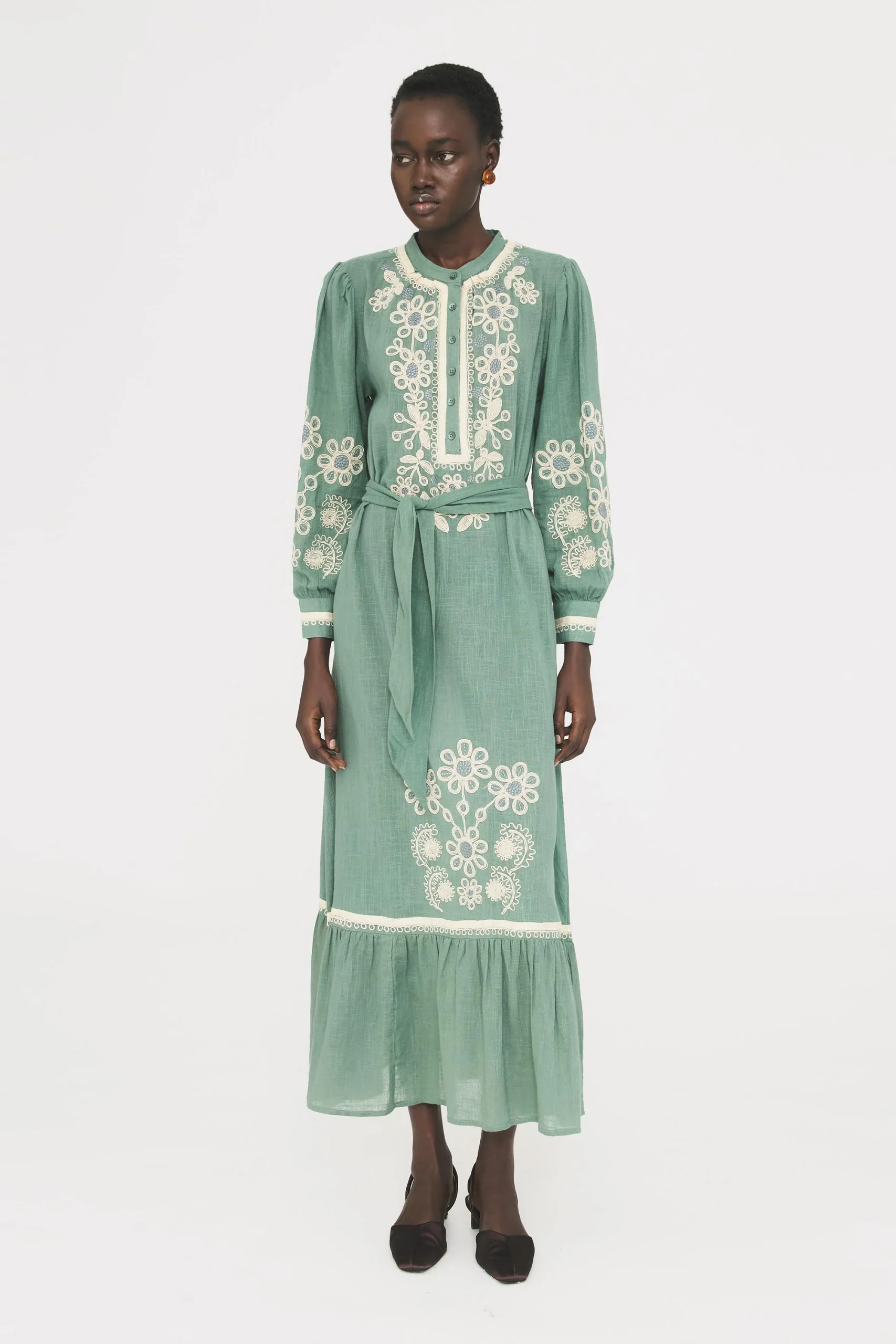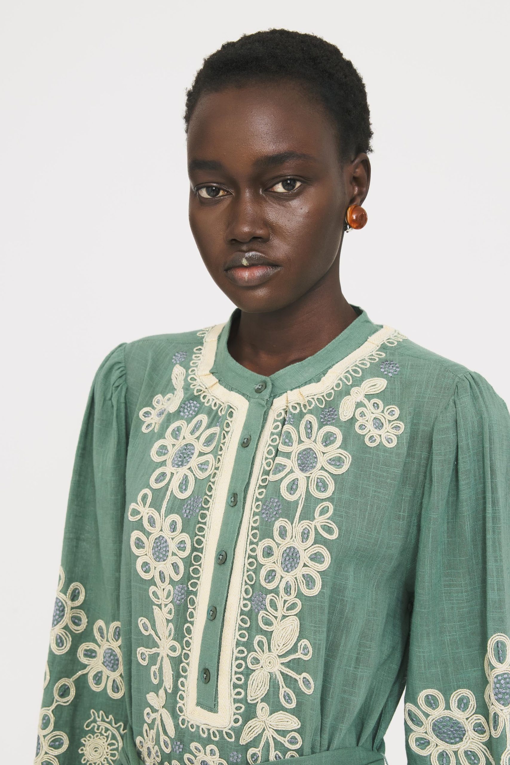 Robe longue brodée fils lurex artisanalement. Doublée. Osez la transparence – ou non – grâce au fond de robe fournie avec la pièce.