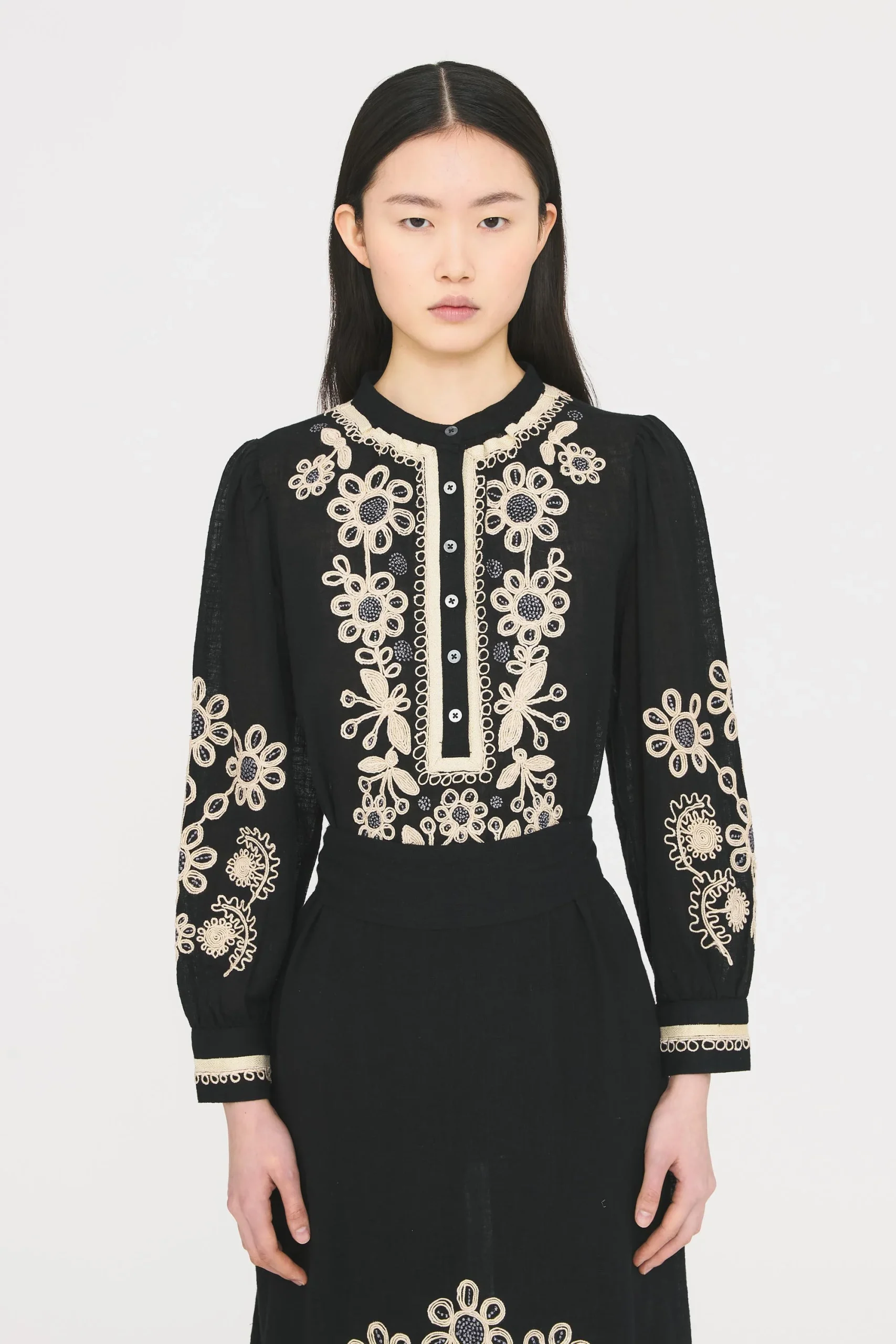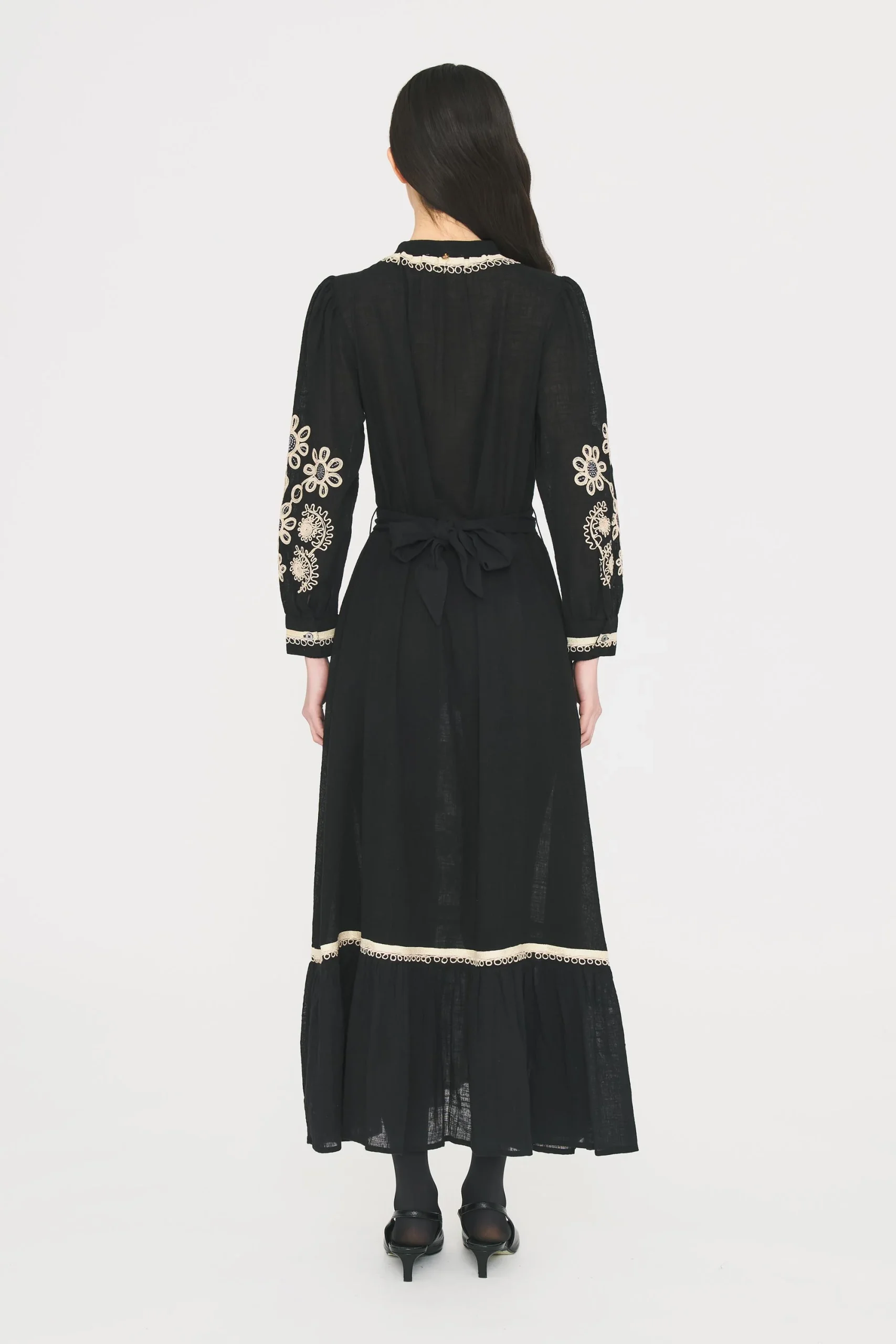 Robe longue brodée fils lurex artisanalement. Doublée. Osez la transparence – ou non – grâce au fond de robe fournie avec la pièce.