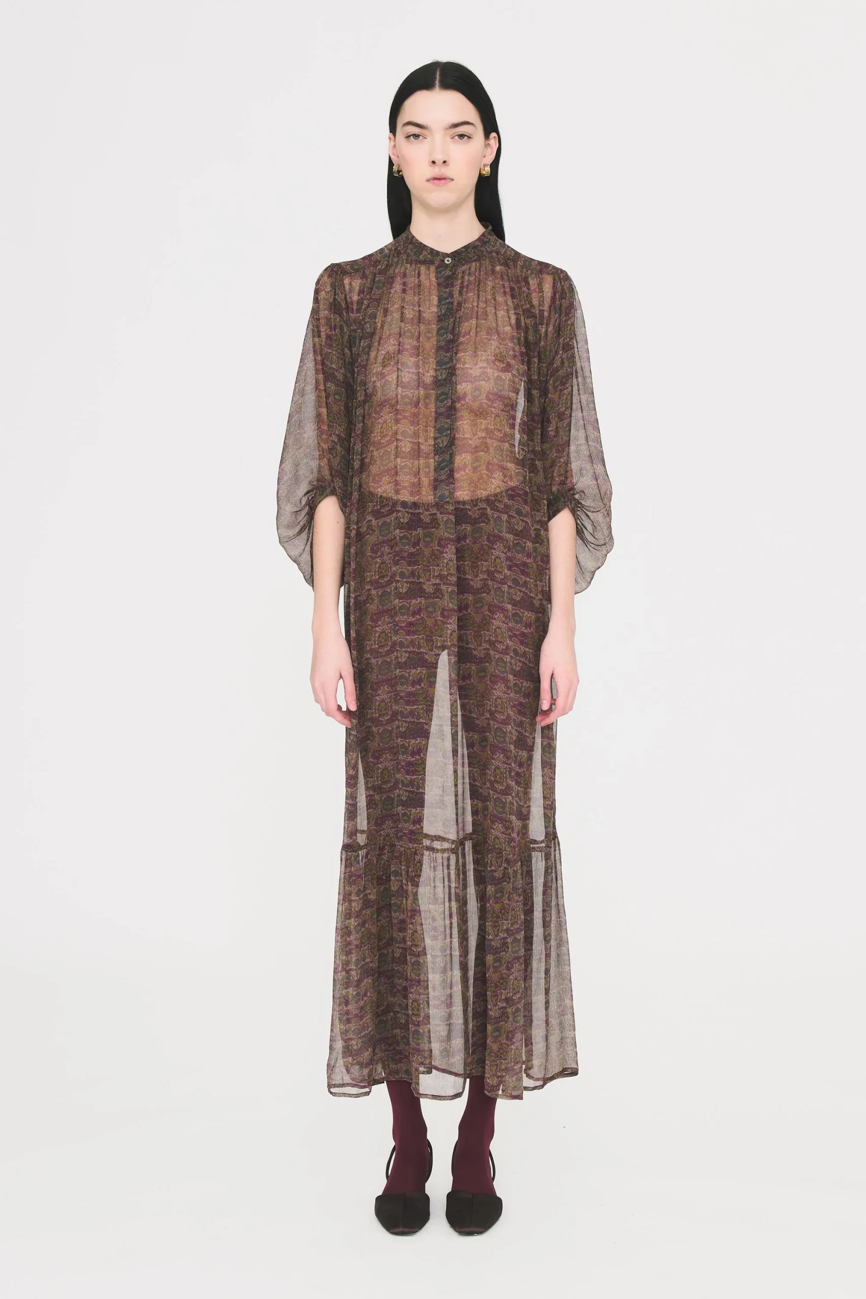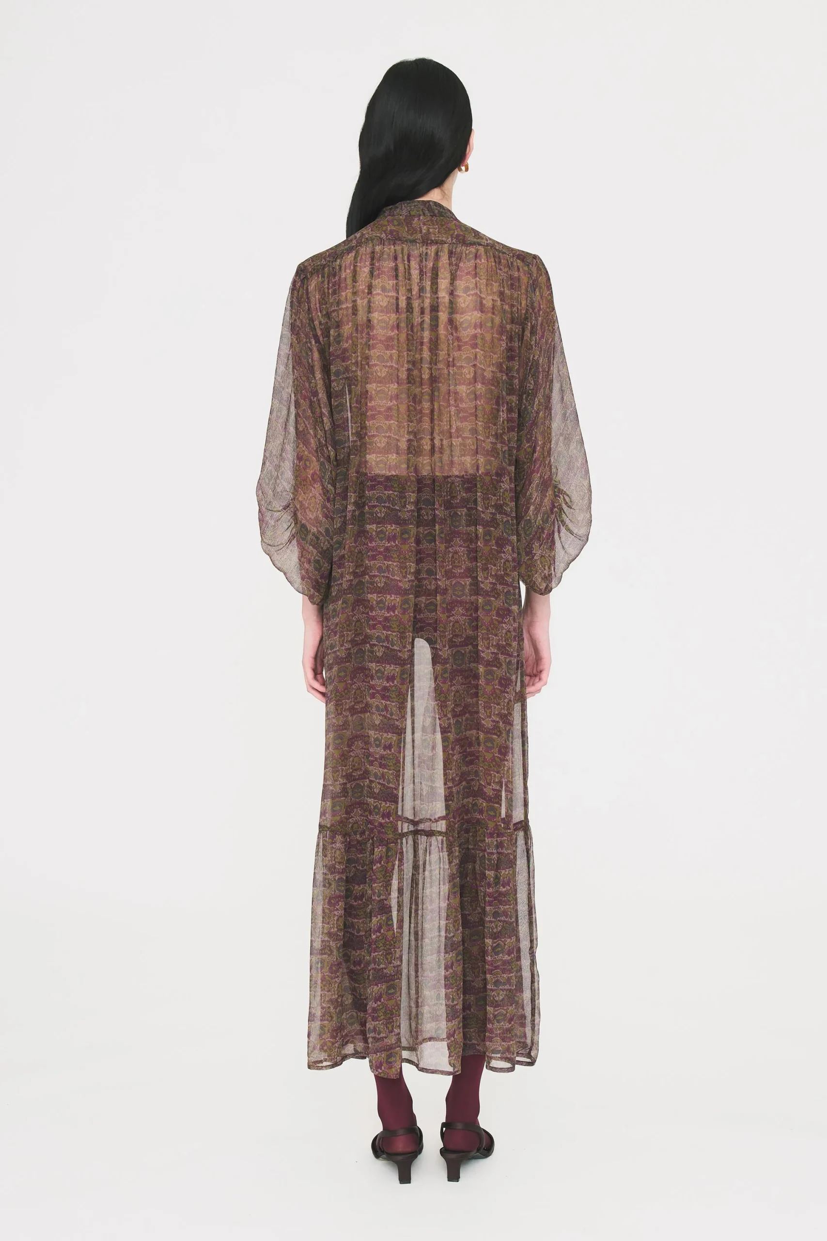 Robe longue en chiffon de soie imprimé. Broderie artisanale. Manches longues amples. Patte de boutonnage dissimulée. Osez la transparence – ou non – grâce au fond de robe fournie avec la pièce.