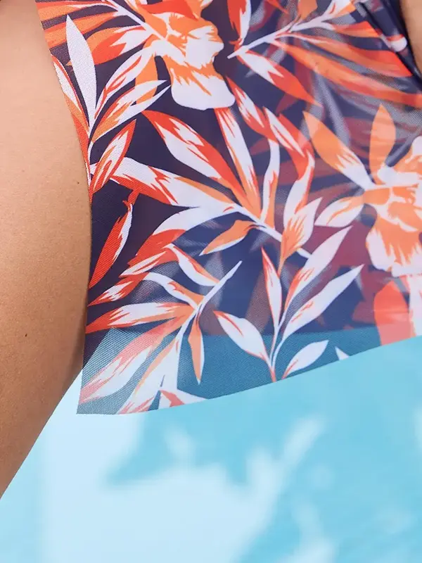 Son coloris de base bleu marine est rehaussé par un magnifique imprimé feuilles tropicales aux teintes vives et ensoleillées (orange, rouge, blanc), créant un contraste saisissant et un look résolument estival. La particularité de ce modèle réside dans sa jupe extérieure légère et fendue sur le devant, révélant avec subtilité la partie inférieure unie, pour un effet dynamique et aérien.