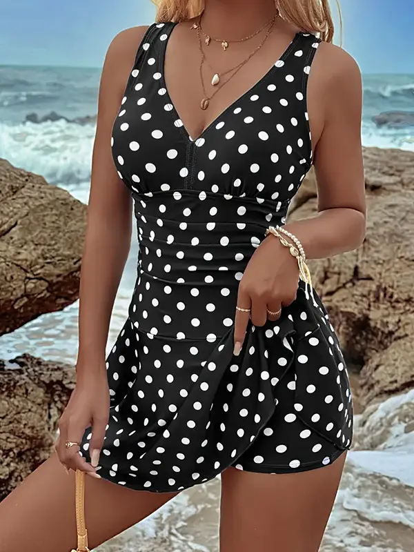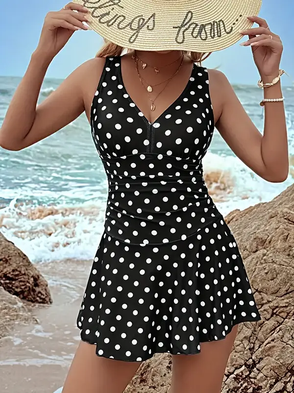 Son motif intemporel à pois blancs sur fond noir apporte une touche rétro. La coupe flatteuse avec un col en V met en valeur le décolleté, tandis que la jupe intégrée offre une couvrance idéale pour celles qui souhaitent dissimuler légèrement les hanches et les cuisses.
