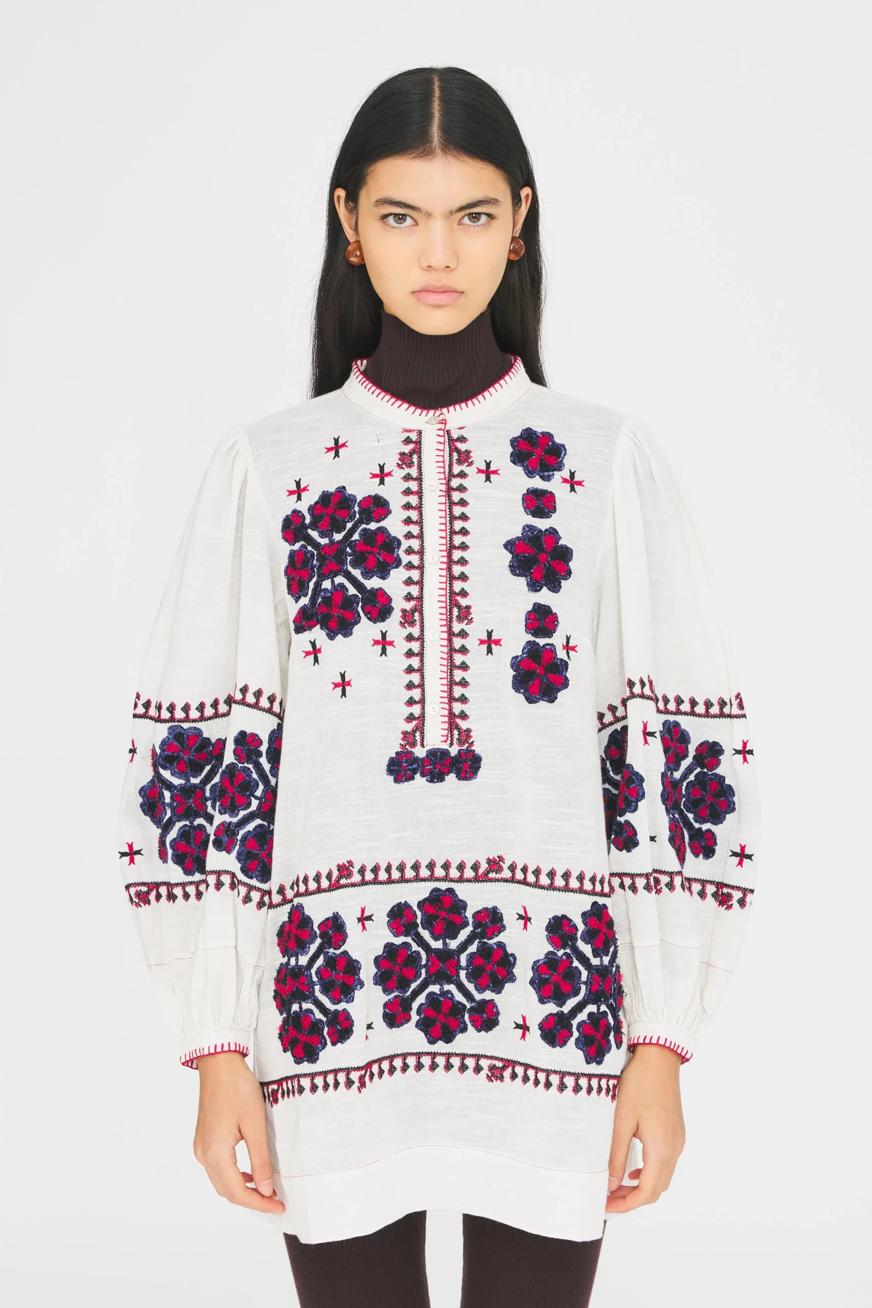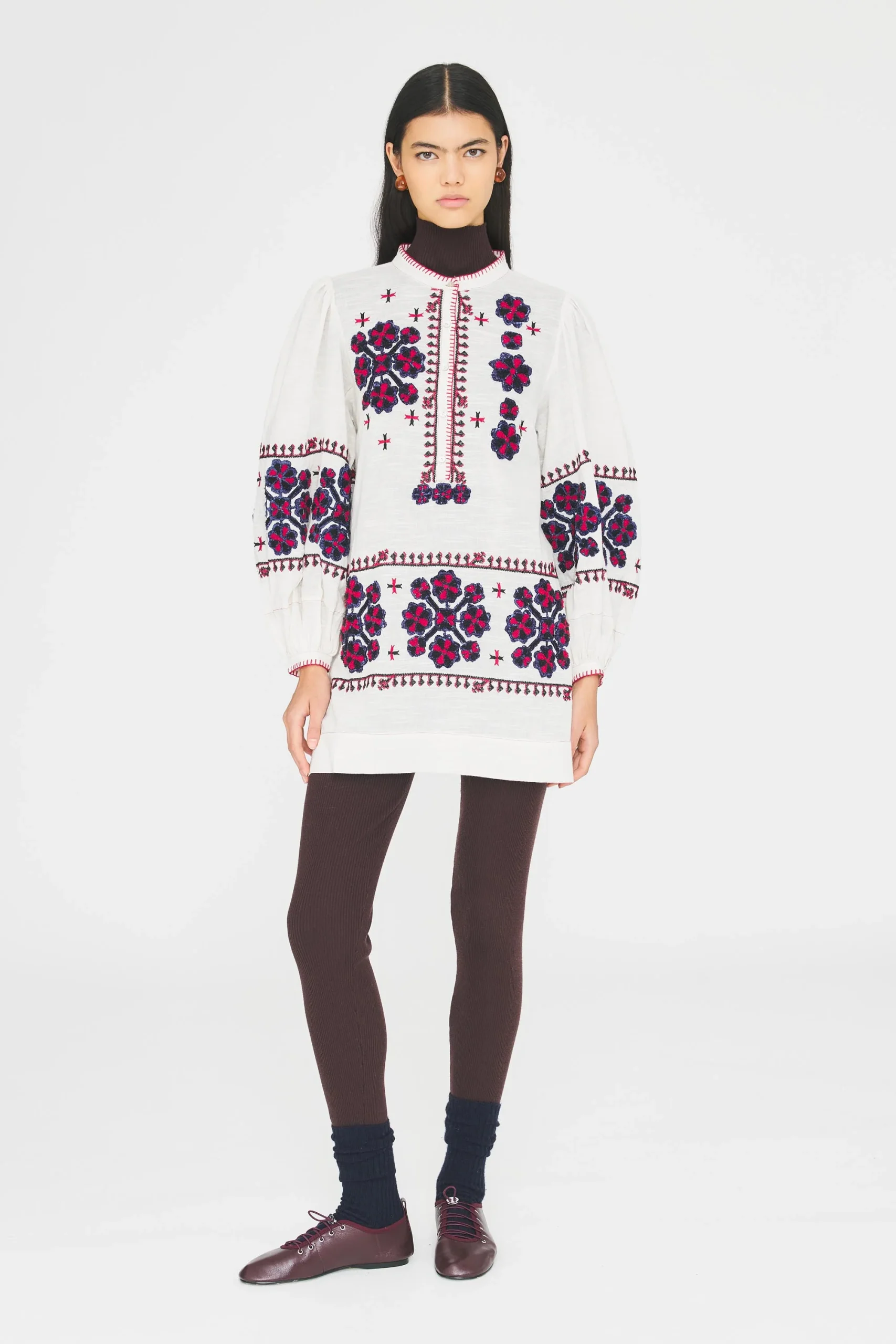 Robe en coton d’inspiration hongroise. Broderie chenille avec une texture douce et moelleuse sur le devant de la blouse et broderie main sur le col, les poignets et la patte de boutonnage. Osez la transparence – ou non – grâce au fond de robe fournie avec la pièce.