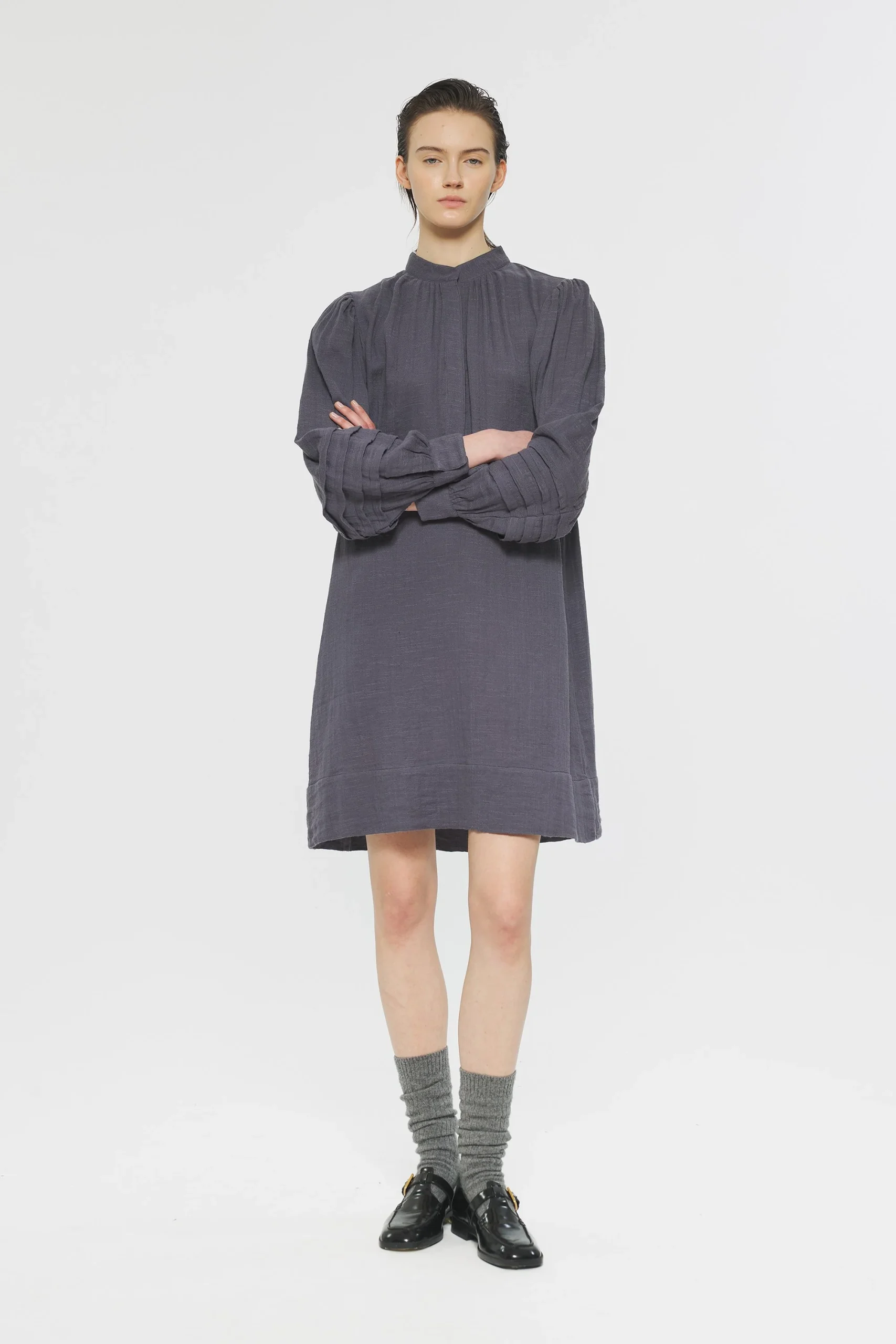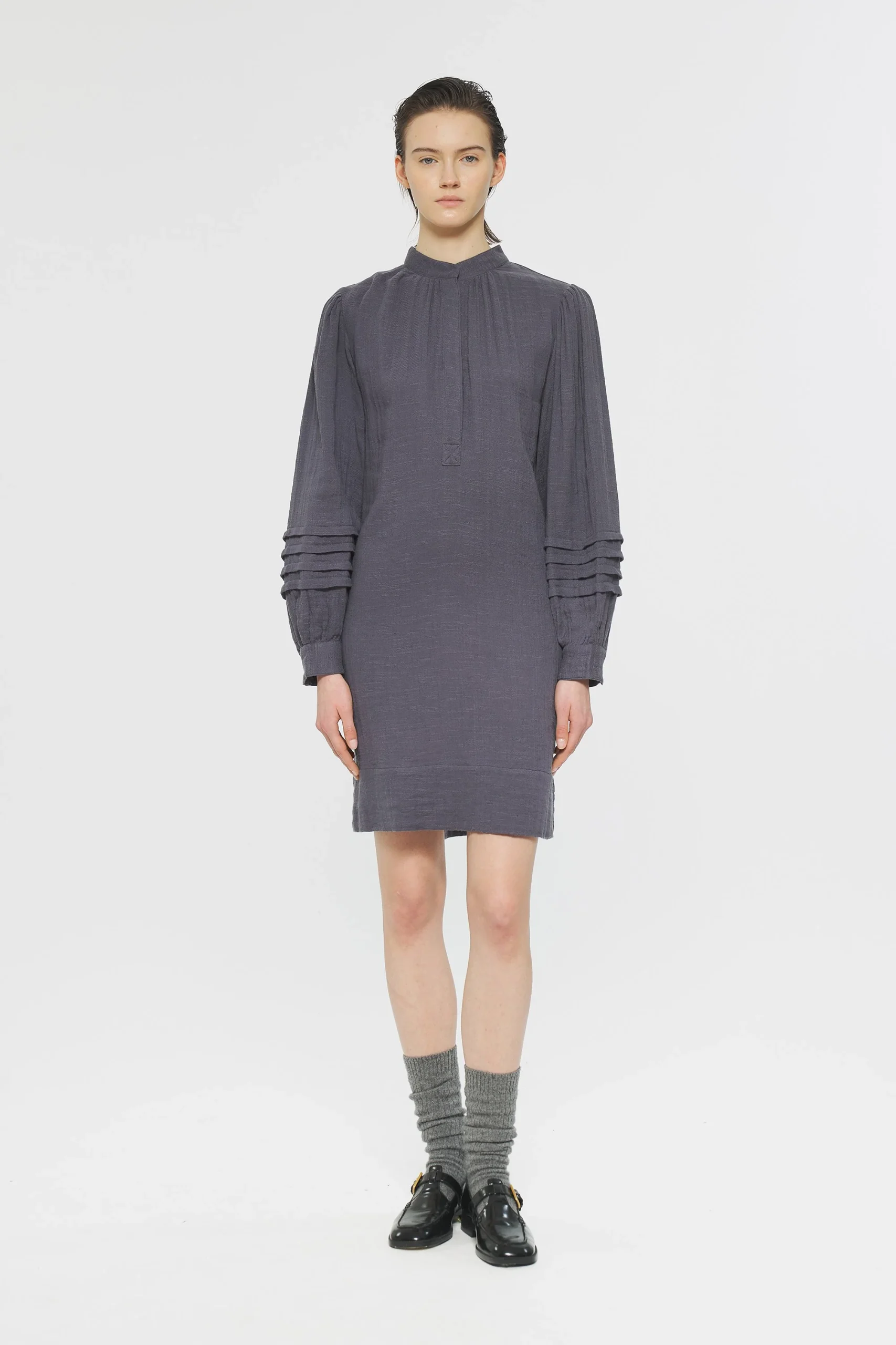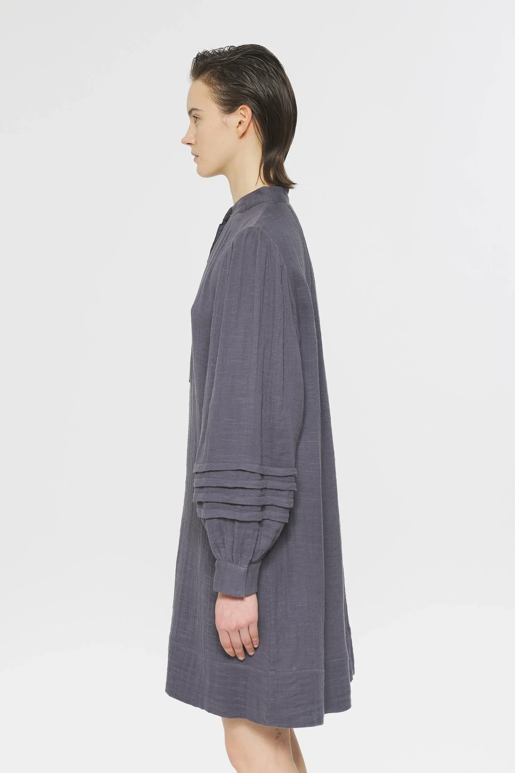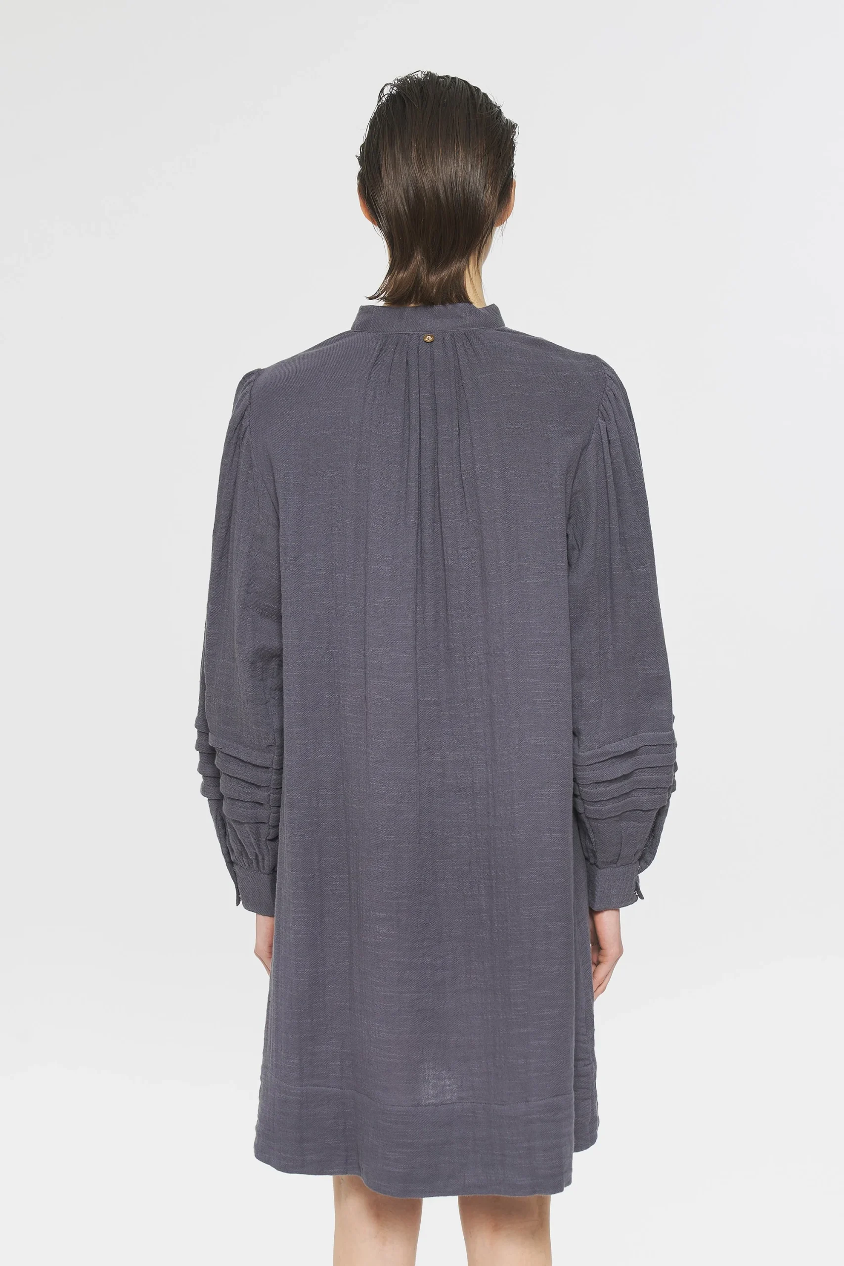 Robe courte en double gaze de coton. Col rond. Fronces aux épaules, au col et aux poignets. Manches ballon resserrées aux poignets par des boutons. Détails au bas des manches. Patte de boutonnage sur le devant. Boutons en nacre naturelle.