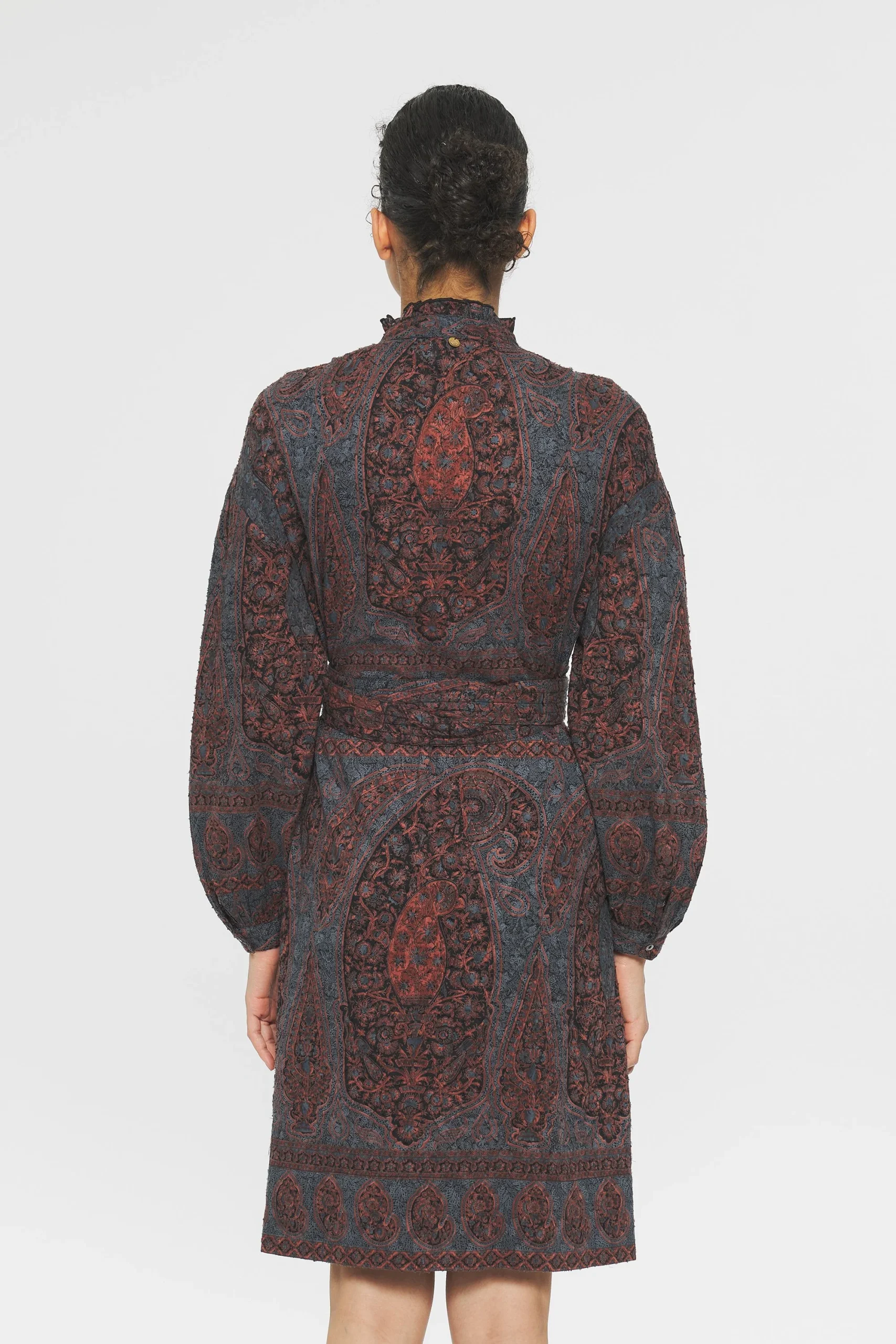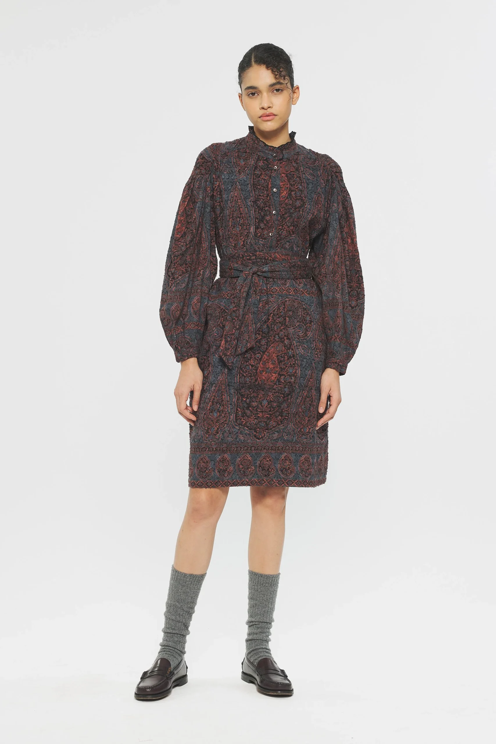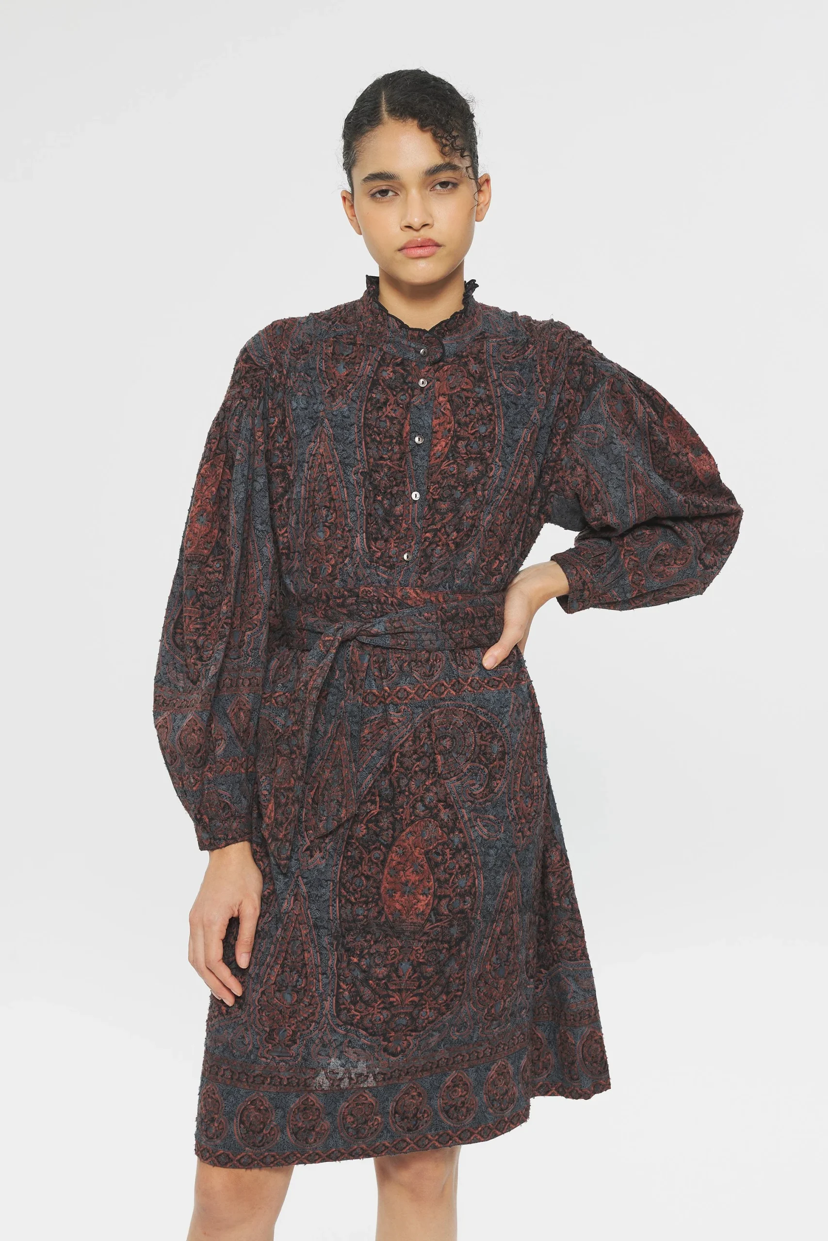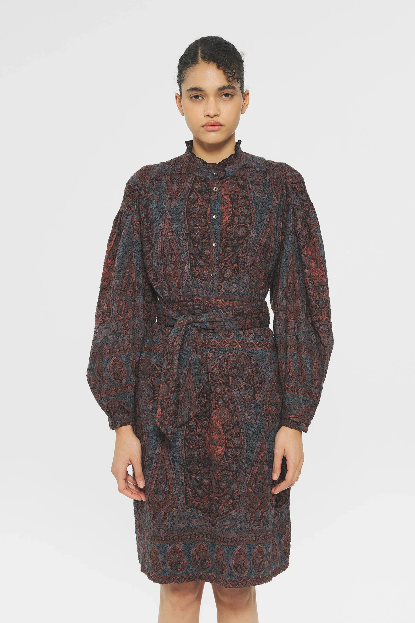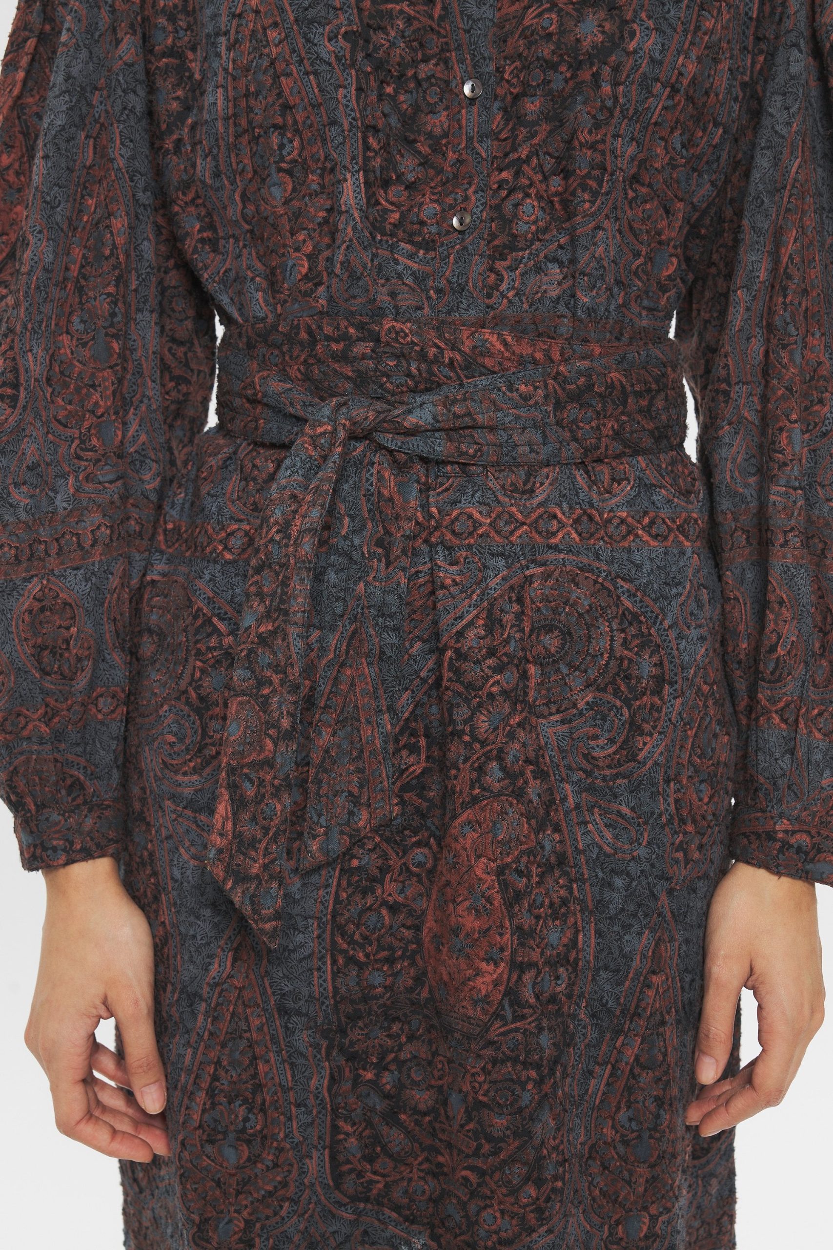 Robe mi-longue en jacquard de coton imprimé. Imprimé dessiné dans notre atelier parisien puis appliqué à la main sur le tissu selon la technique du block print (savoir-faire artisanal indien). Col froncé et montant. Froncés aux épaules et sur l’avant des manches. Patte de boutonnage sur l’avant. Fermée aux poignets par un bouton. Boutons en nacre. Ceinture amovible quiltée.