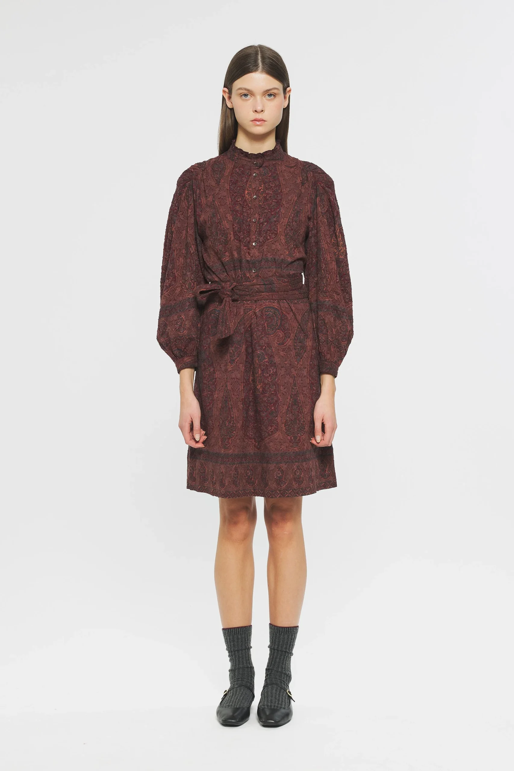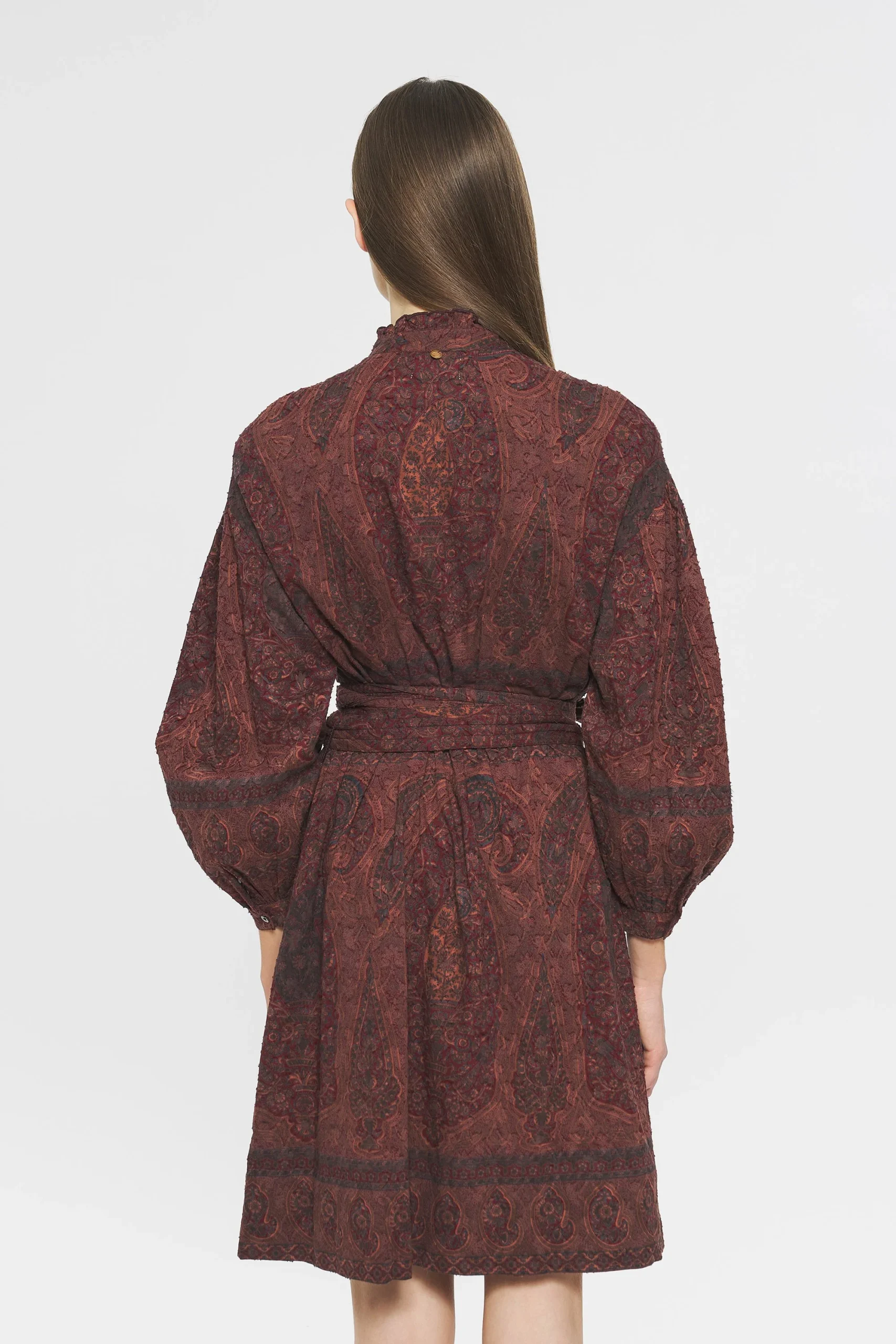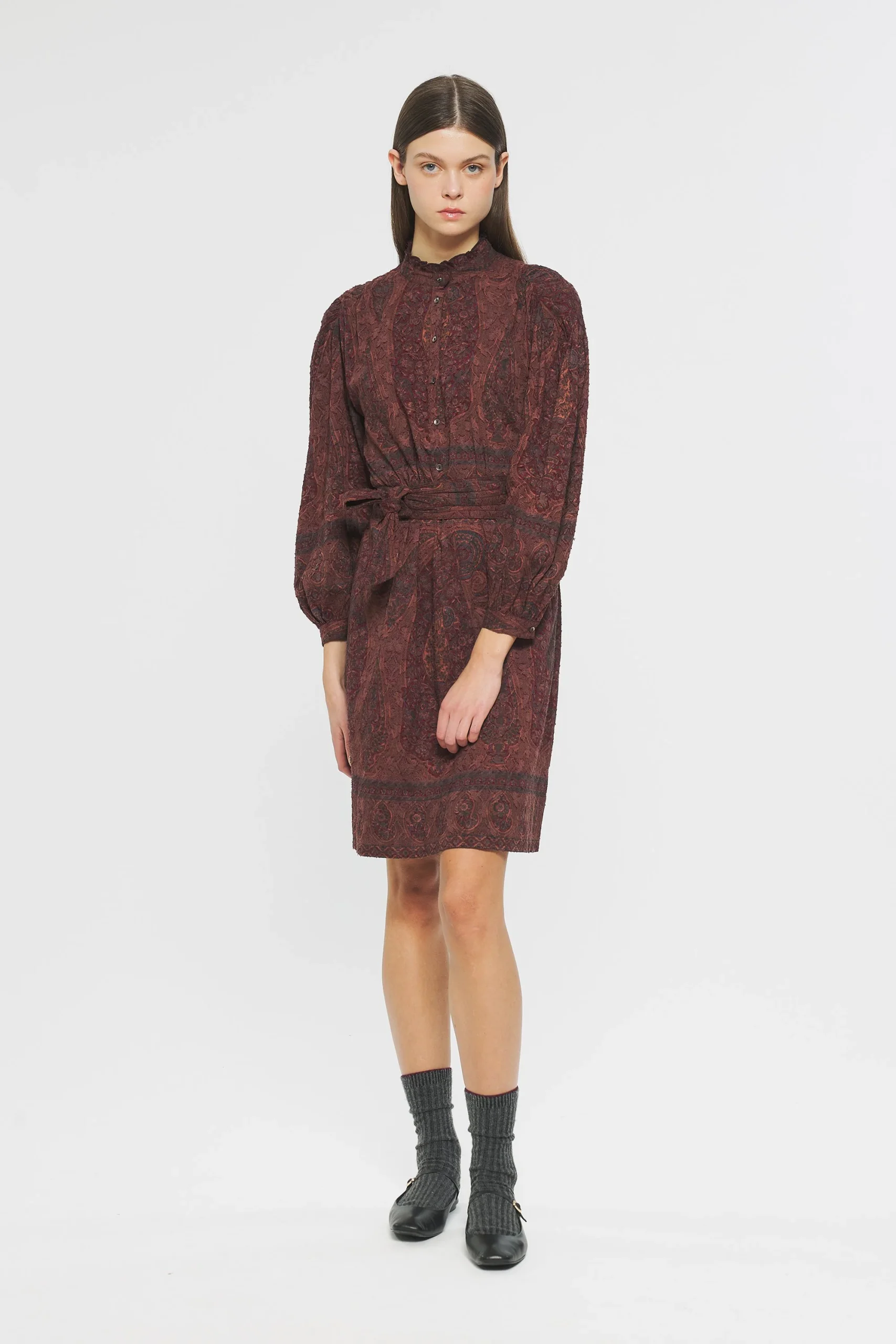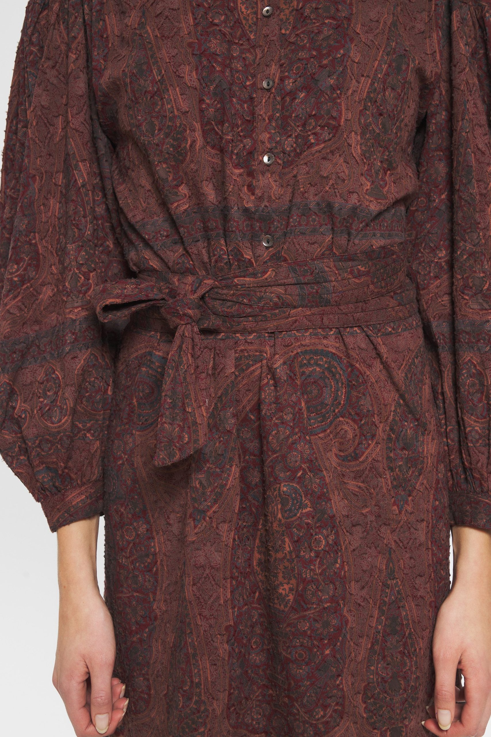 Robe mi-longue en jacquard de coton imprimé. Imprimé dessiné dans notre atelier parisien puis appliqué à la main sur le tissu selon la technique du block print (savoir-faire artisanal indien). Col froncé et montant. Froncés aux épaules et sur l’avant des manches. Patte de boutonnage sur l’avant. Fermée aux poignets par un bouton. Boutons en nacre. Ceinture amovible quiltée.
