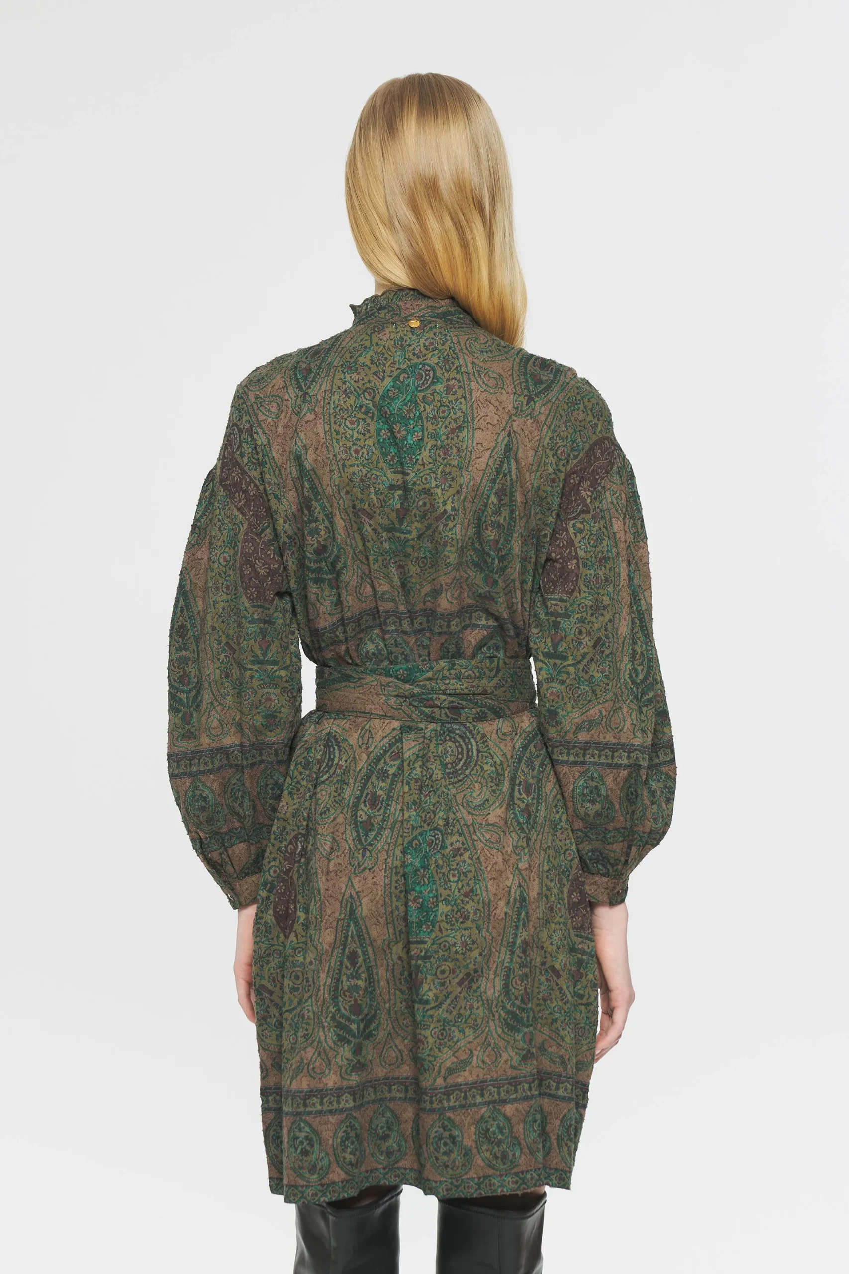 Robe mi-longue en jacquard de coton imprimé. Imprimé dessiné dans notre atelier parisien puis appliqué à la main sur le tissu selon la technique du block print (savoir-faire artisanal indien). Col froncé et montant. Froncés aux épaules et sur l’avant des manches. Patte de boutonnage sur l’avant. Fermée aux poignets par un bouton. Boutons en nacre. Ceinture amovible quiltée.