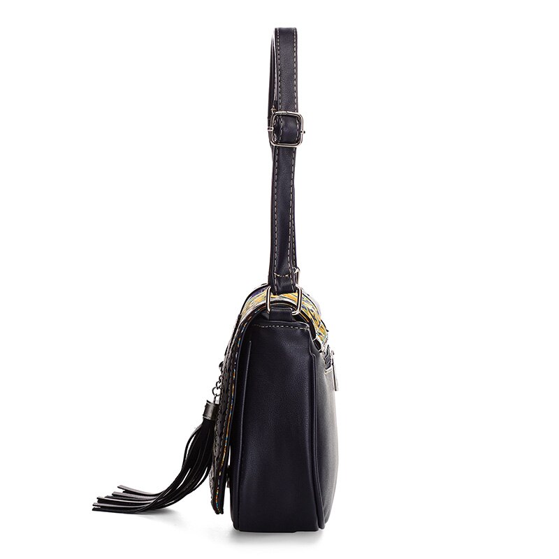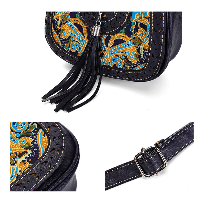 Ce Sac bandoulière Bohème est fabriqué avec du similicuir de haute qualité, entièrement vegan. L’imprimé fleuri, les découpes du cuir ainsi que le pompon font tout le charme de ce sac à main. Ce magnifique rabat au style boho se ferme à l’aide d’un bouton aimanté