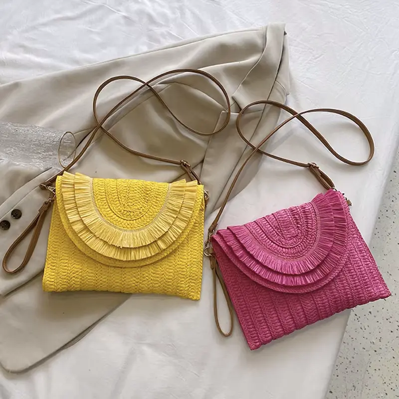Cet été, adoptez le style bohème en portant notre sac pochette paille franges bohème jaune. Son rabat orné de franges élégantes et son coloris apportent une note fraîche et estivale à votre tenue. Ce petit sac paille est fabriqué artisanalement avec du rotin naturel.