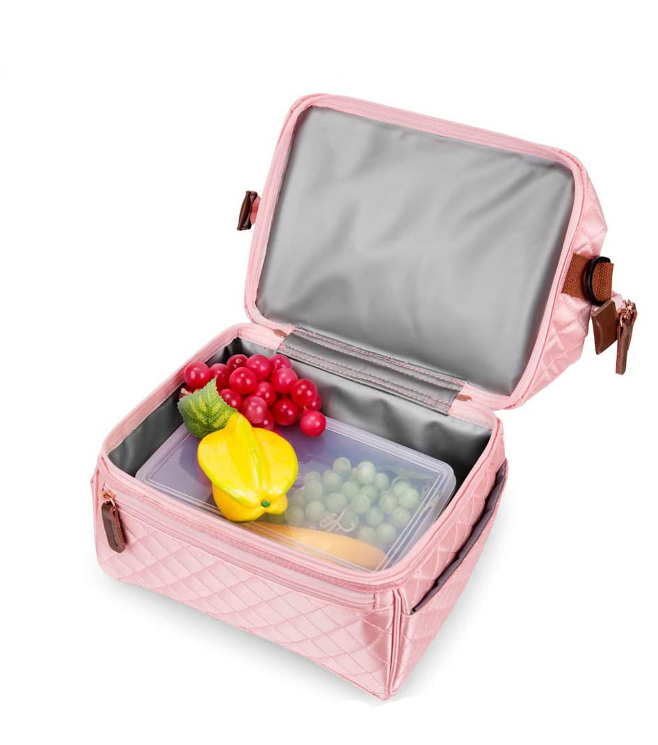 [/vc_column_text][vc_column_text]C’est son design matelassé et légèrement brillant que vous aimez toutes et qui le rend si élégant ! Gardez une touche de féminité jusque dans votre lunch bag : il est adapté aux femmes, adolescentes et même aux enfants. Il peut être utilisé comme sac isotherme, sac à pique-nique, sac à bento, sac divers ou sac à provisions. Girl Power ![/vc_column_text][vc_empty_space height= »12px »][vc_column_text]Conception écologique et matériaux durables : le Sac isotherme repas a été conçu dans l’optique de la préservation de la nature et de l’environnement avec l’utilisation de film d’aluminium comme isolant. Conçu en polyester, il est ultra résistant et indéchirable.