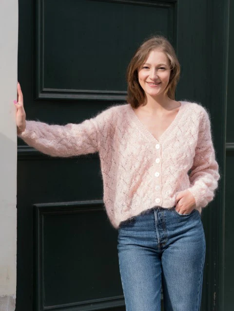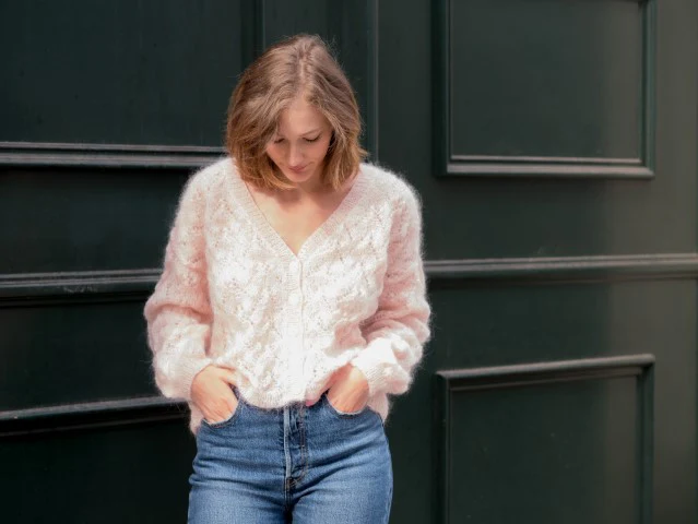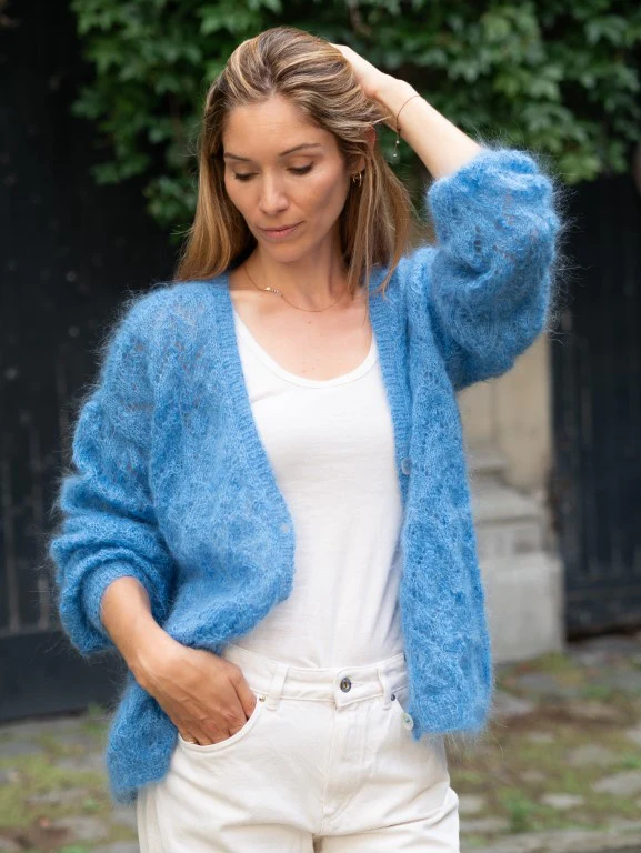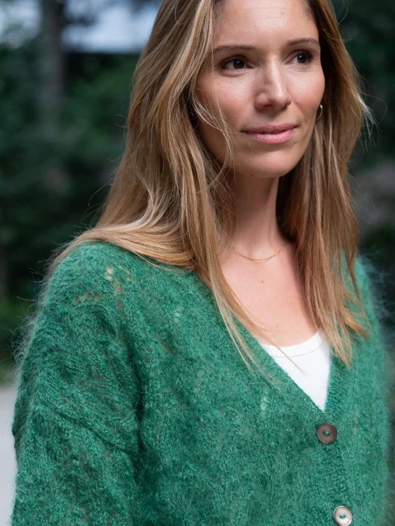 On adore sa forme oversize, son « V » profond et sa maille ajourée !