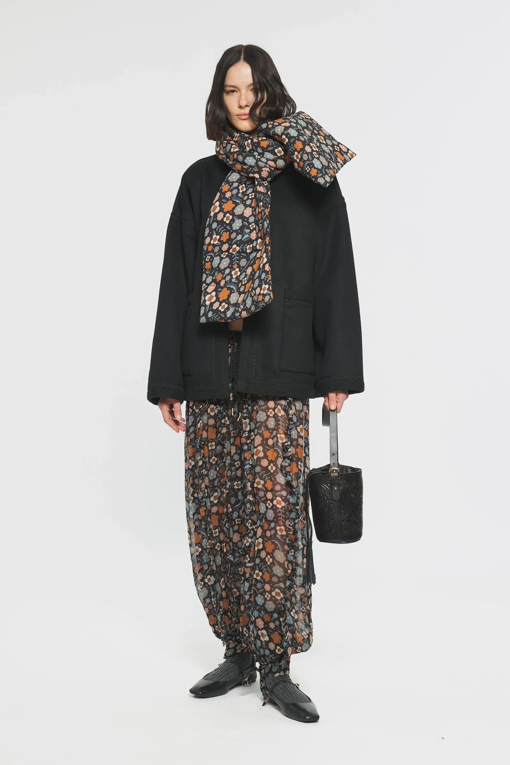 Sarouel en viscose imprimé. Resserré aux chevilles par des liens.