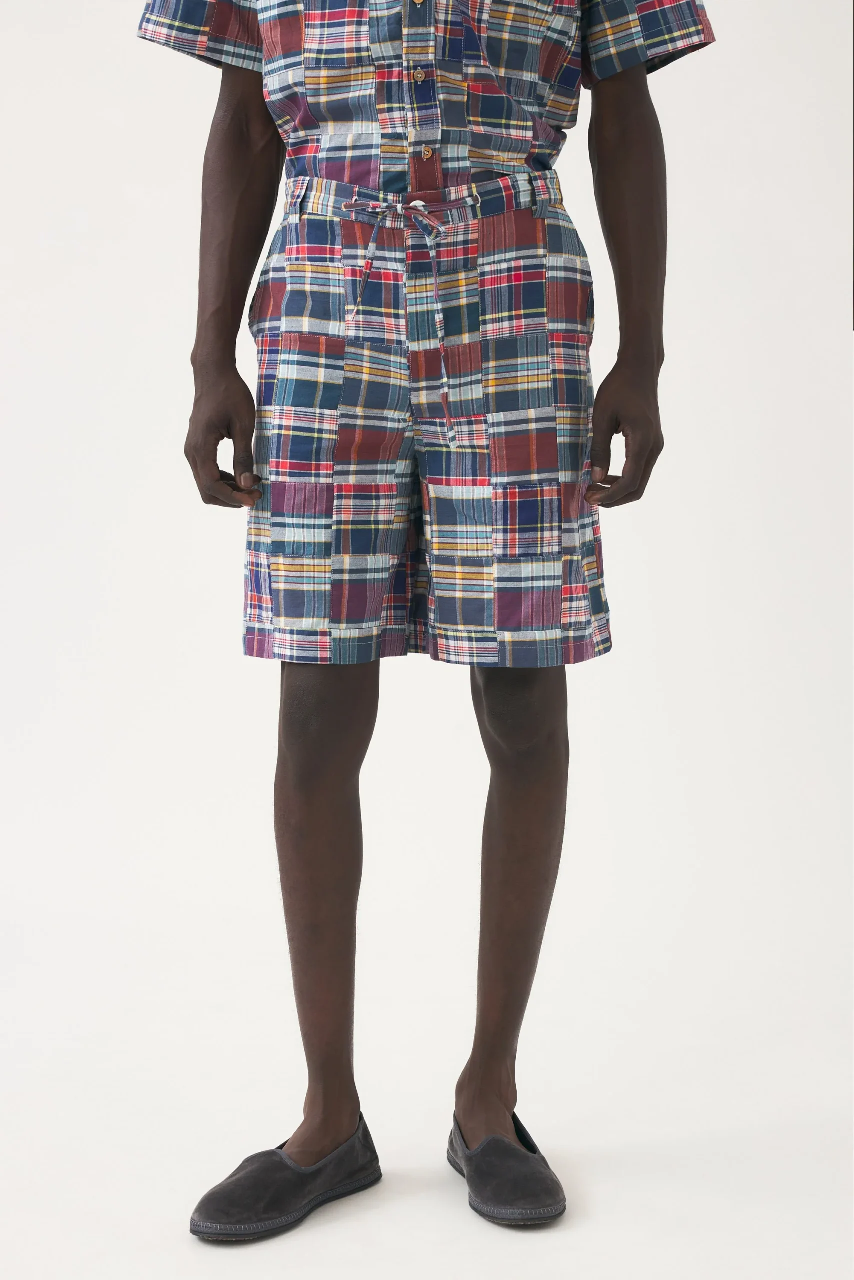 Short imprimé en voile de coton. Deux poches latérales. Ceinture en cordon insérée à l’aide de deux oeillets inspiration bateau.