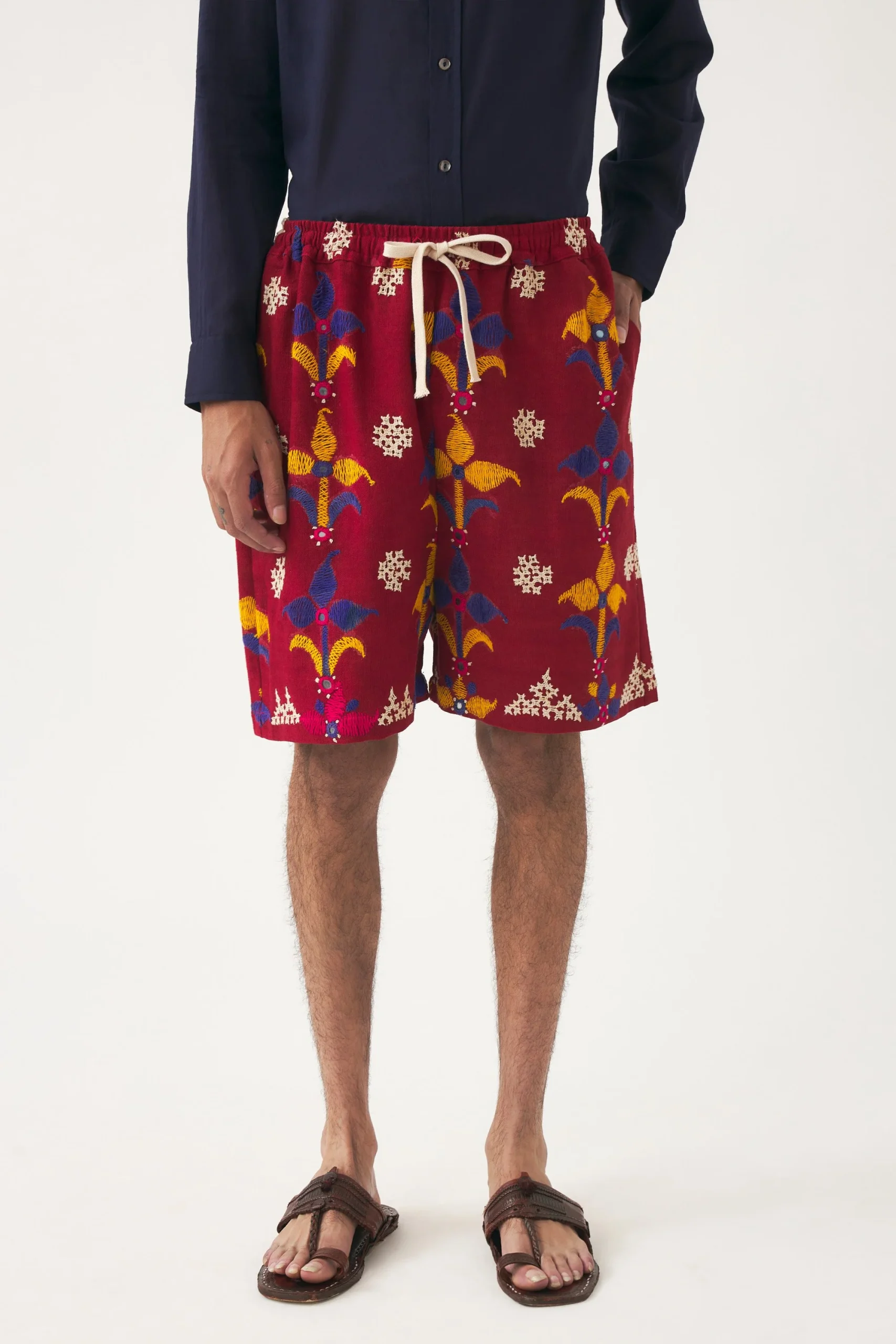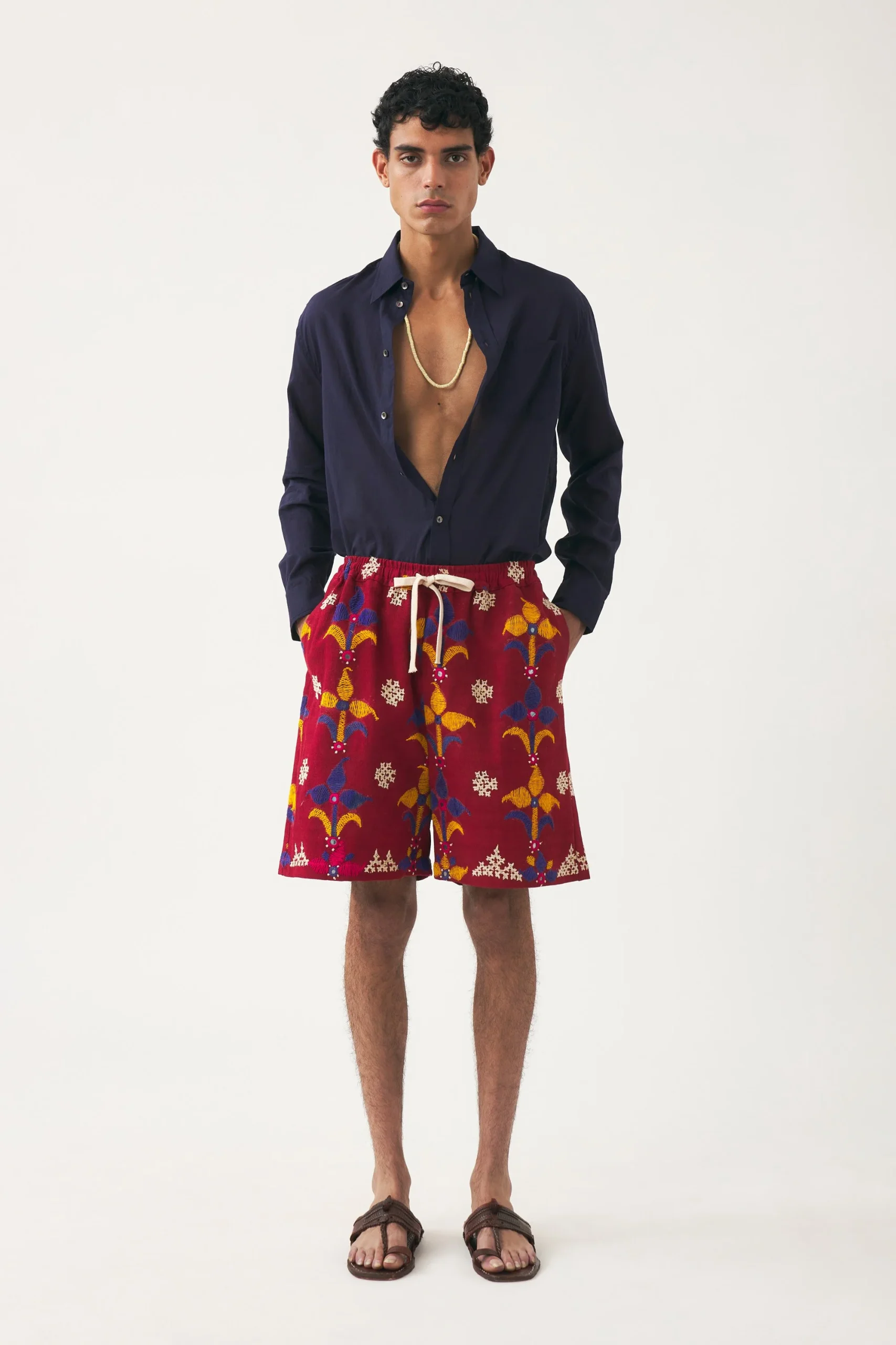 Short imprimé en toile de coton. Ceinture en cordon insérée à l’aide de deux oeillets inspiration bateau.