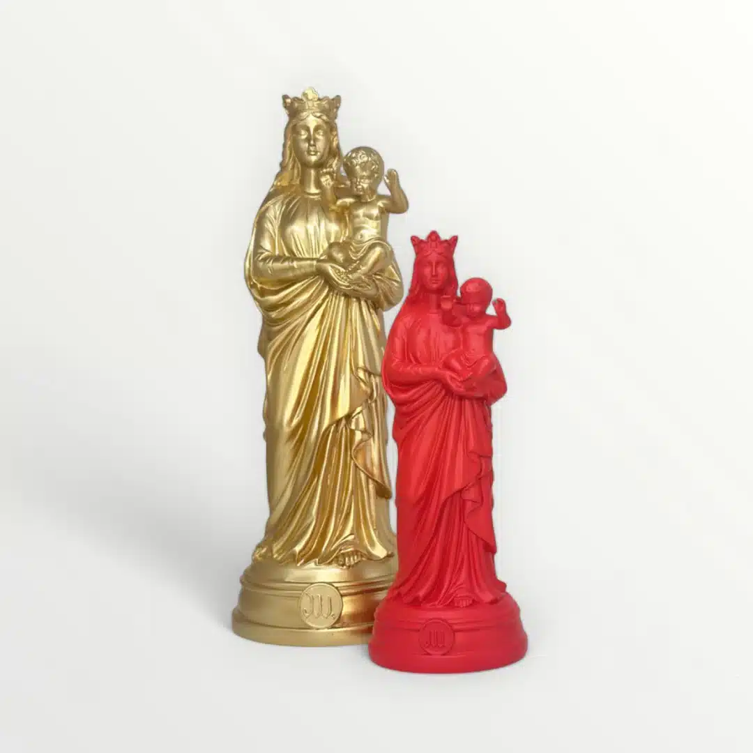 Voici la statuette de la Vierge à l’Enfant, celle qui surplombe la basilique Notre-Dame de la Garde. La Bonne Mère, comme l’appellent affectueusement les Marseillais est ici une reproduction des plus fidèles, moulée en résine et couverte de couleur.