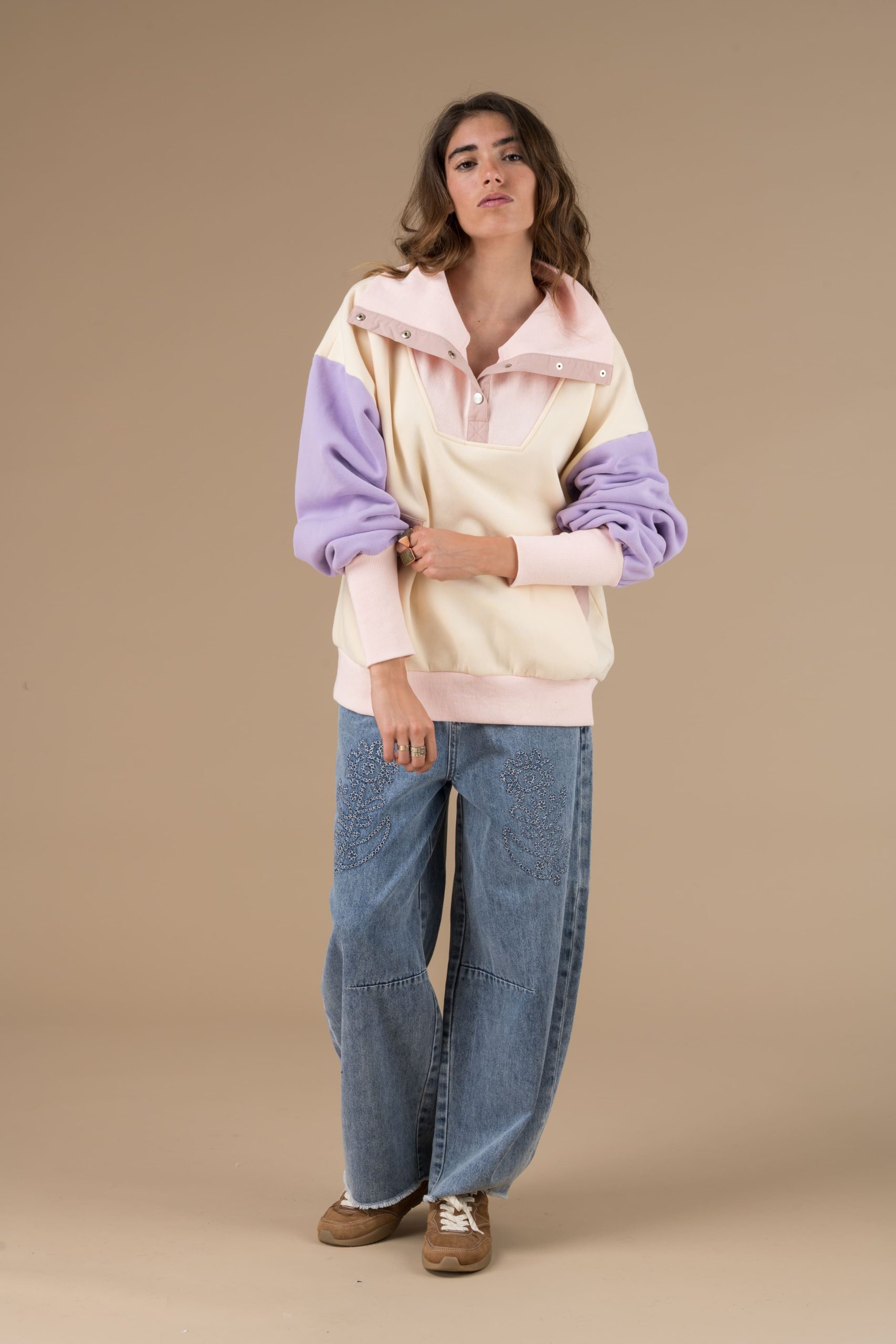 Sweat Irene Vanille manches longues à patchwork de tissus violet et roses, poches et bordure en vieux rose. Un vêtement idéal pour la demi-saison.