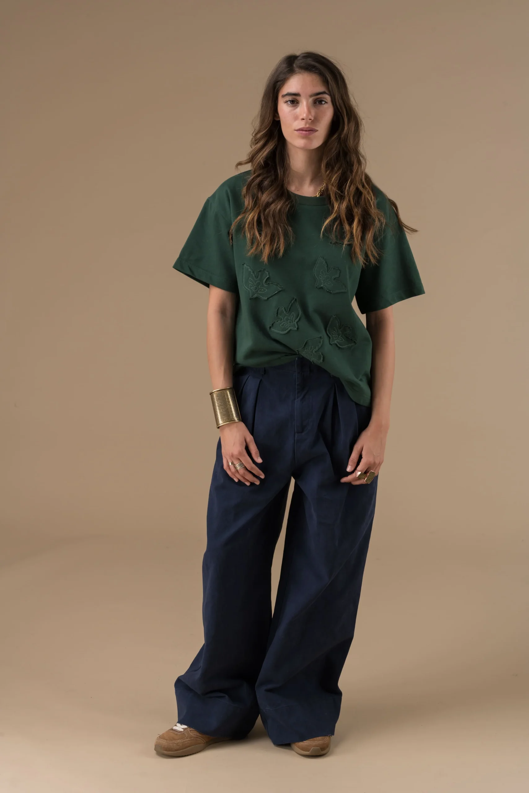 Ce t-shirt se distingue par des détails qui le rendent unique et plein de sens. Des oiseaux sont brodés sur le devant du vêtement, créant un motif délicat et poétique, qui évoque la nature et l’évasion. Ces broderies, réalisées avec soin, font de ce t-shirt une pièce d’exception, à la fois moderne et bohème.