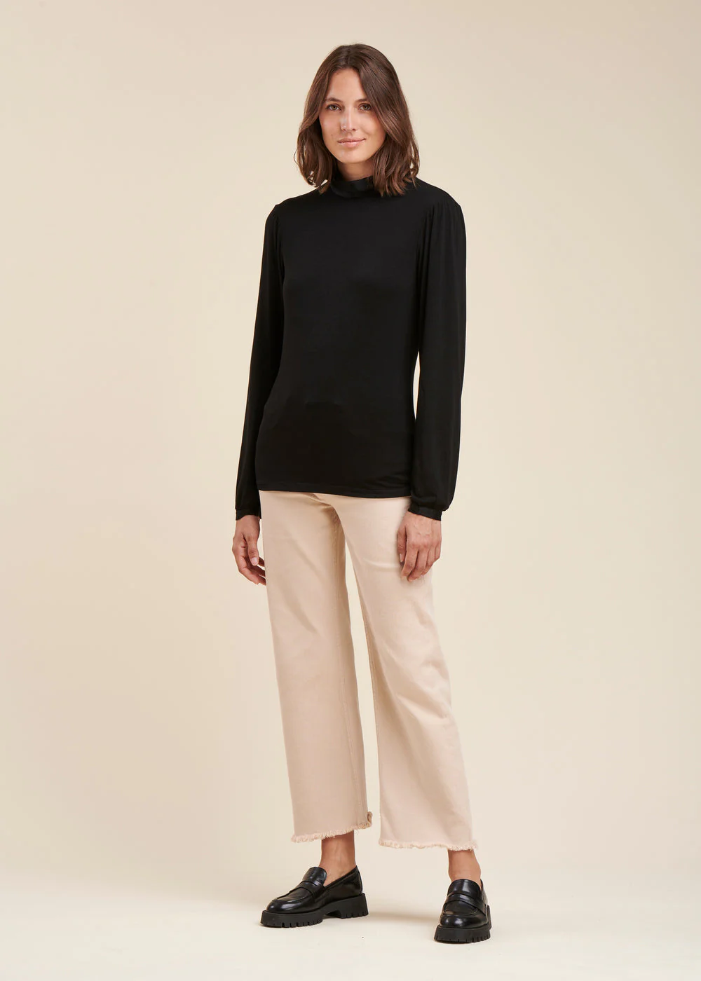 Tee-shirt bi-matière, corps et manches en jersey, col montant en tissu avec un lien à nouer dans le dos ou sur le devant, poignet avec un petit bouton.