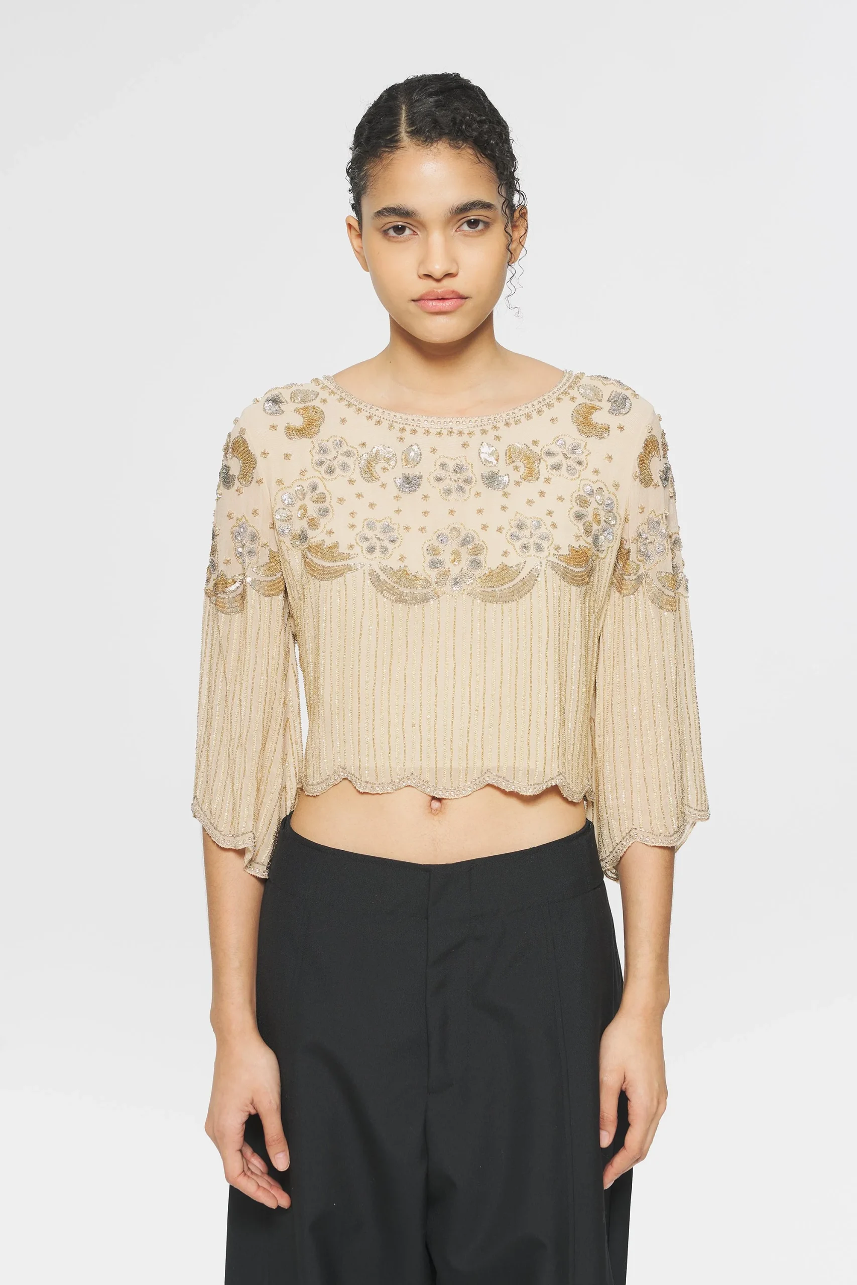 Top en viscose. Broderies en perles sur le devant, le dos et les manches. Entièrement brodée à la main. Doublure en viscose. Manches 3/4.