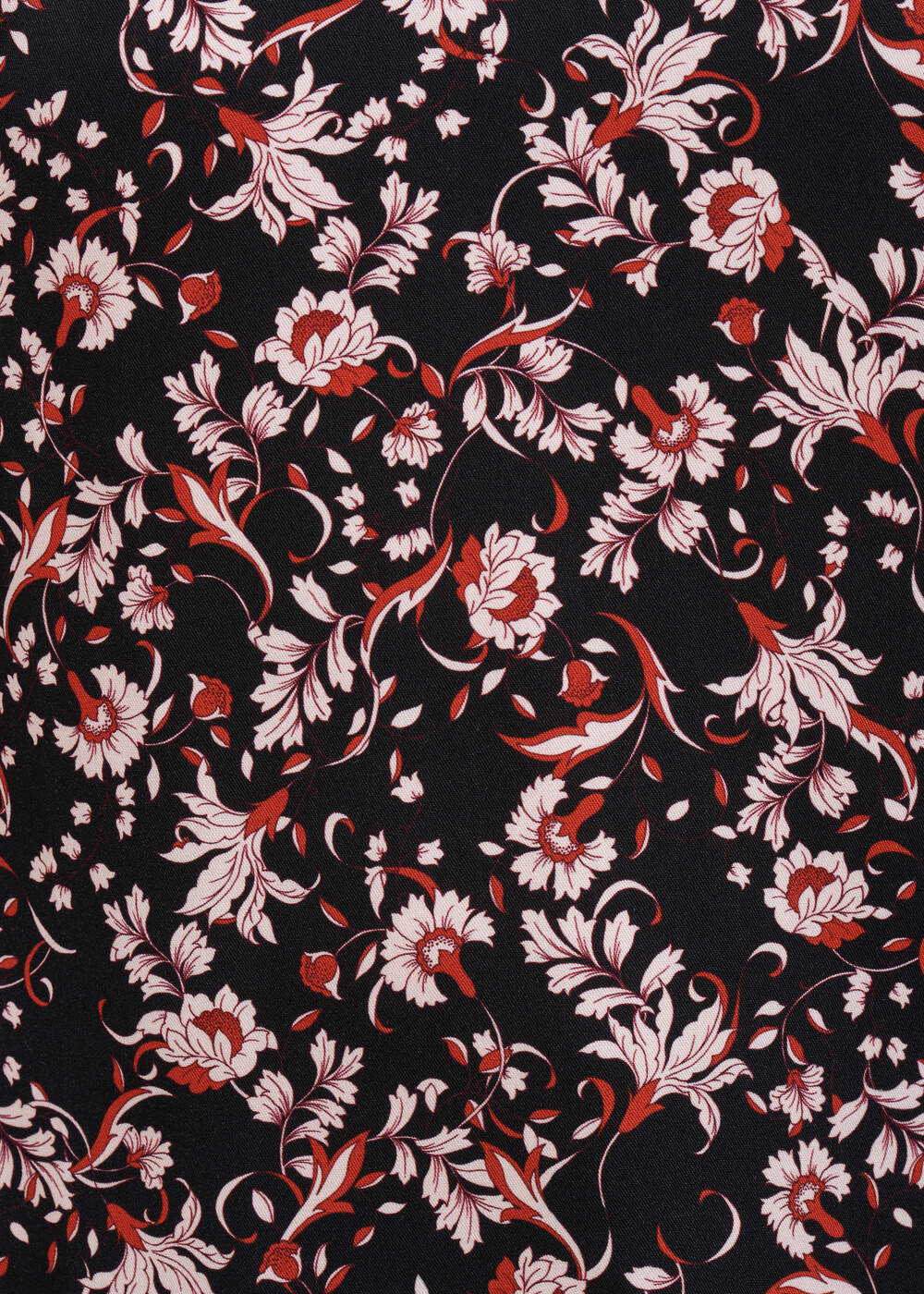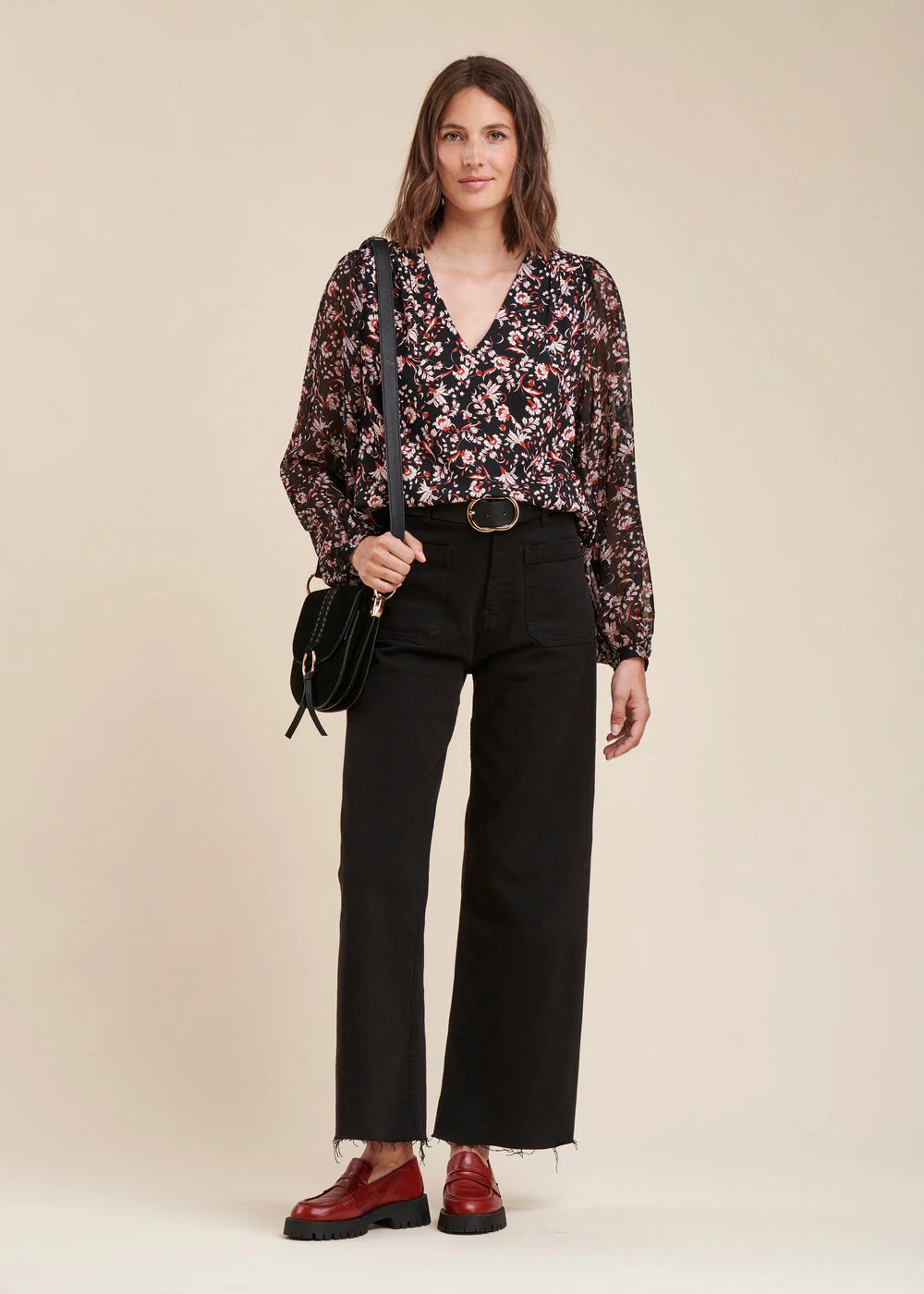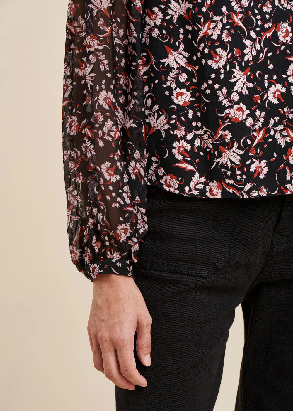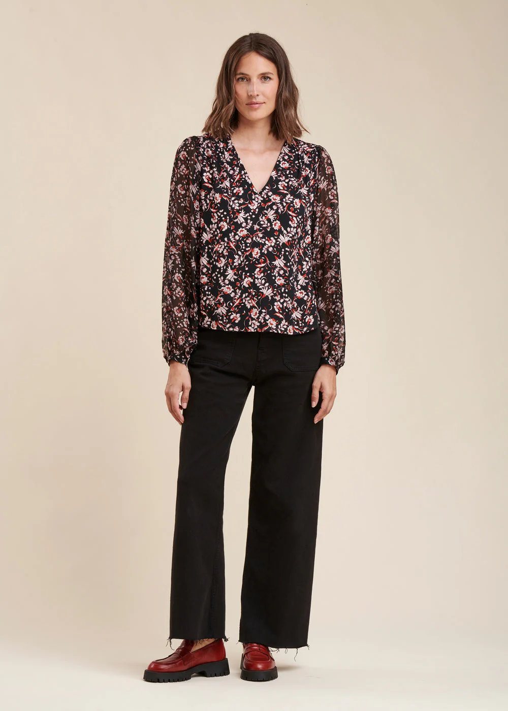 Top bi-matière à imprimé fleuri, encolure V, manches longues et amples en voile de viscose soie avec bracelets boutonnés, découpes épaules avec fronces, découpe dos avec fronces.