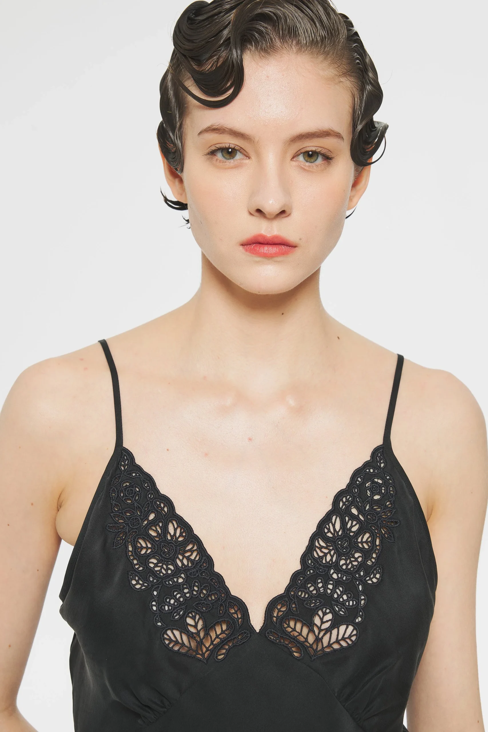 Top en tencel. Broderies sur le devant ajourées et faites artisanalement. Top à bretelles.