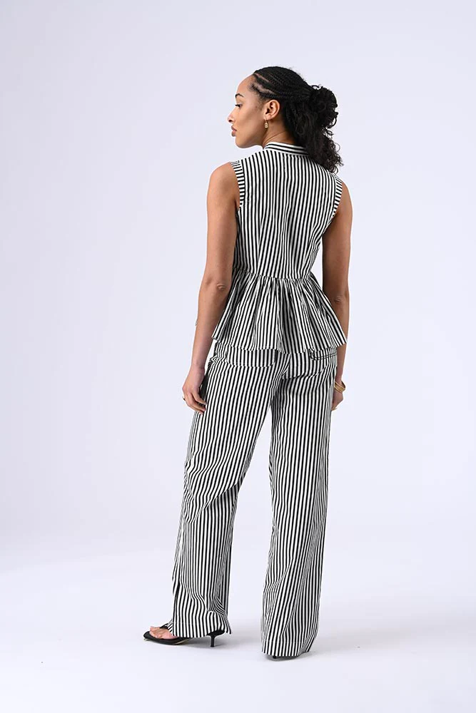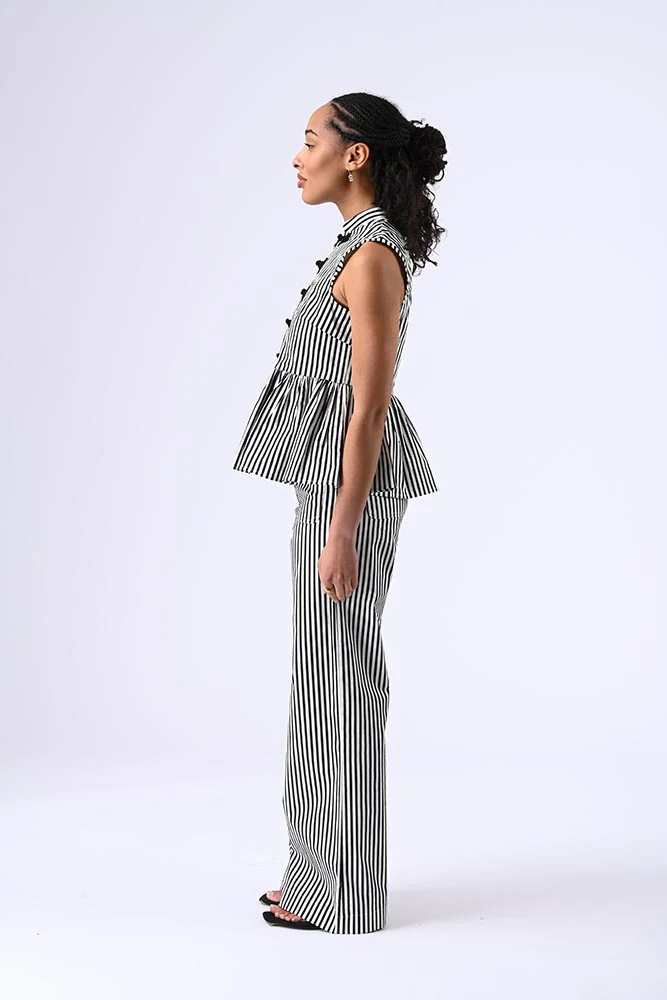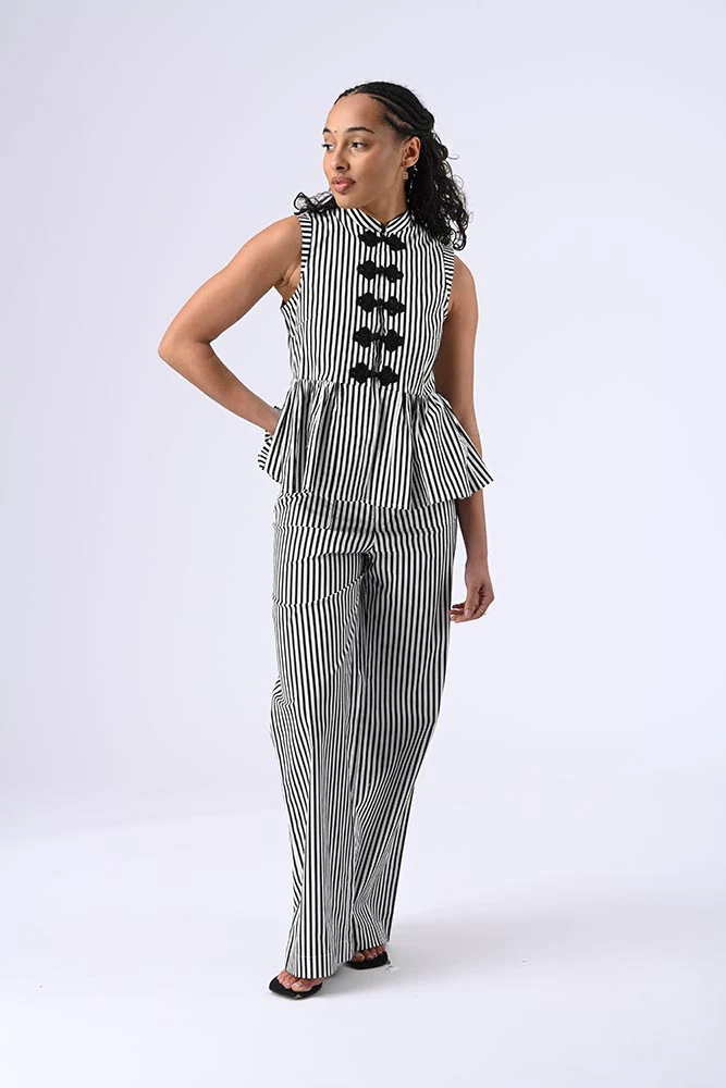 Top sans manches à rayures blanc et noir, col montant et forme péplum, orné de boutons au détail délicat. Couleur noir